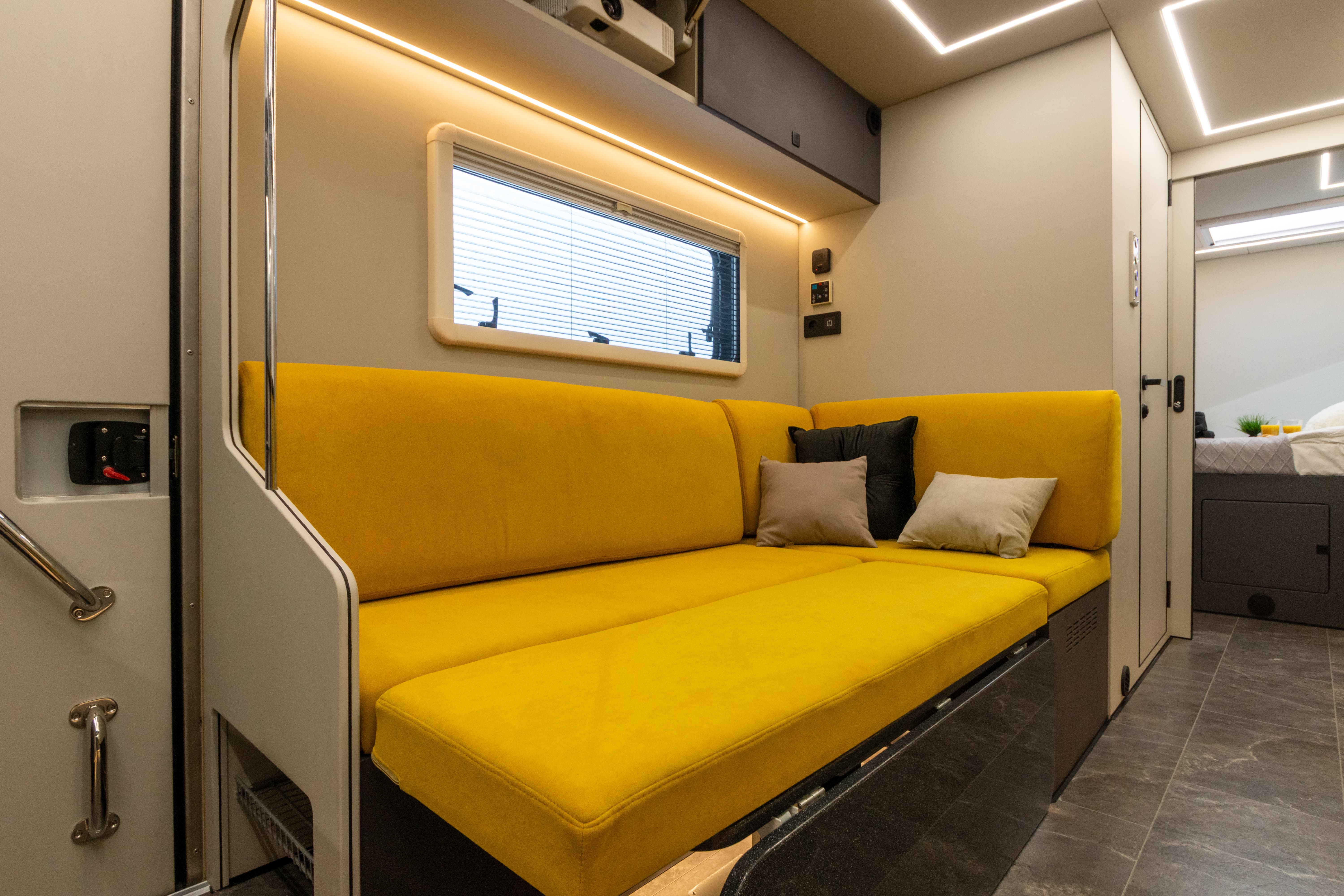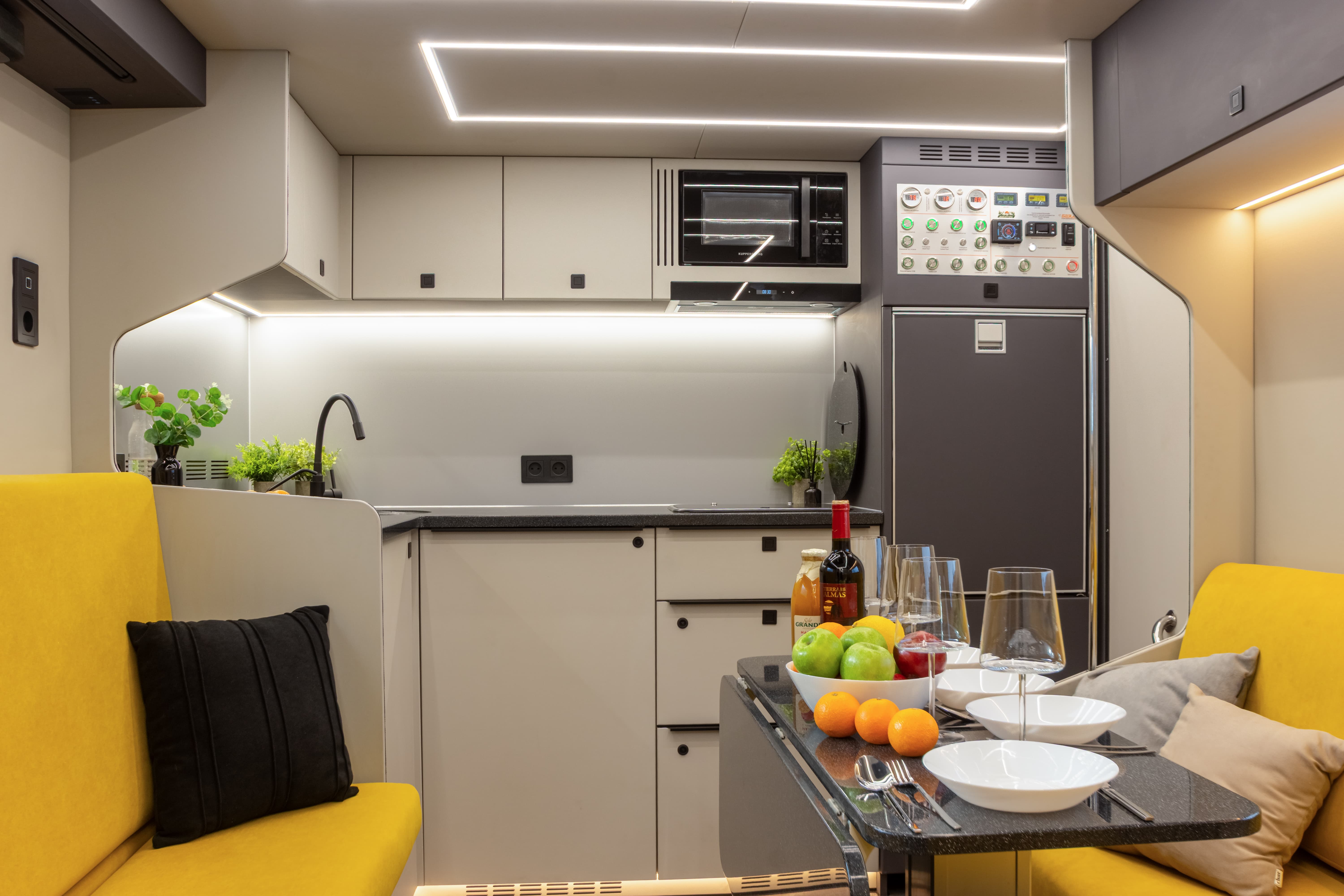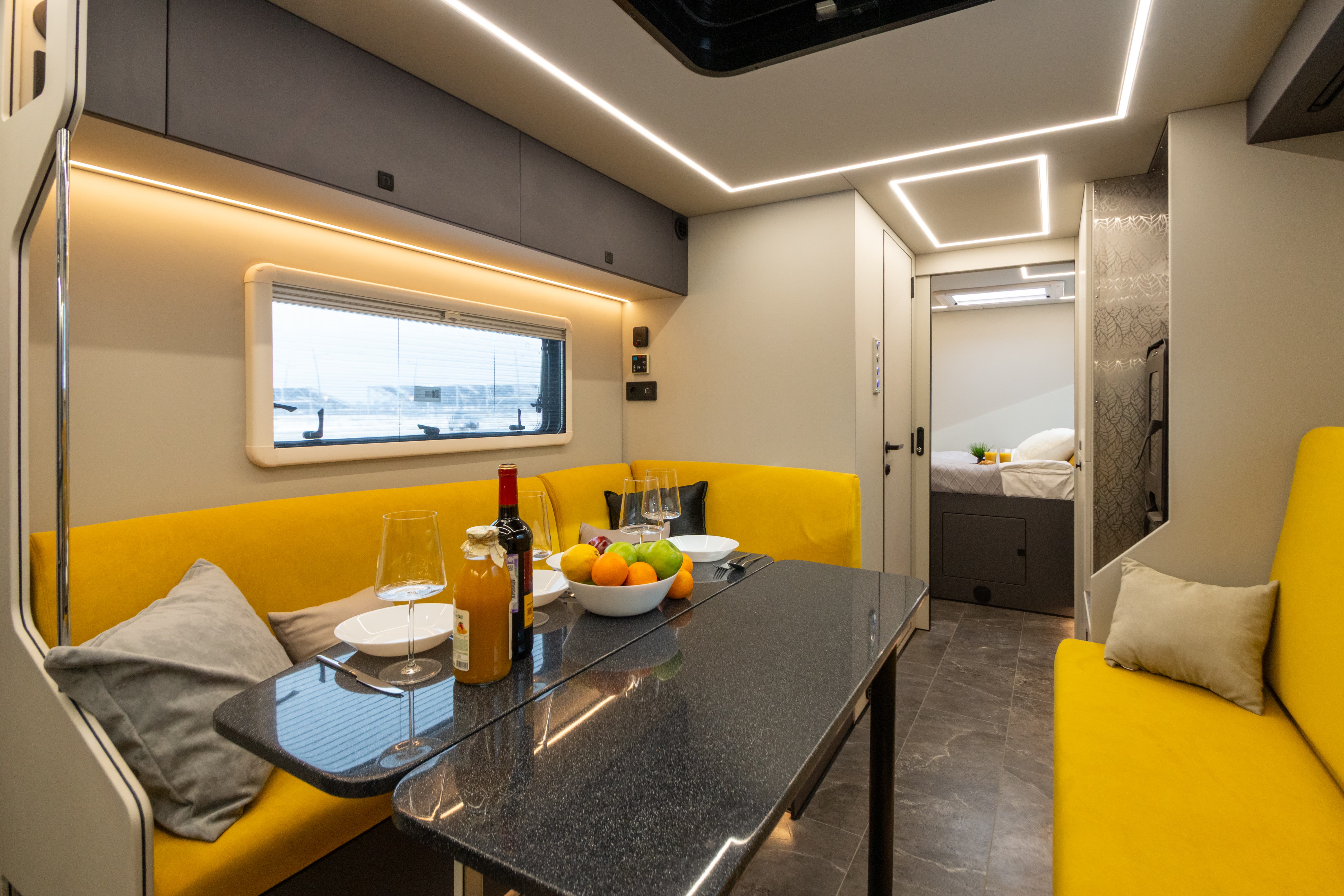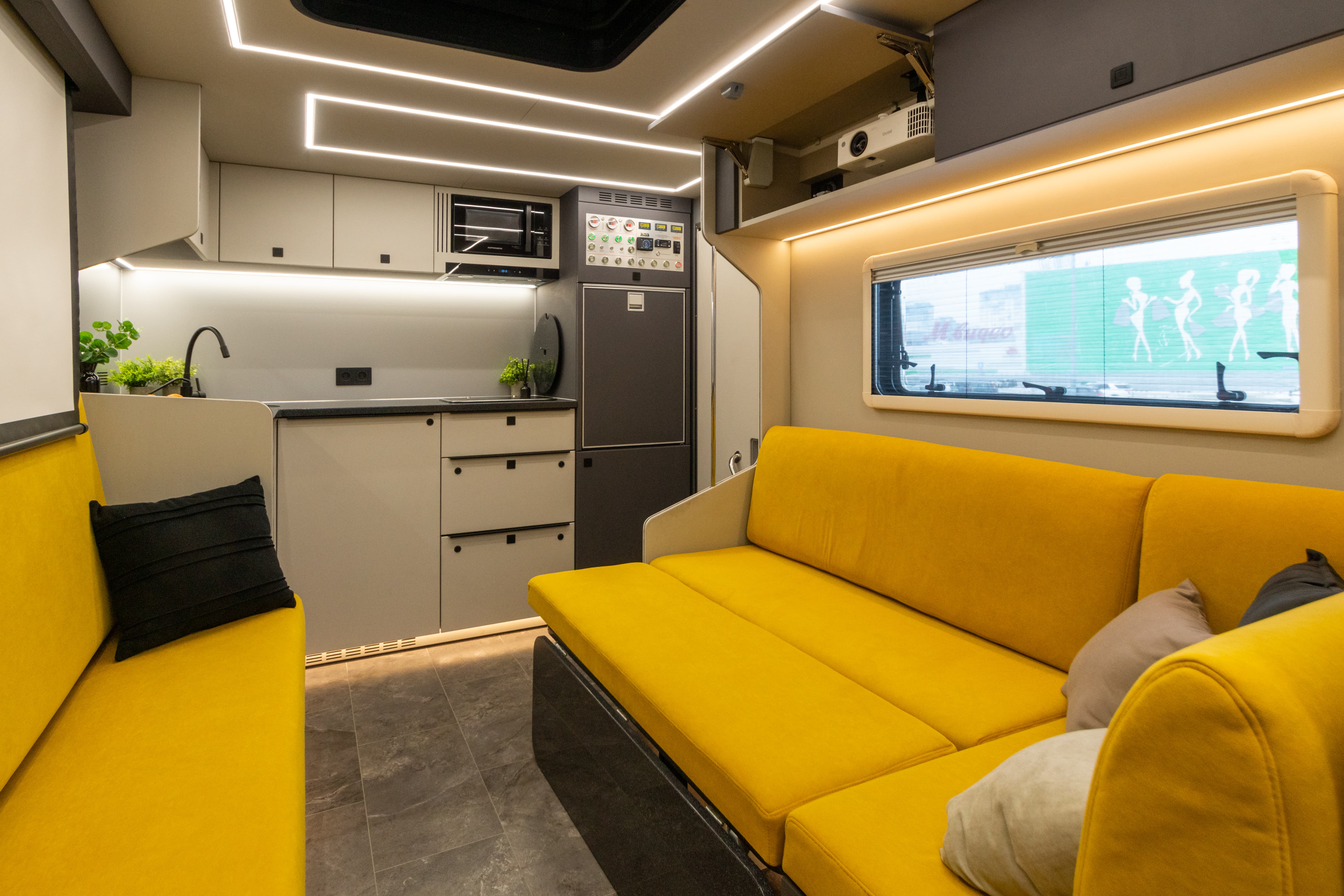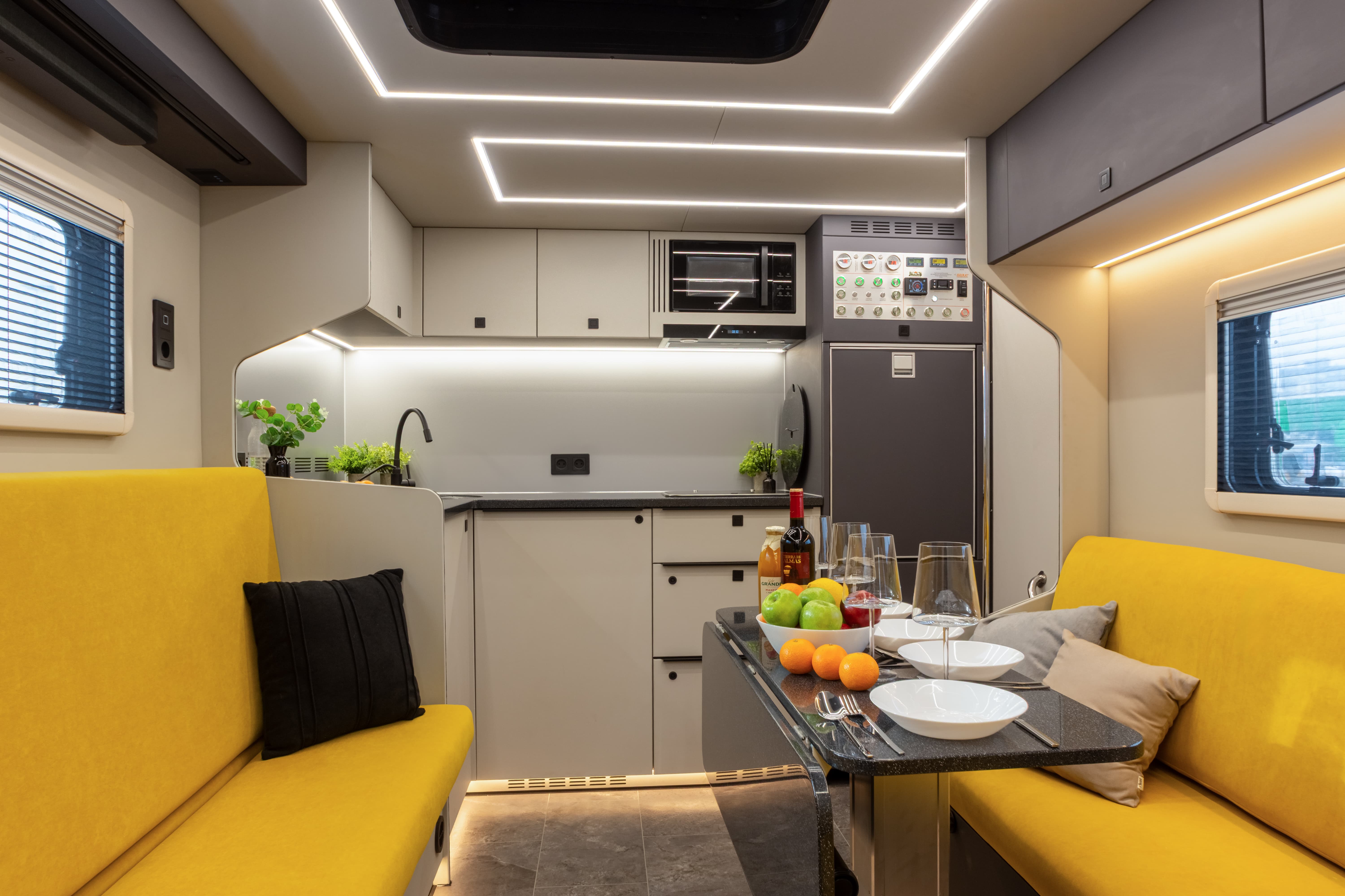 В ярком интерьере каждая деталь продумана до мелочей — от эргономики пространства до сценариев освещения и эффективного использования каждого сантиметра пространства фургона.
