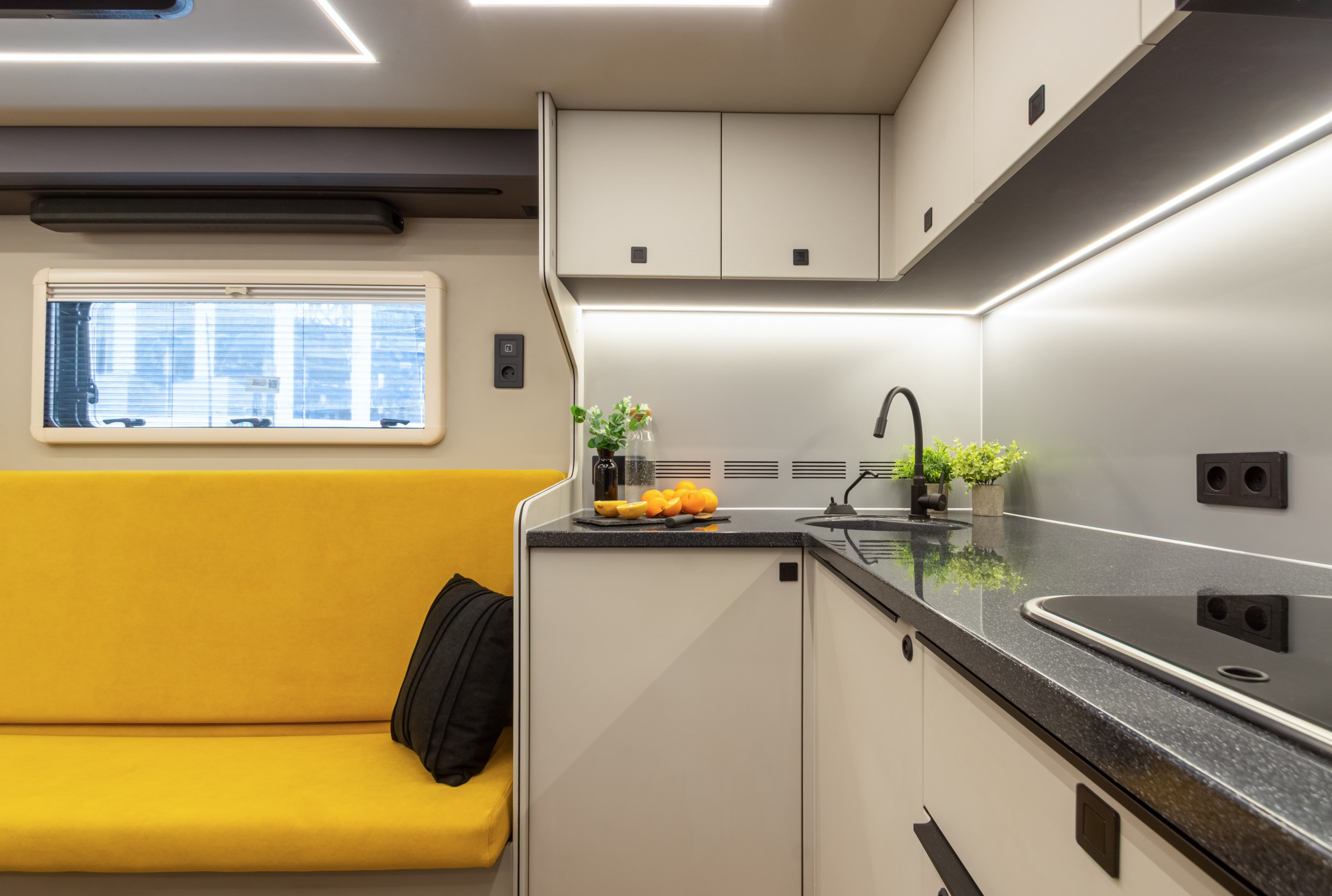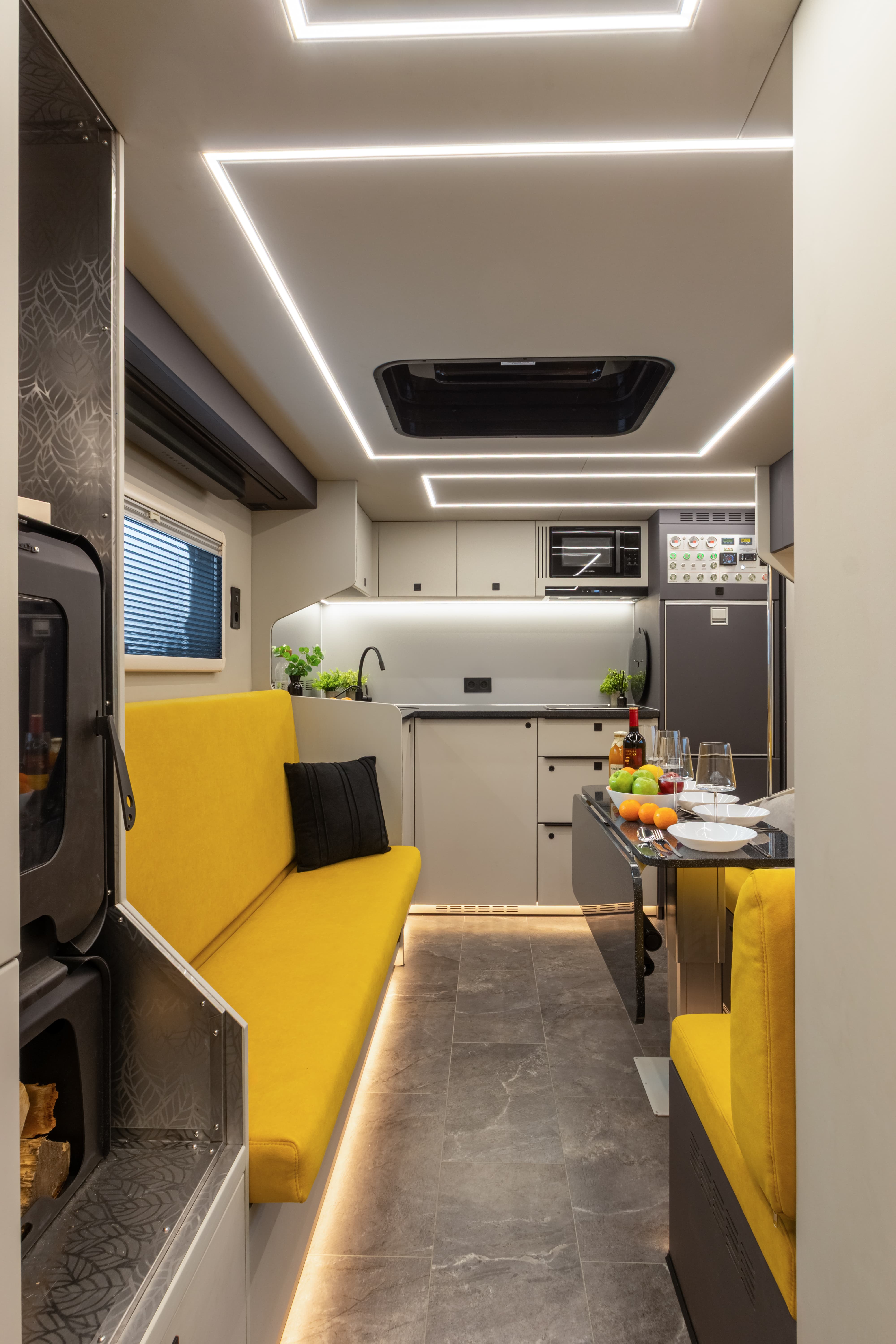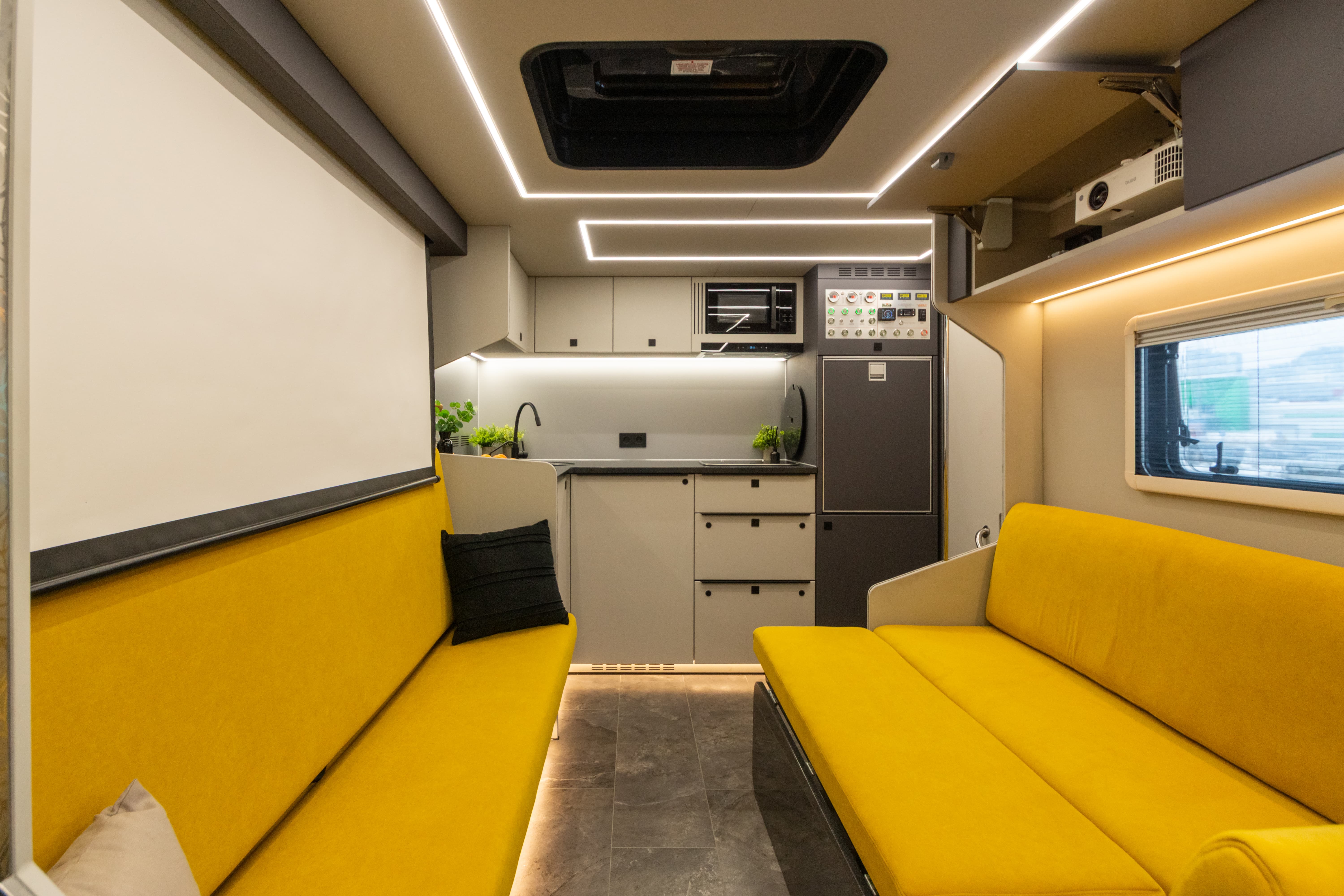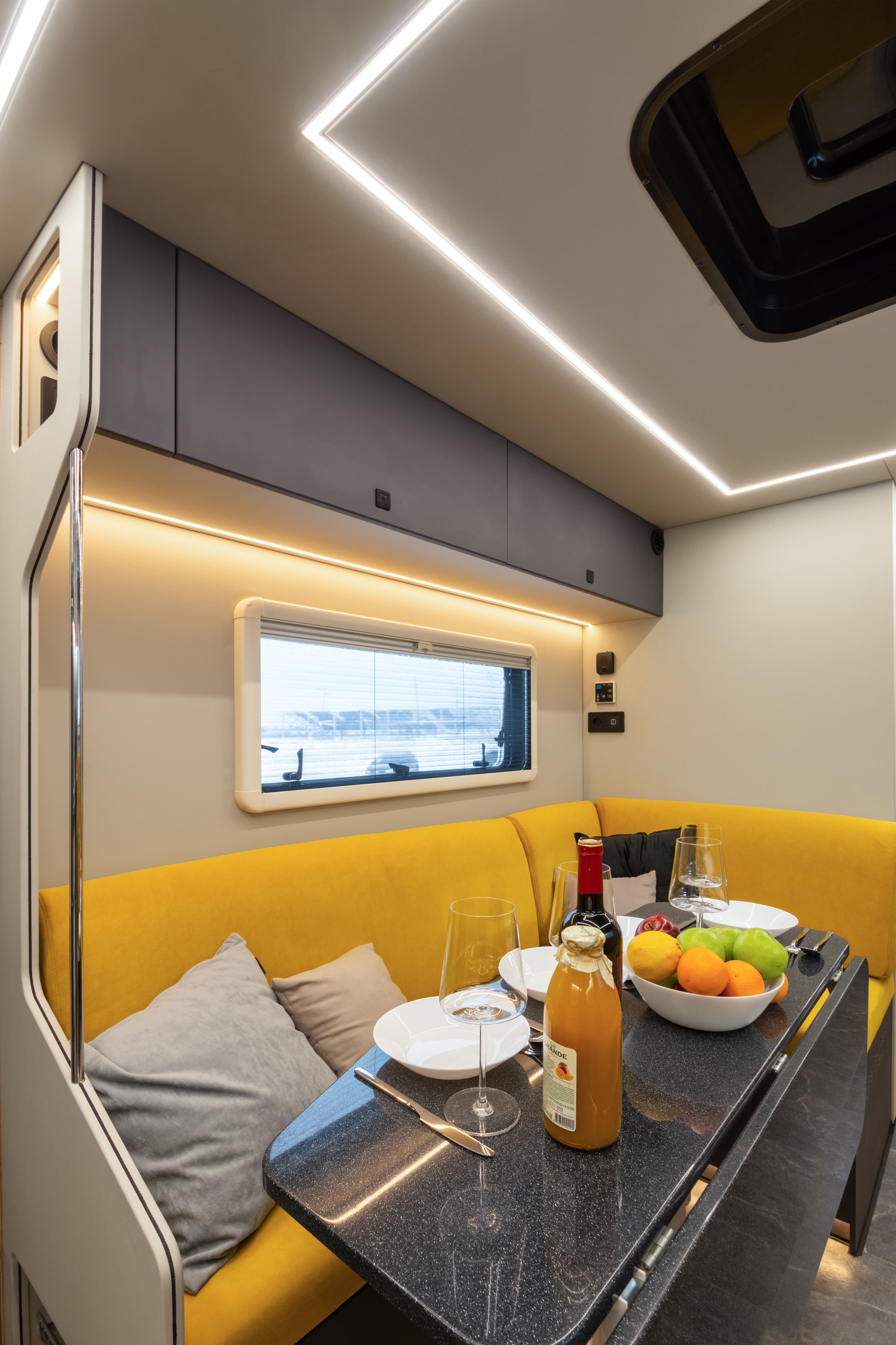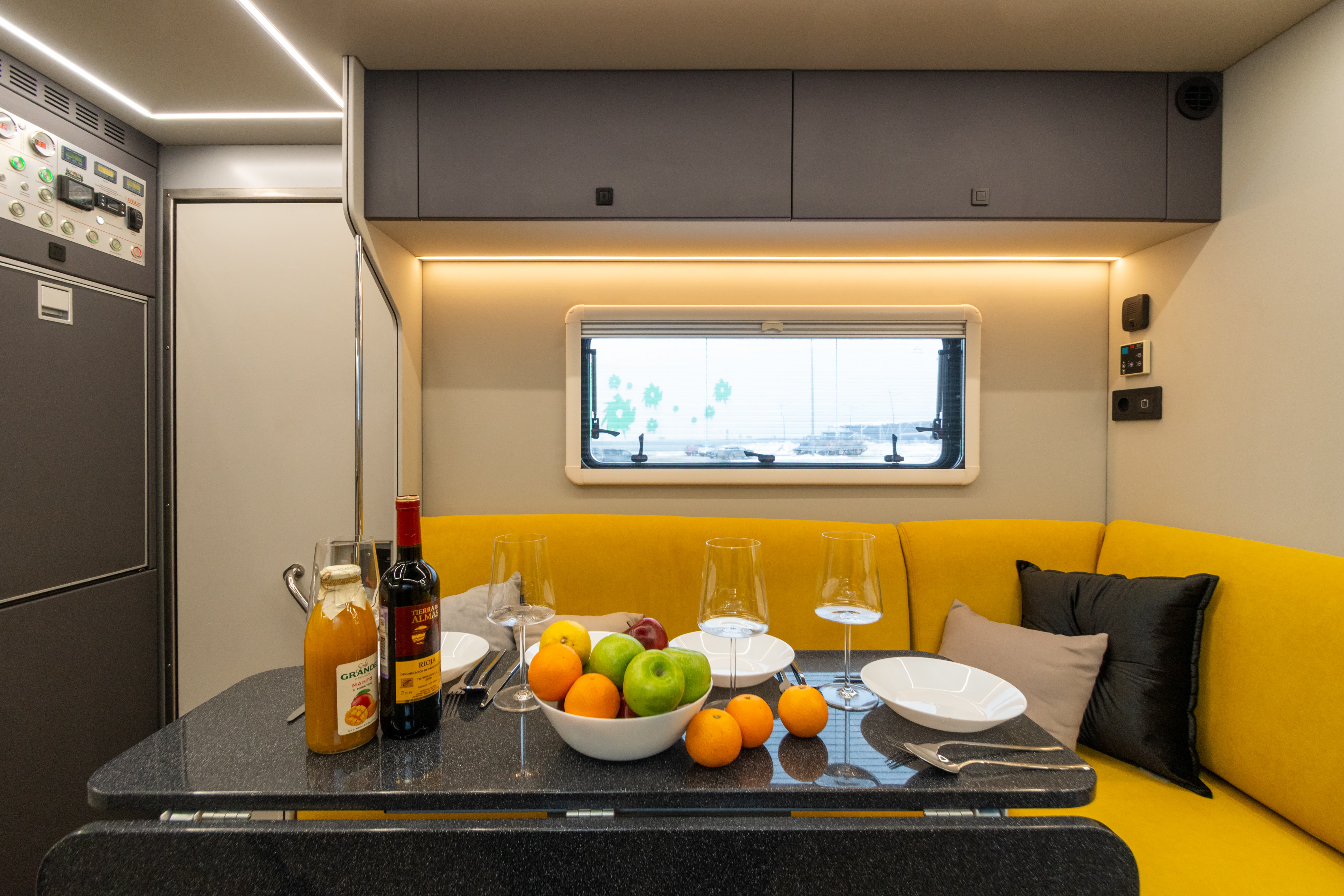 В ярком интерьере каждая деталь продумана до мелочей — от эргономики пространства до сценариев освещения и эффективного использования каждого сантиметра пространства фургона.