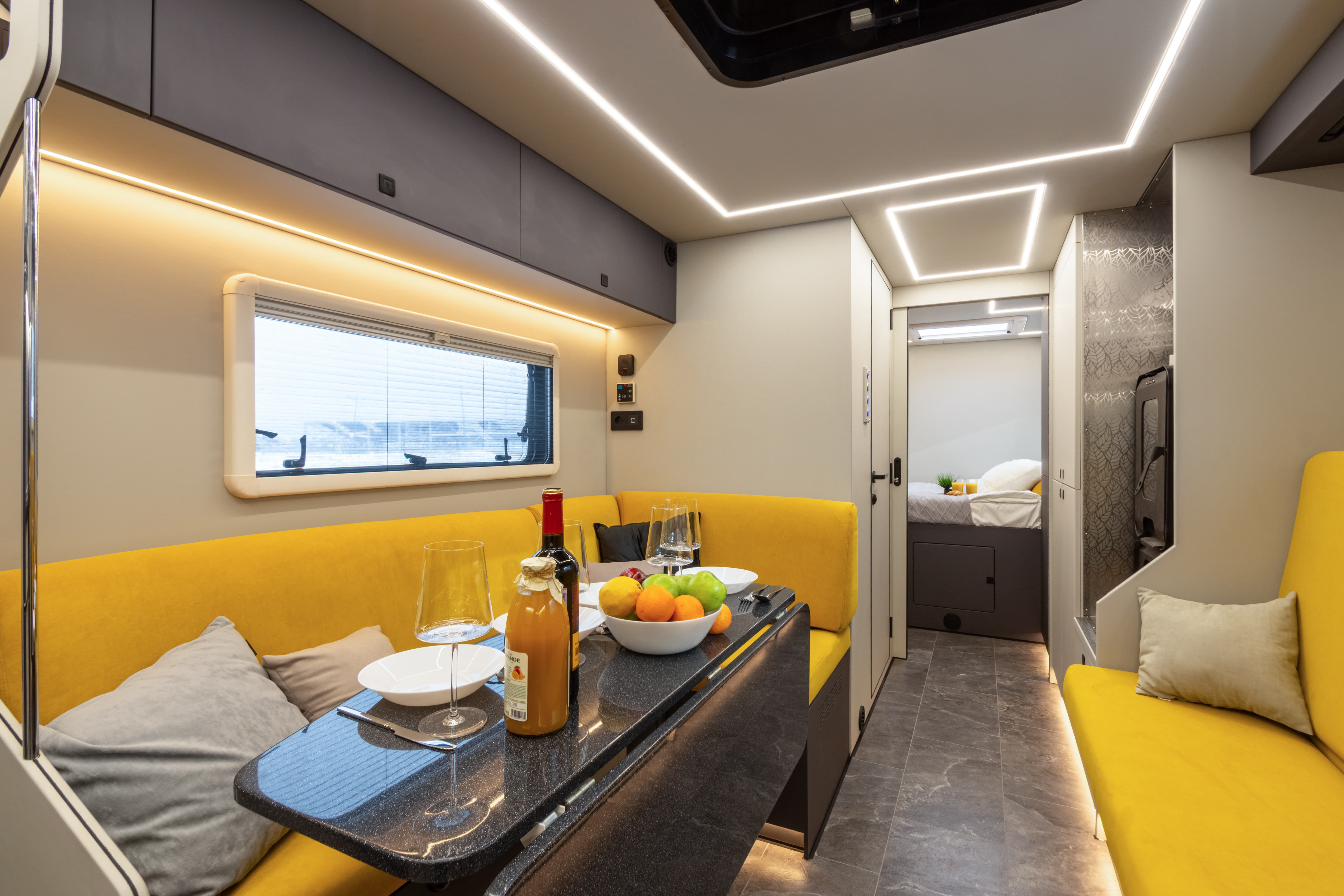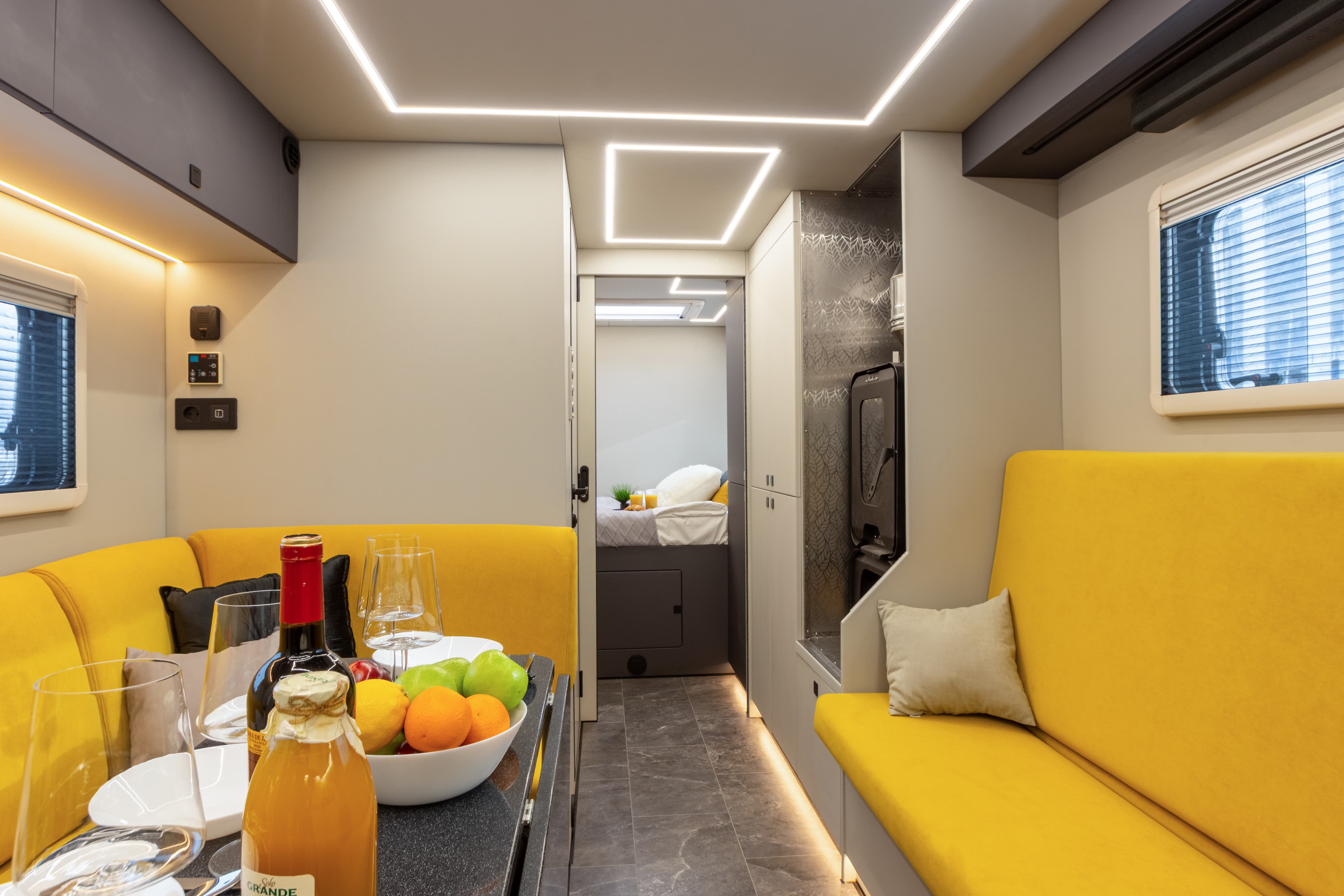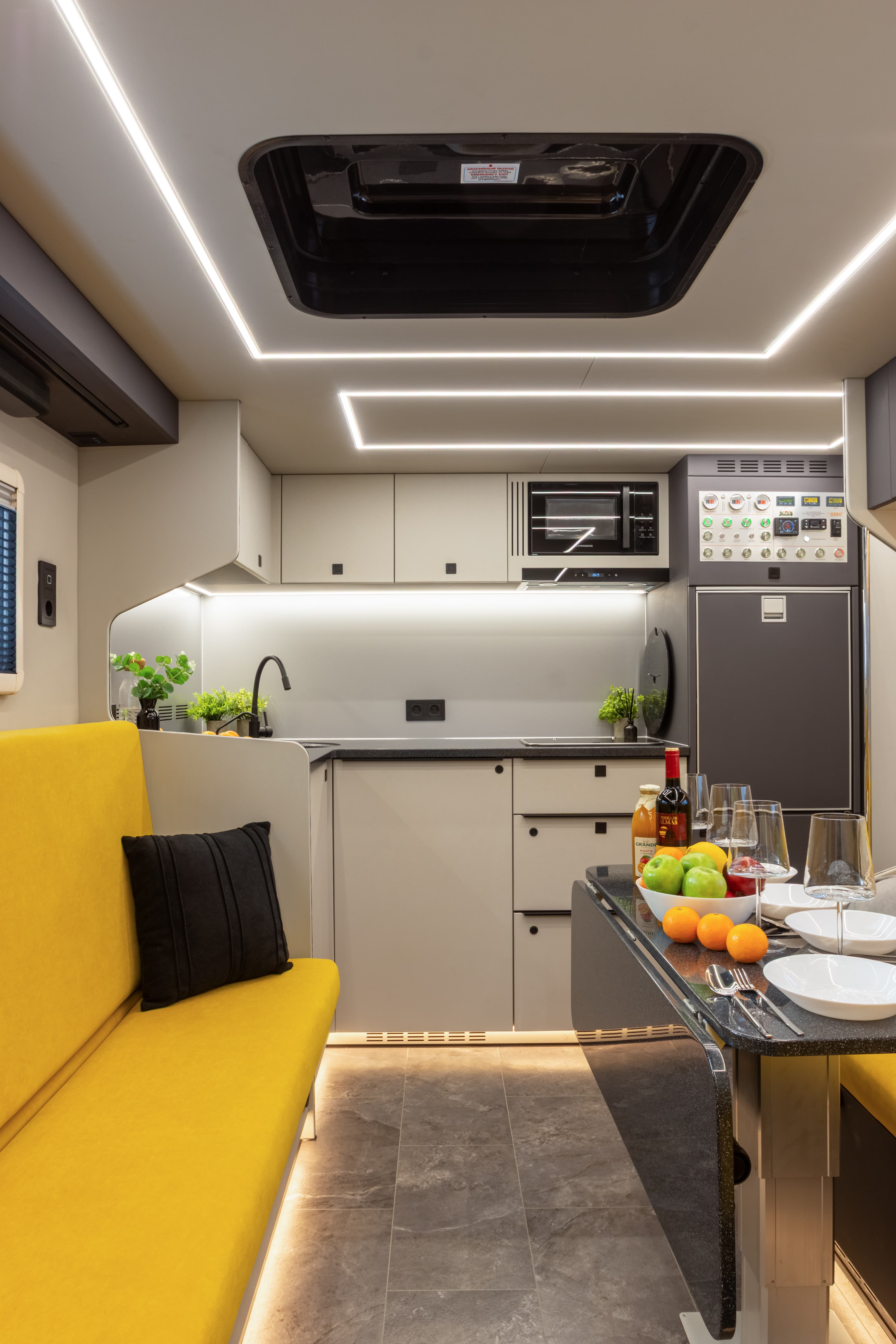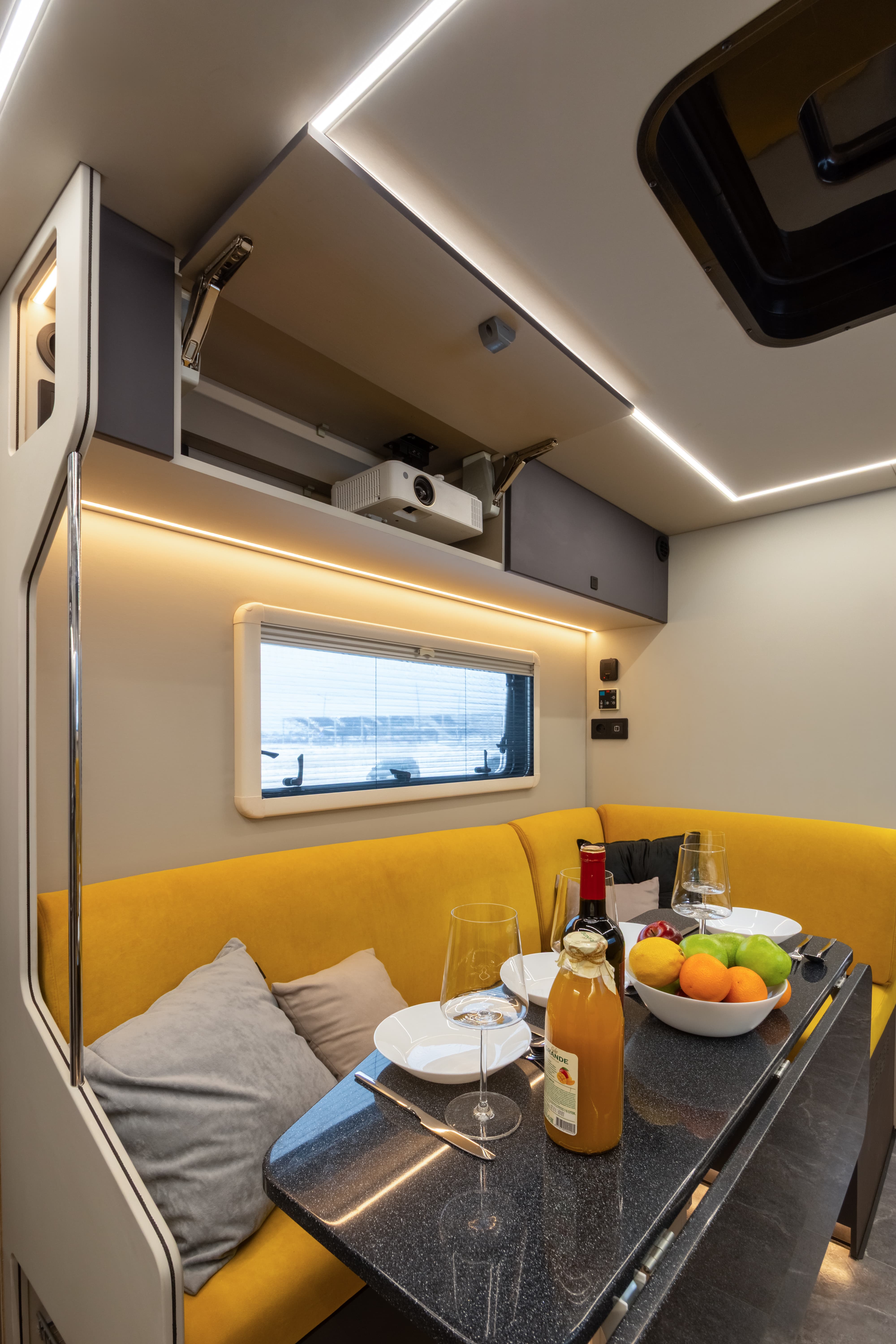 В ярком интерьере каждая деталь продумана до мелочей — от эргономики пространства до сценариев освещения и эффективного использования каждого сантиметра пространства фургона.