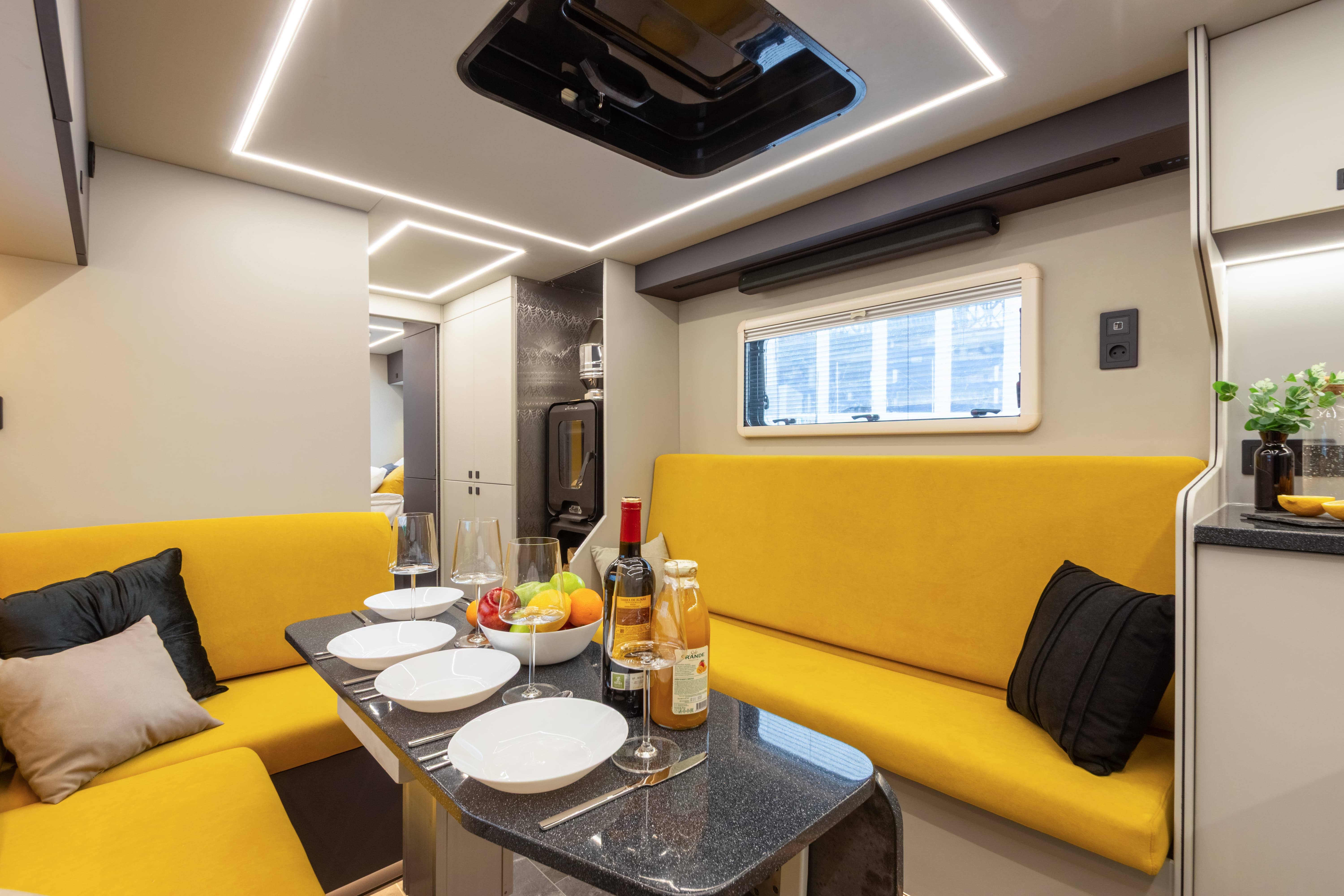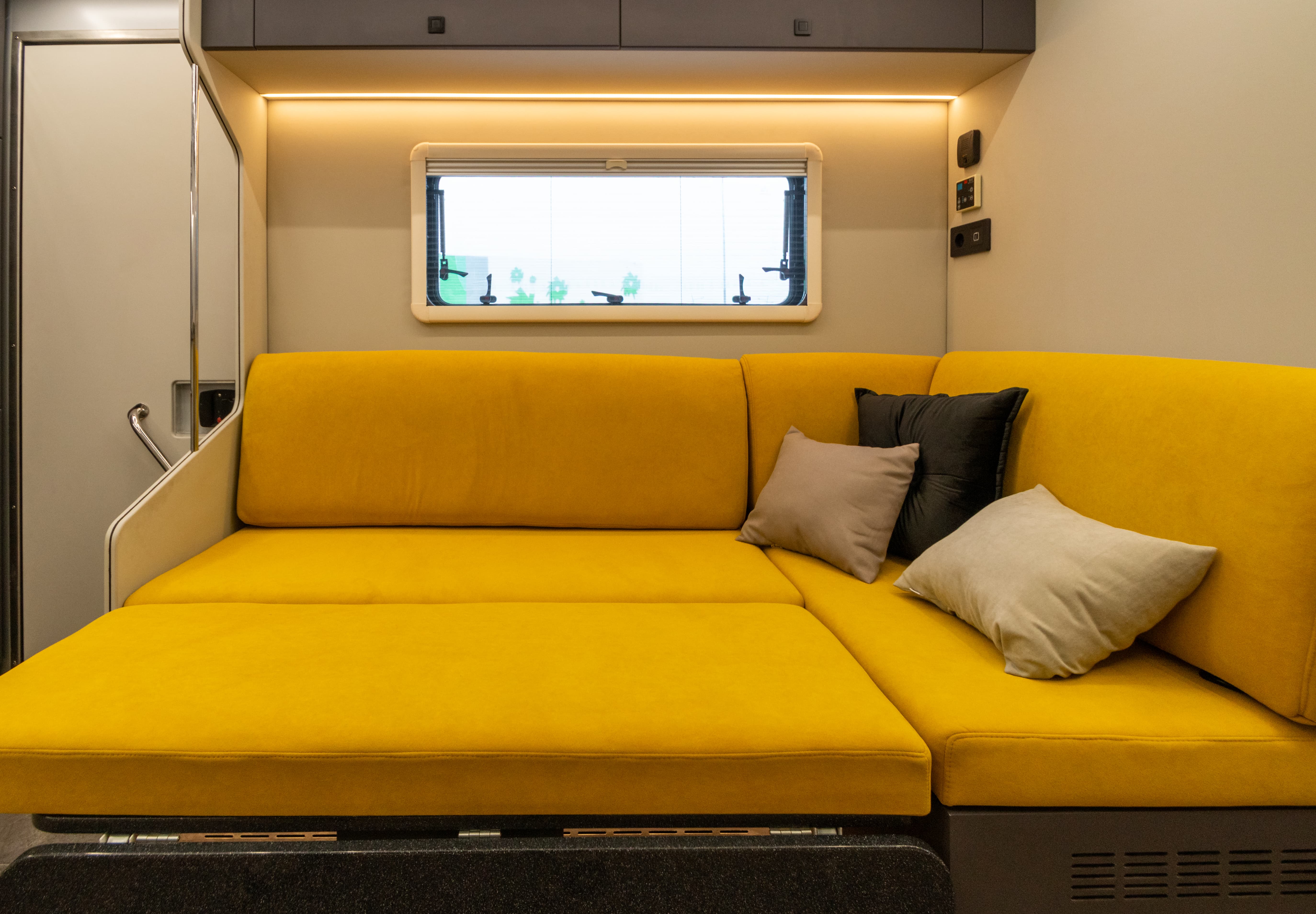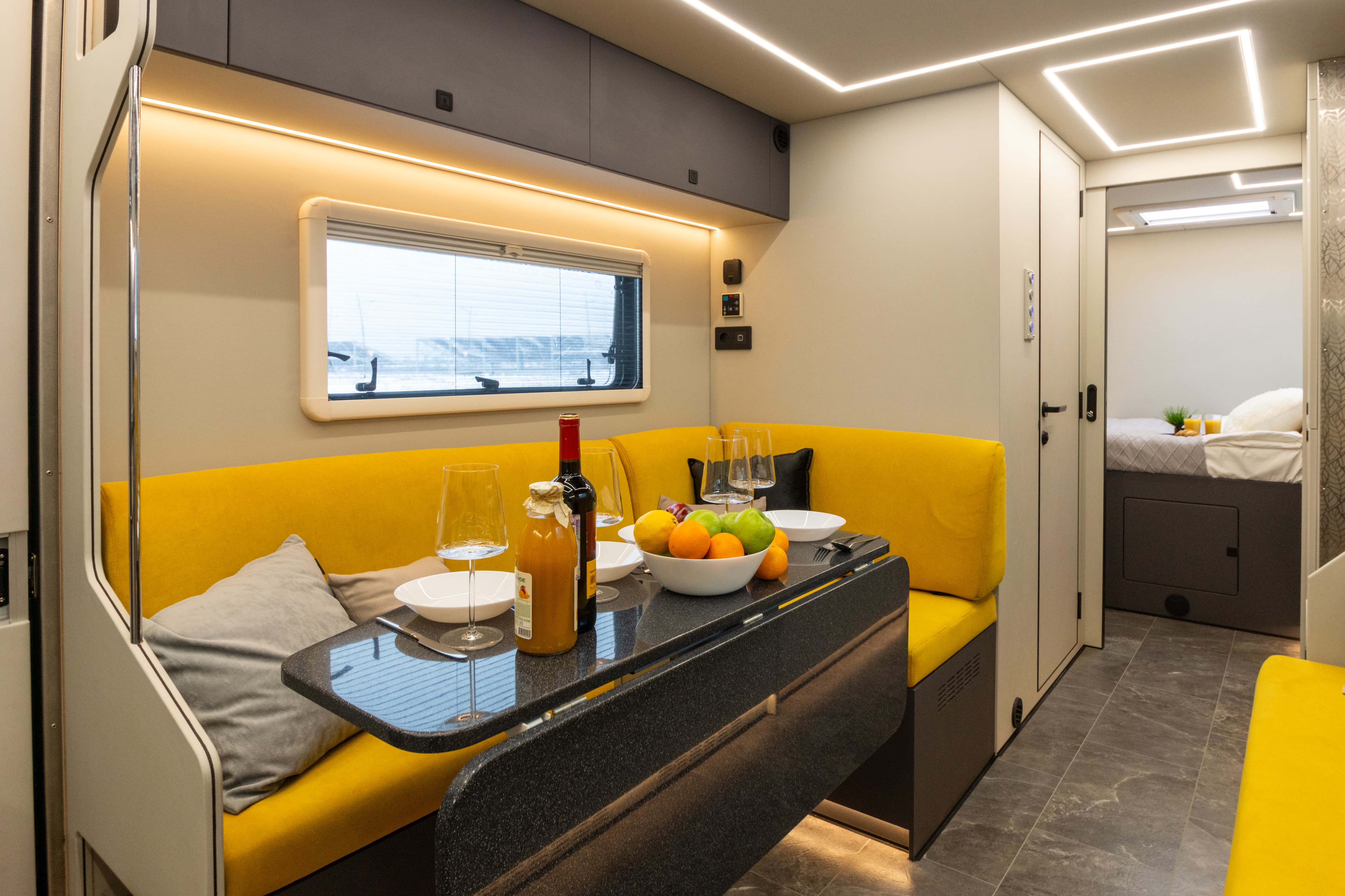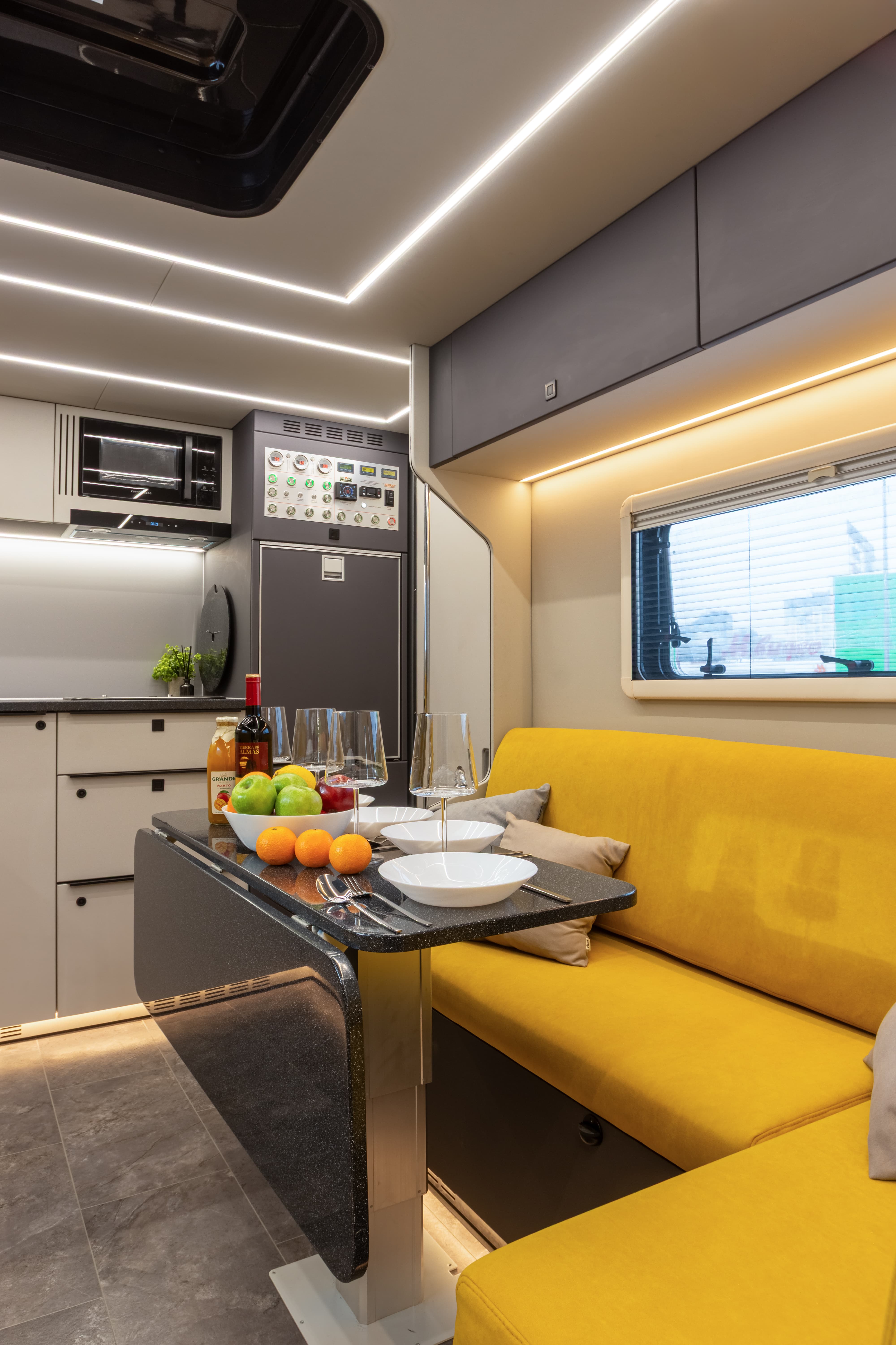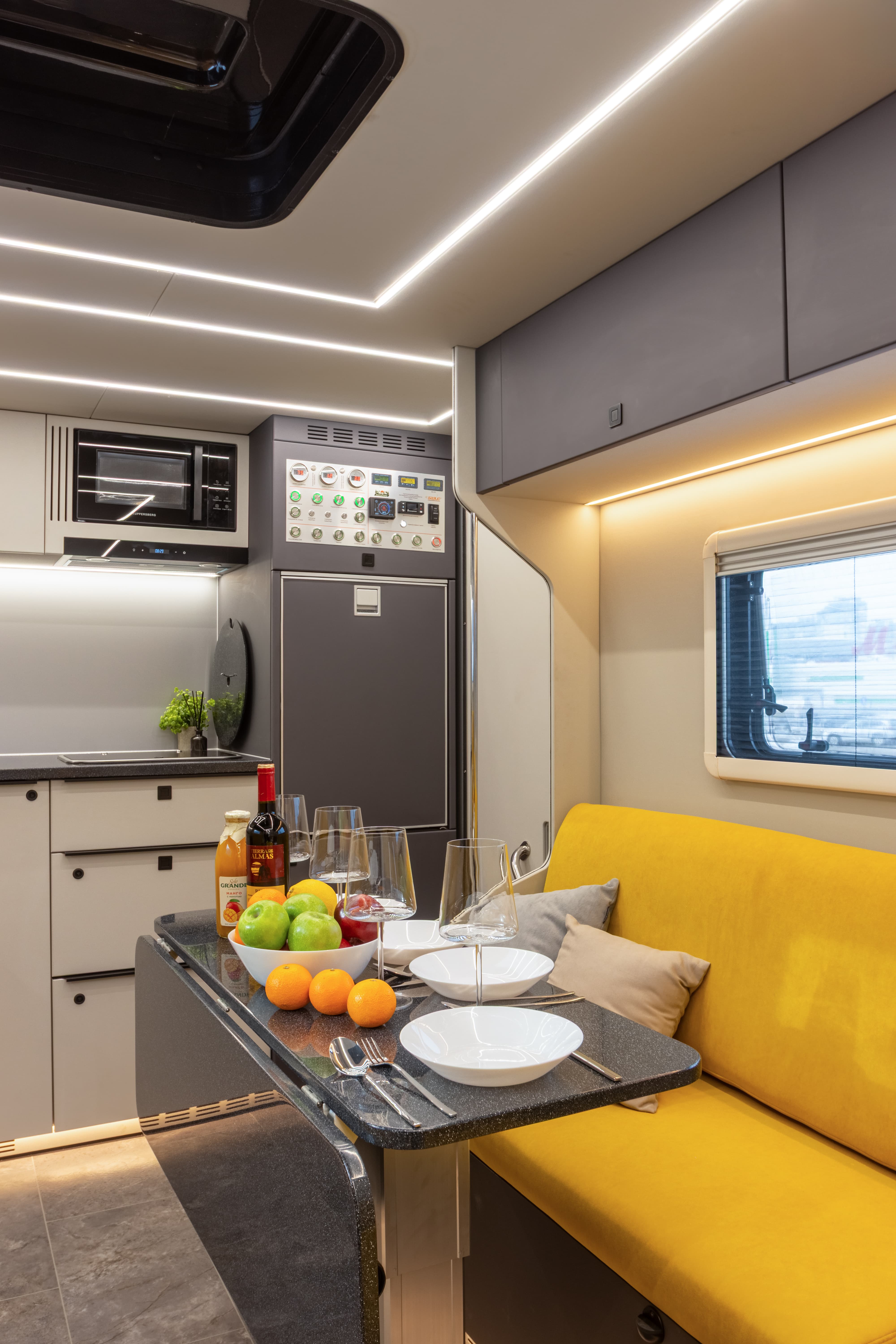 В ярком интерьере каждая деталь продумана до мелочей — от эргономики пространства до сценариев освещения и эффективного использования каждого сантиметра пространства фургона.