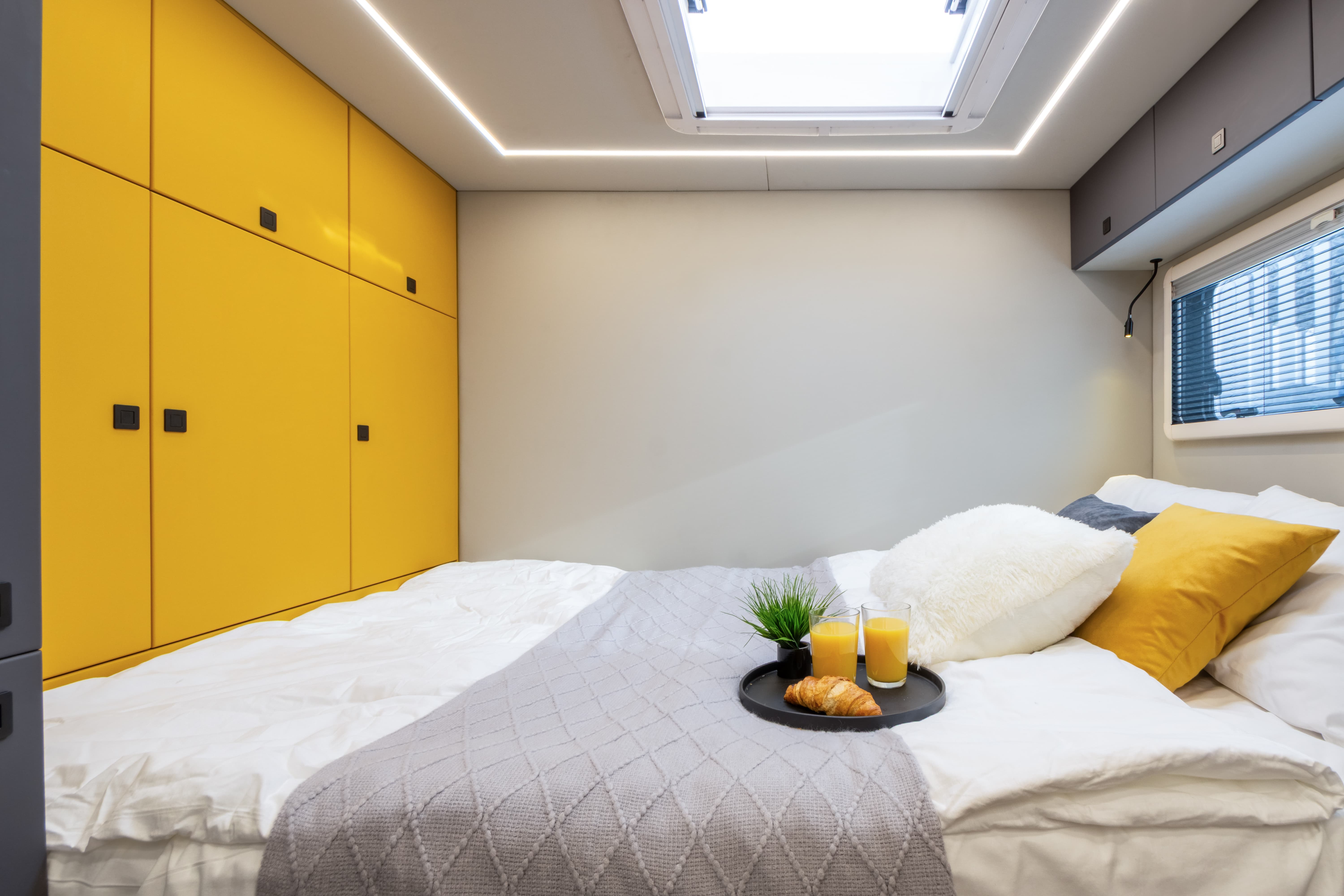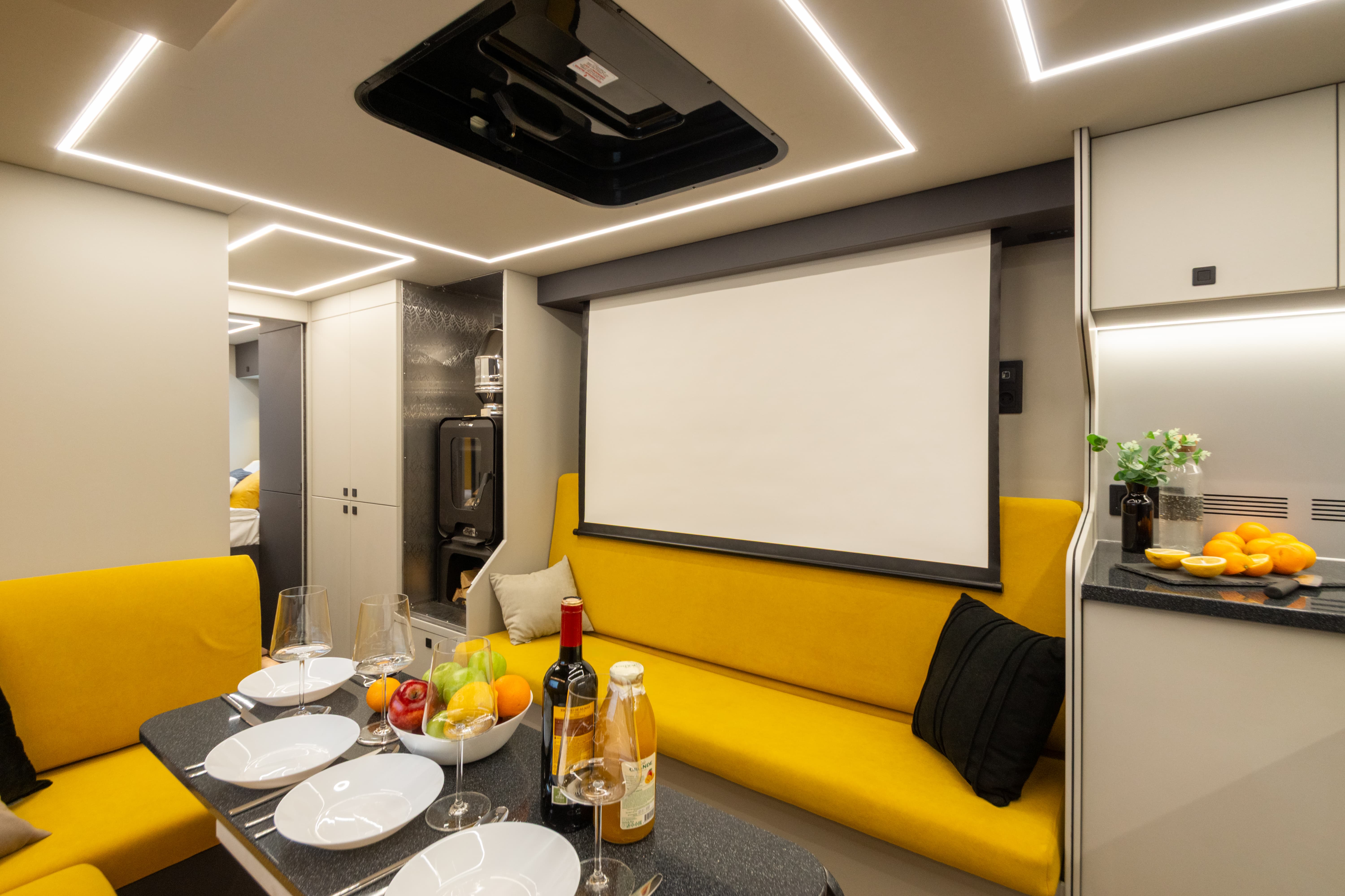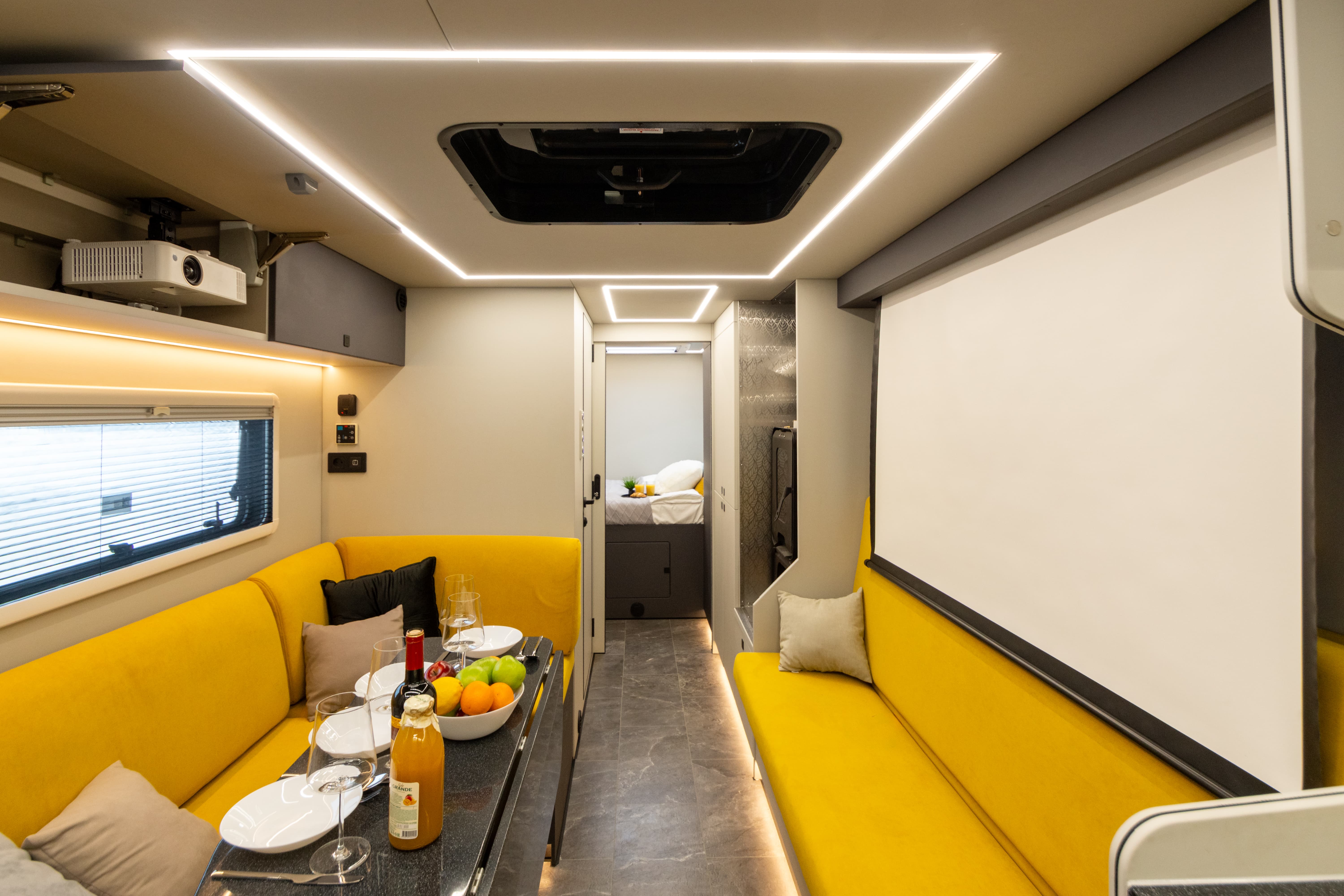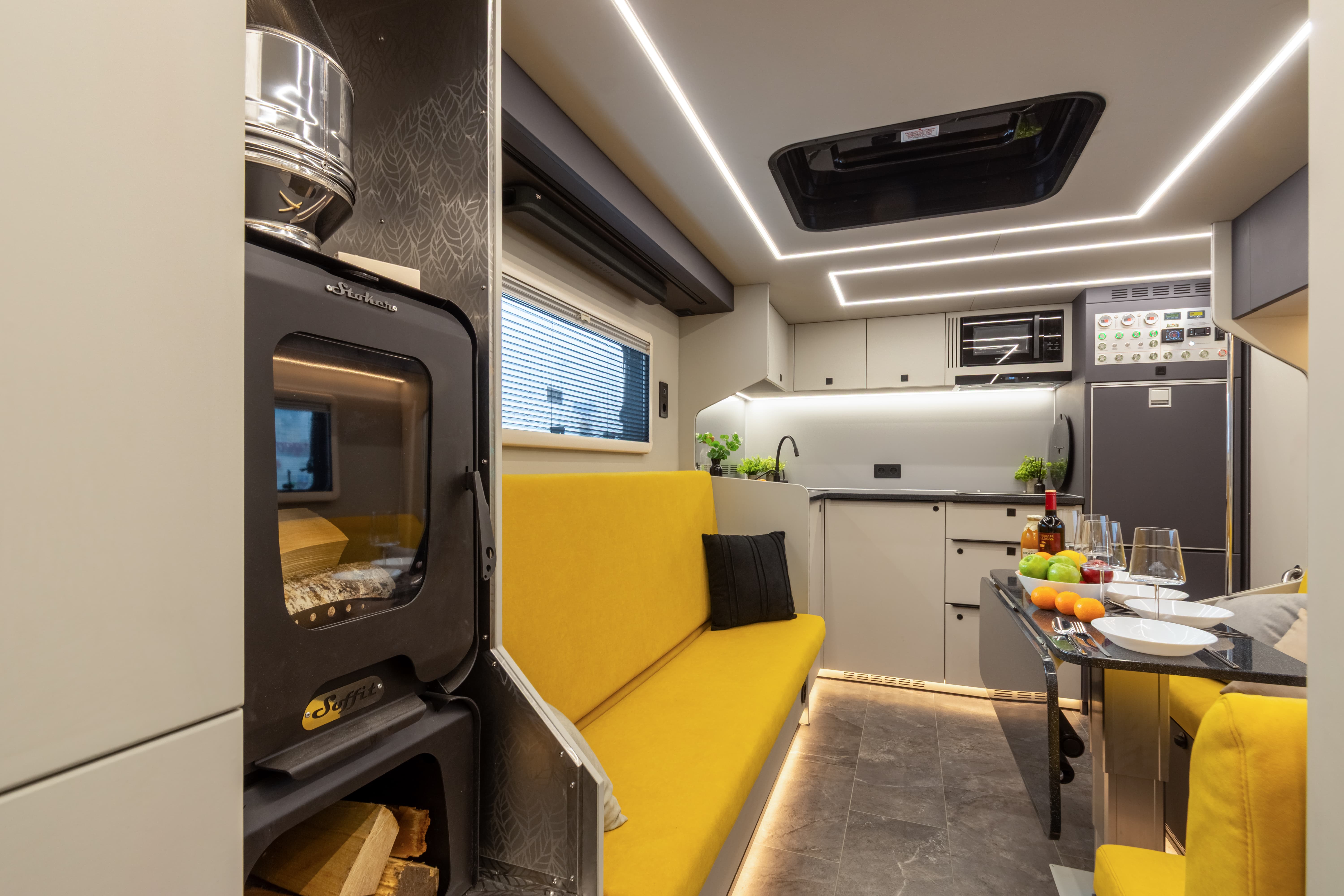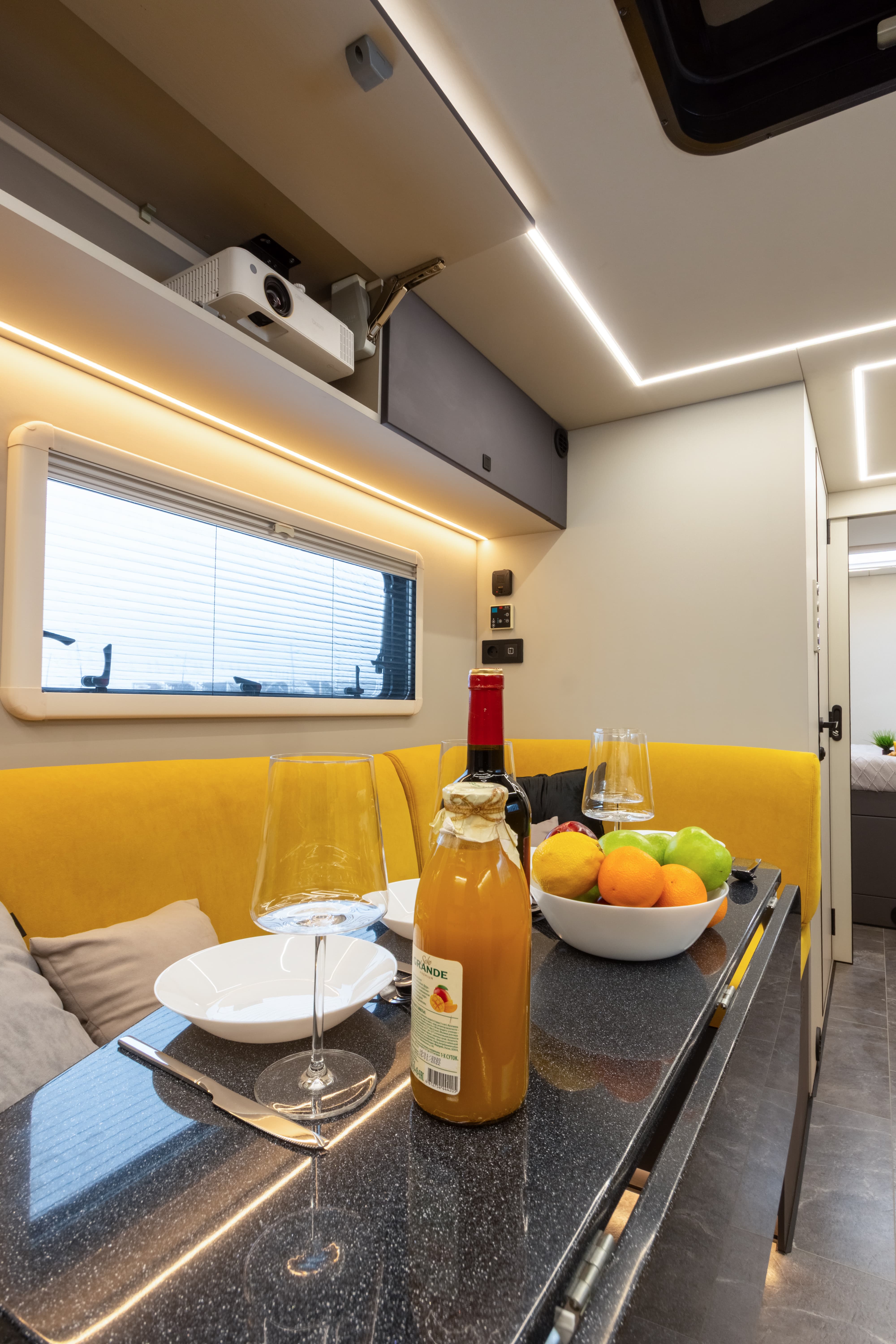 В ярком интерьере каждая деталь продумана до мелочей — от эргономики пространства до сценариев освещения и эффективного использования каждого сантиметра пространства фургона.