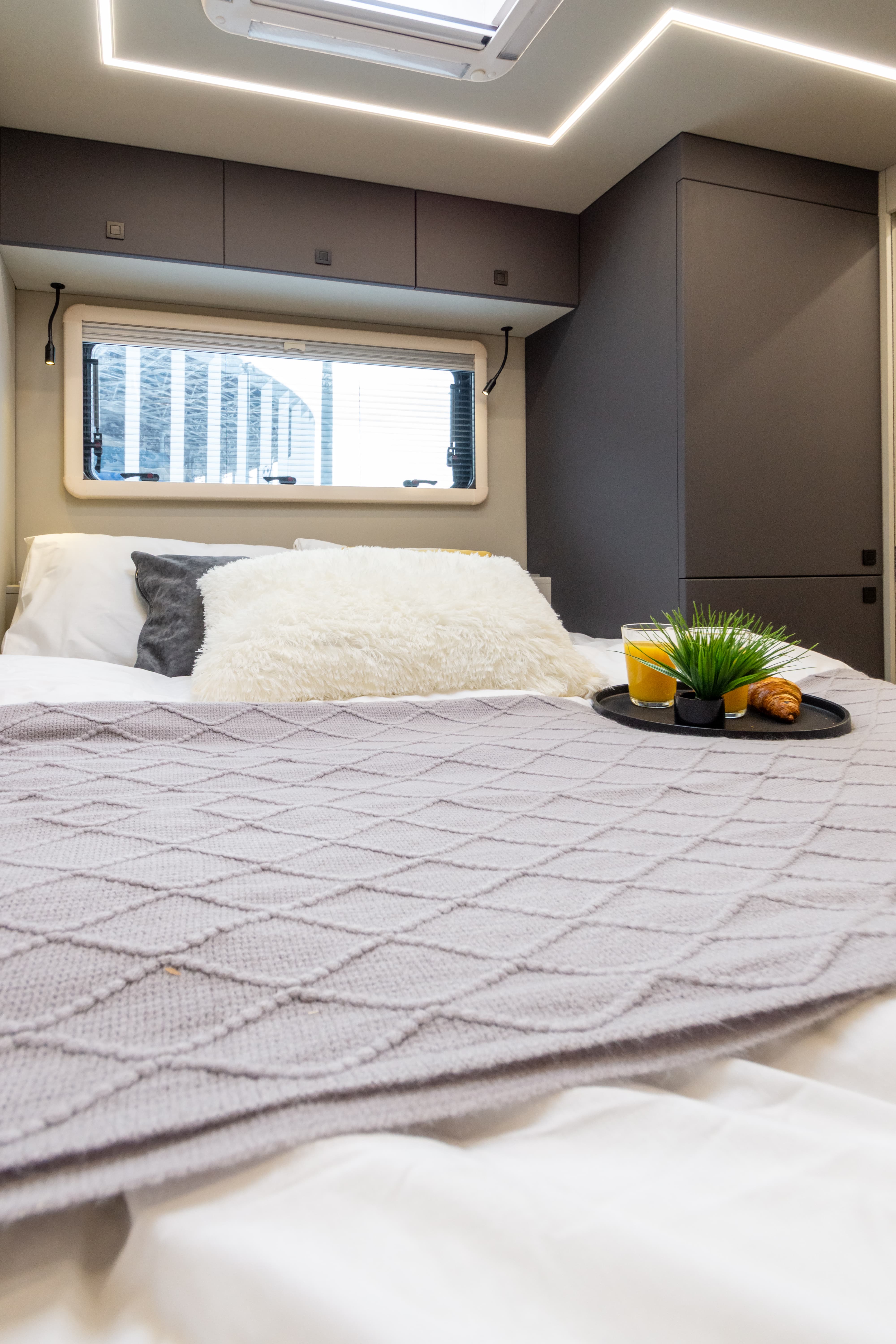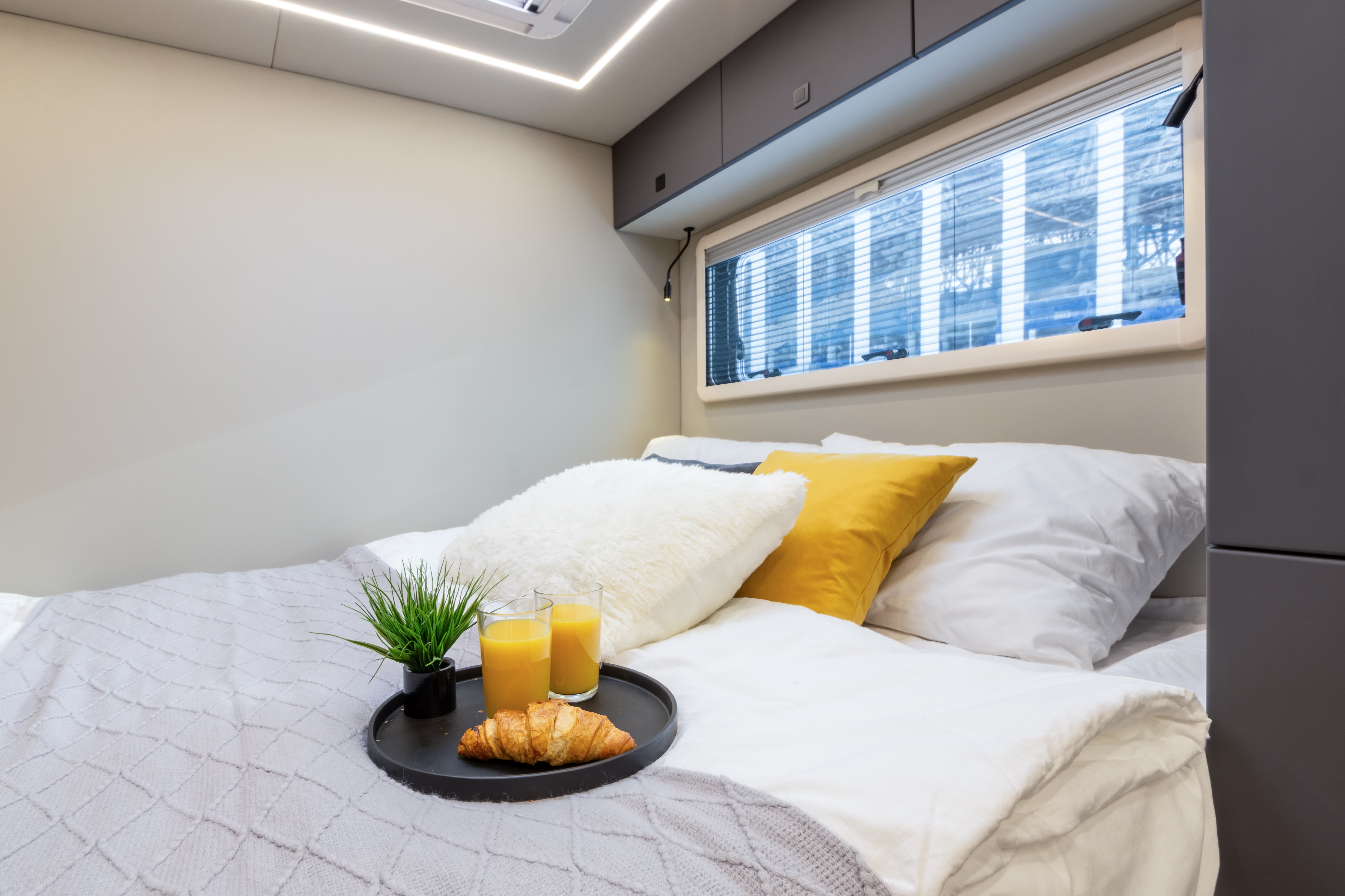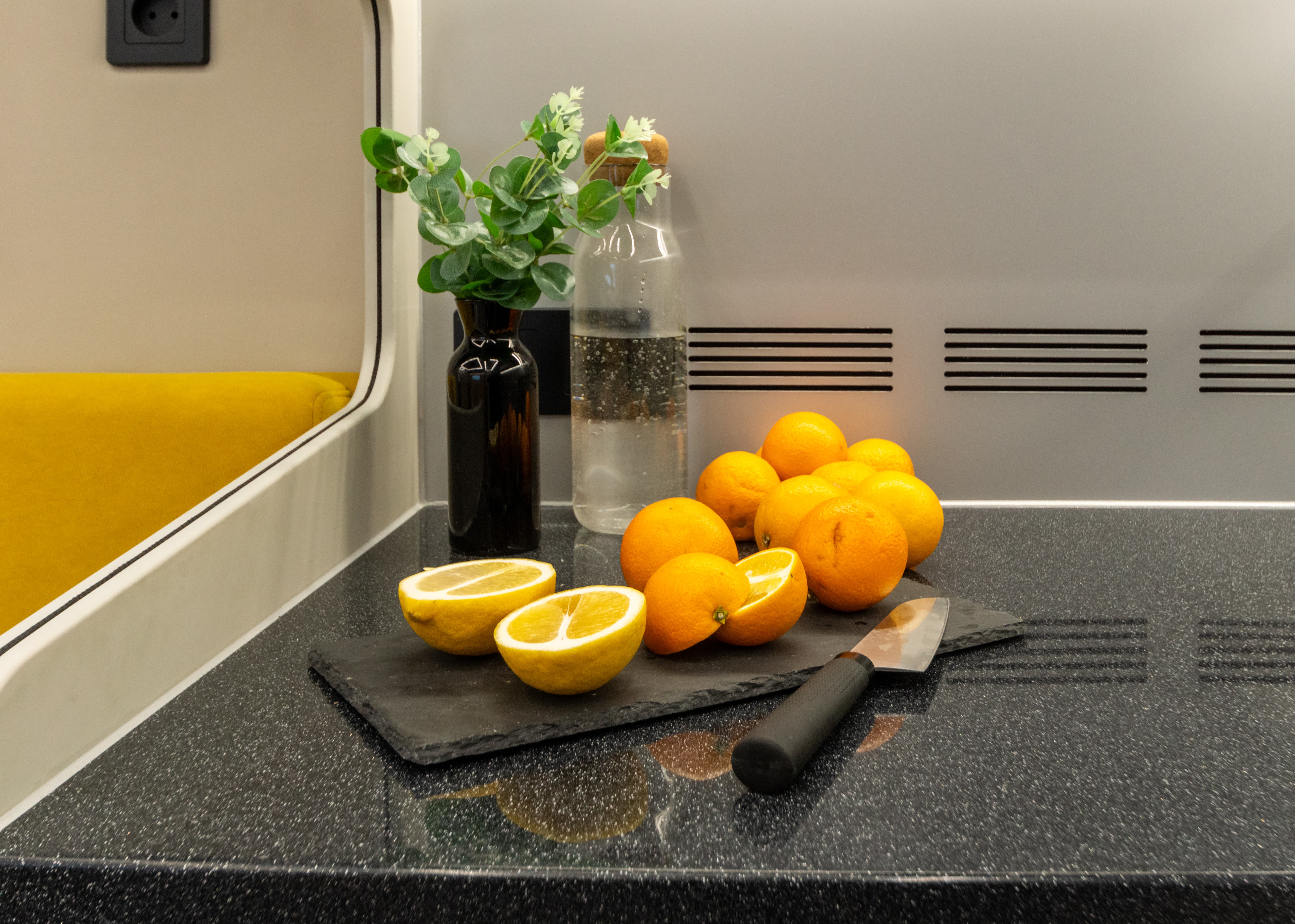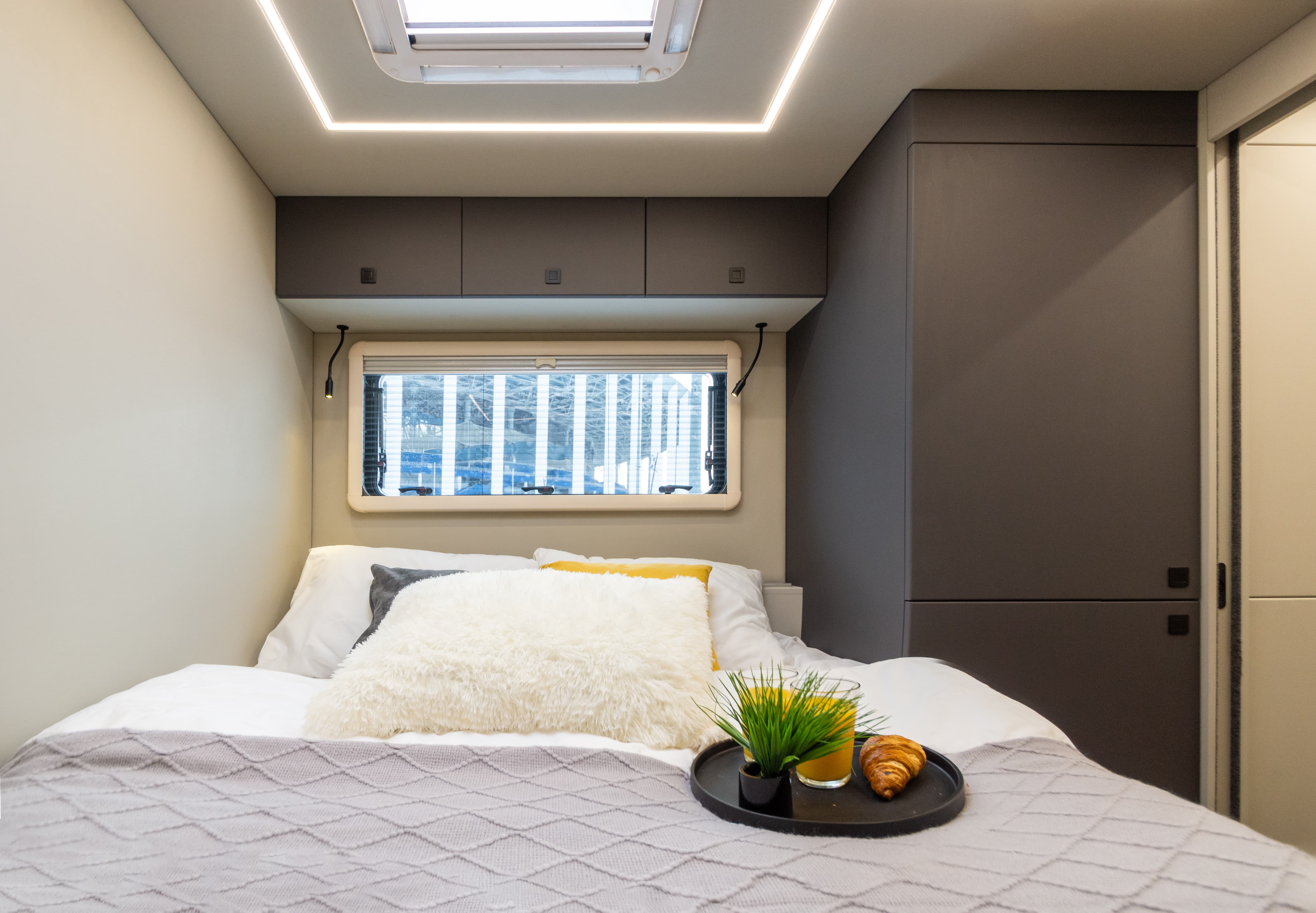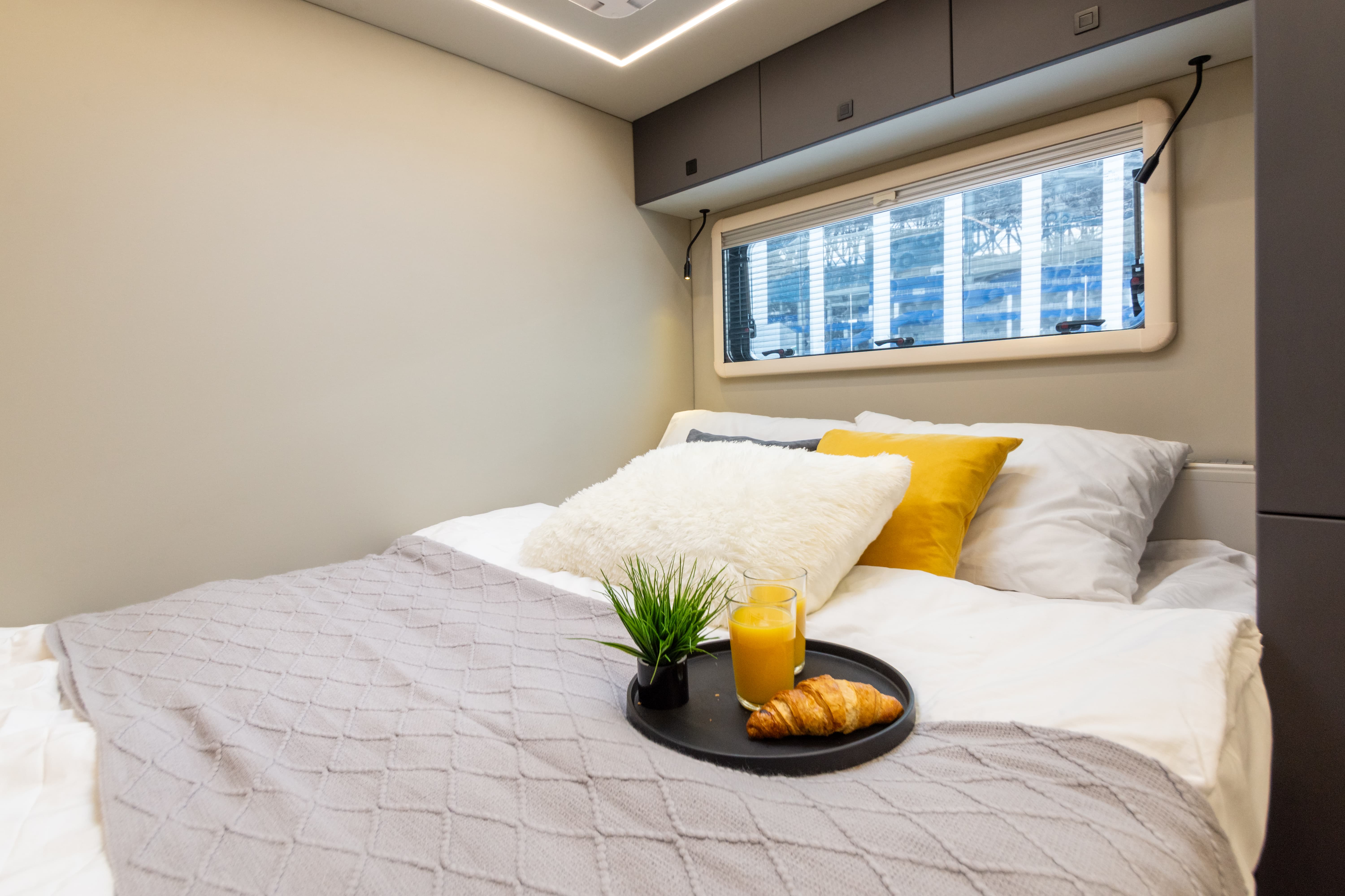 В ярком интерьере каждая деталь продумана до мелочей — от эргономики пространства до сценариев освещения и эффективного использования каждого сантиметра пространства фургона.