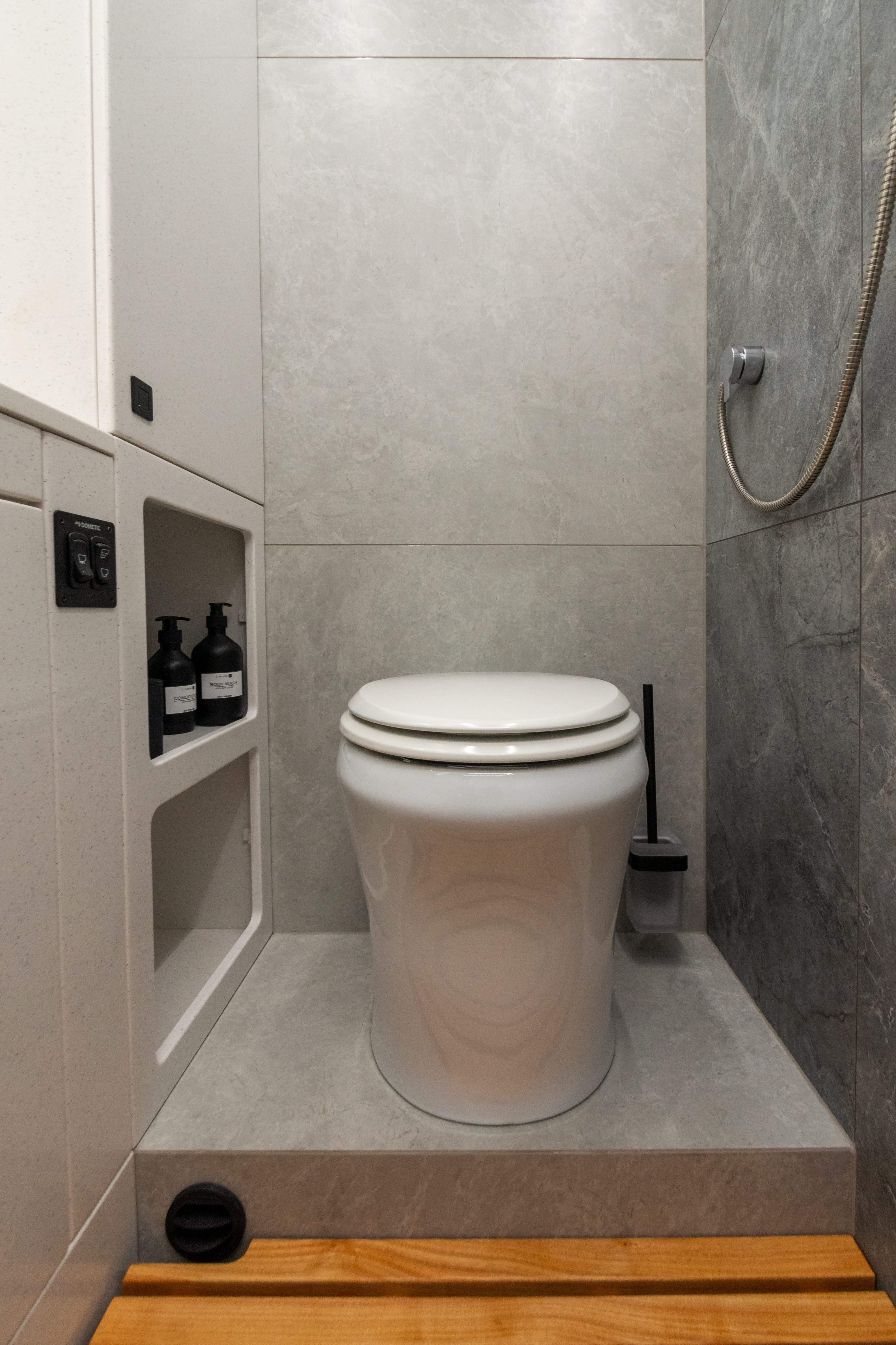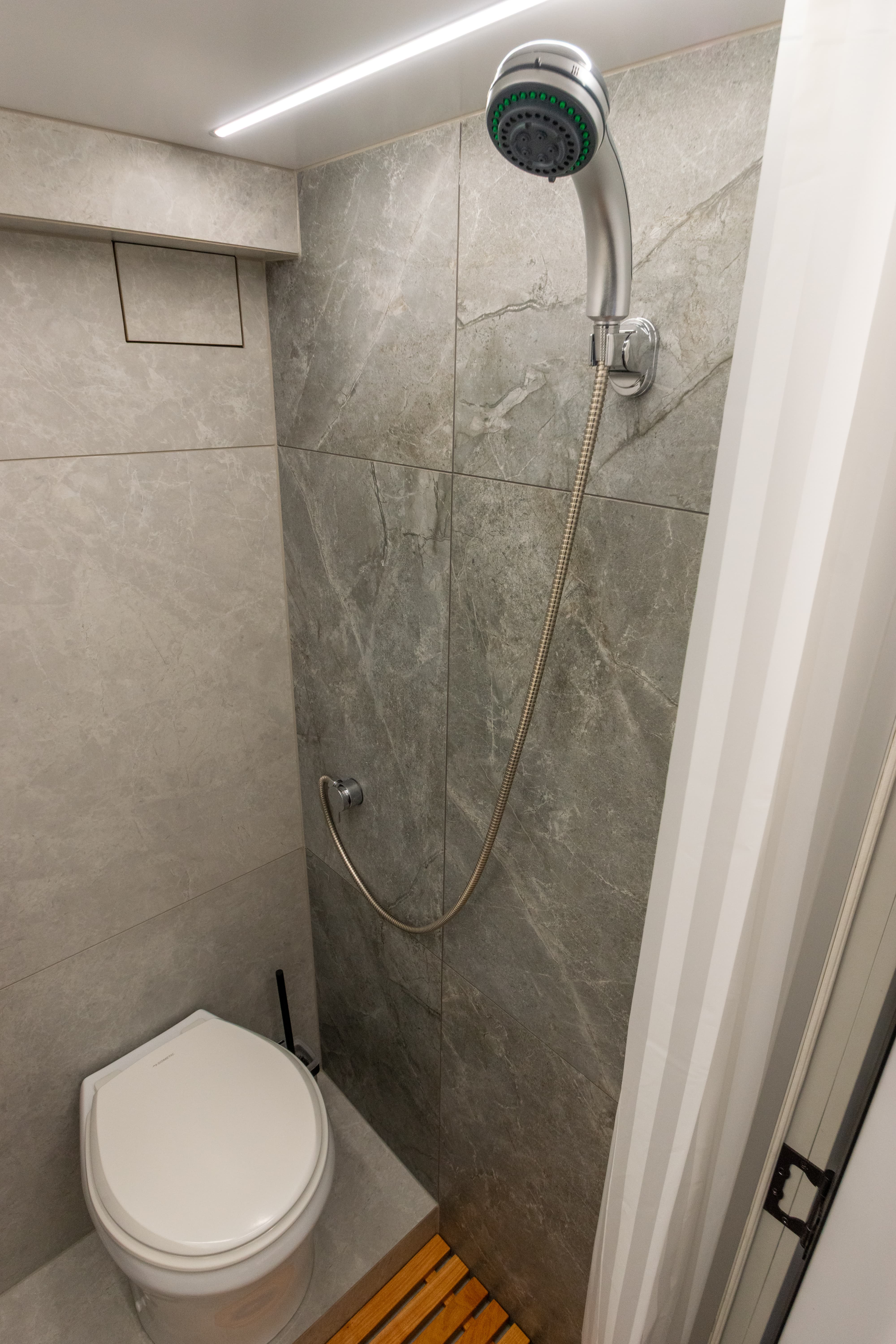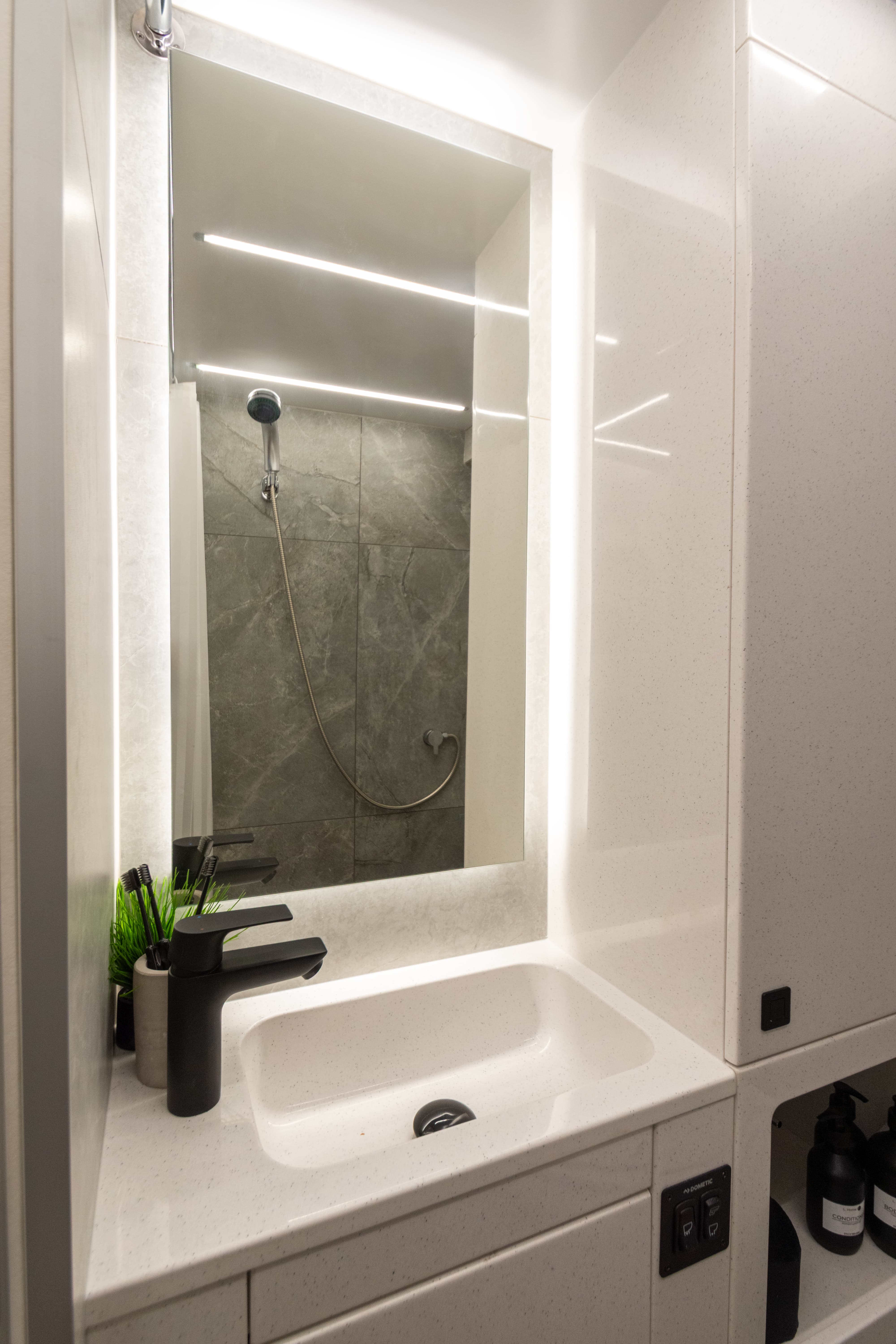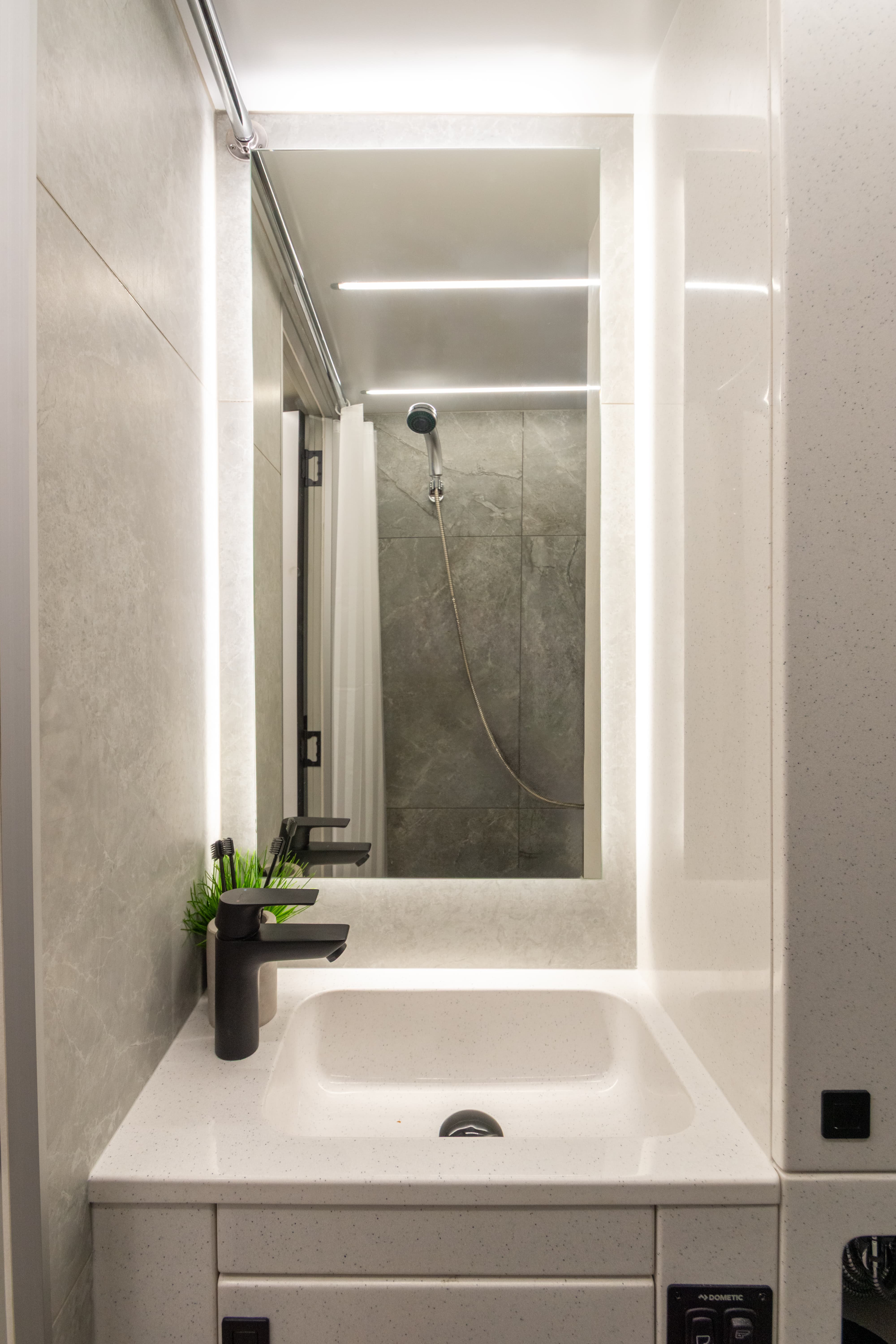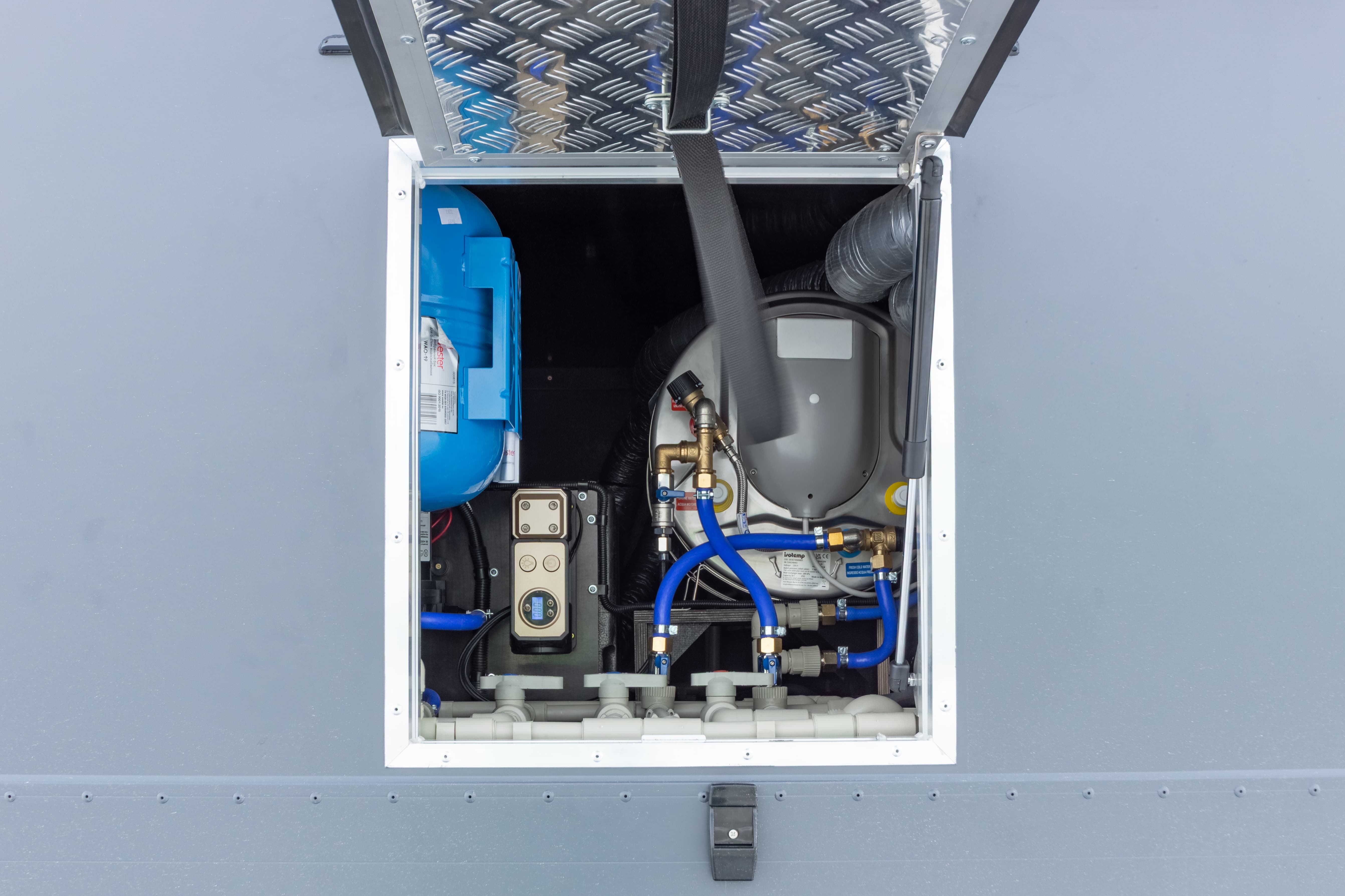 • Летний душ снаружи фургона. Лючок с кранами и душевой лейкой