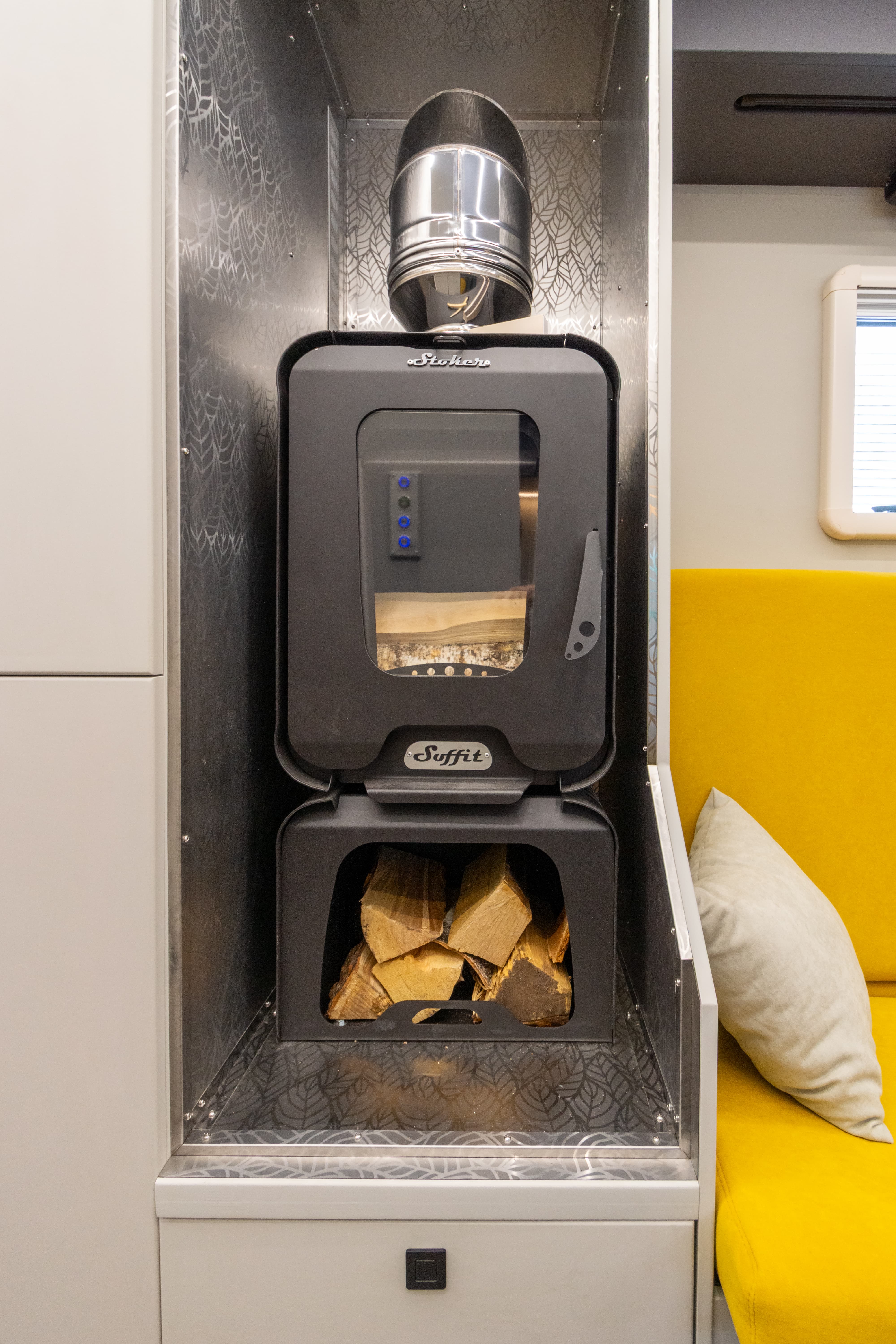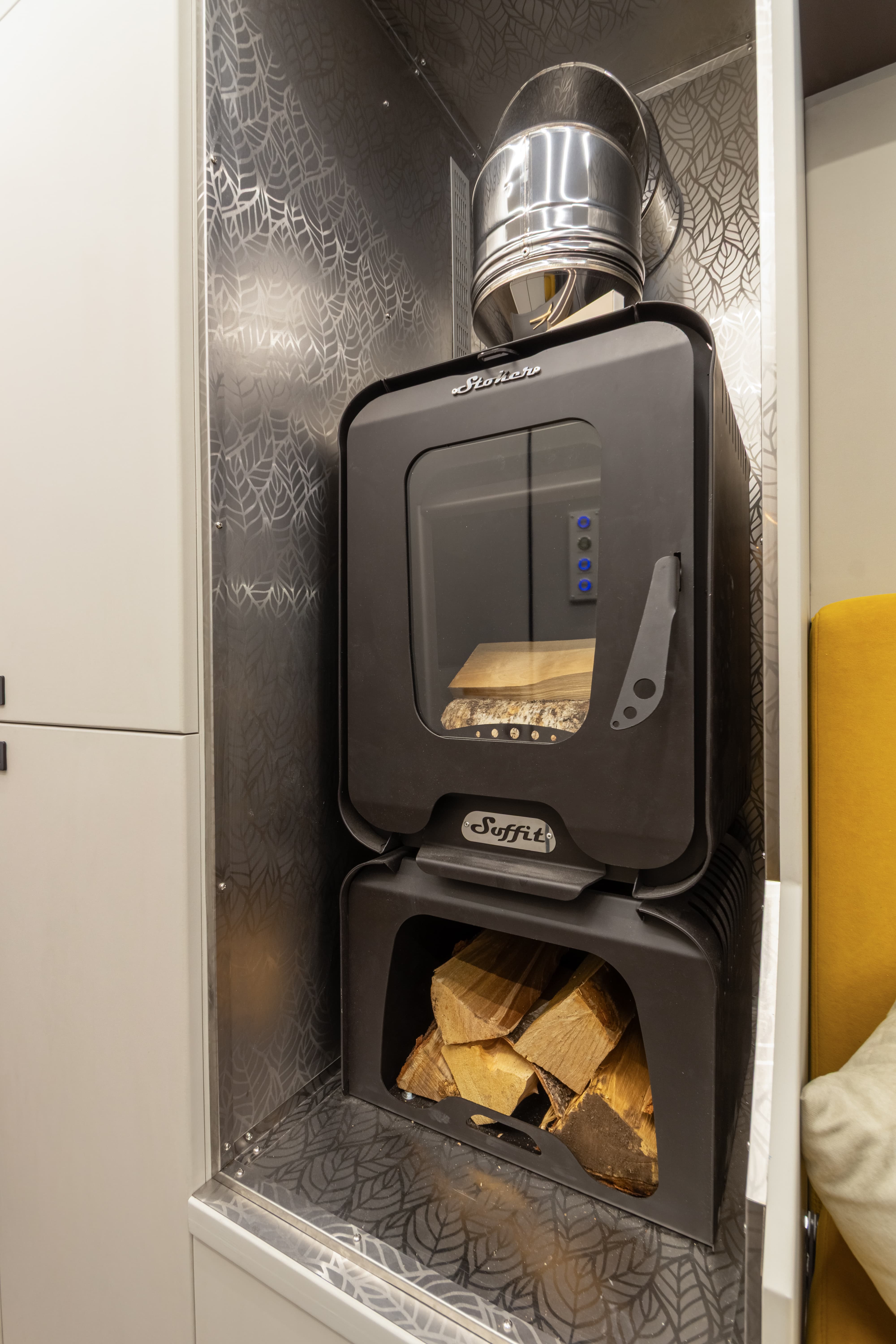 • Ящик для дров под печкой с возможностью загрузки снаружи и внутри