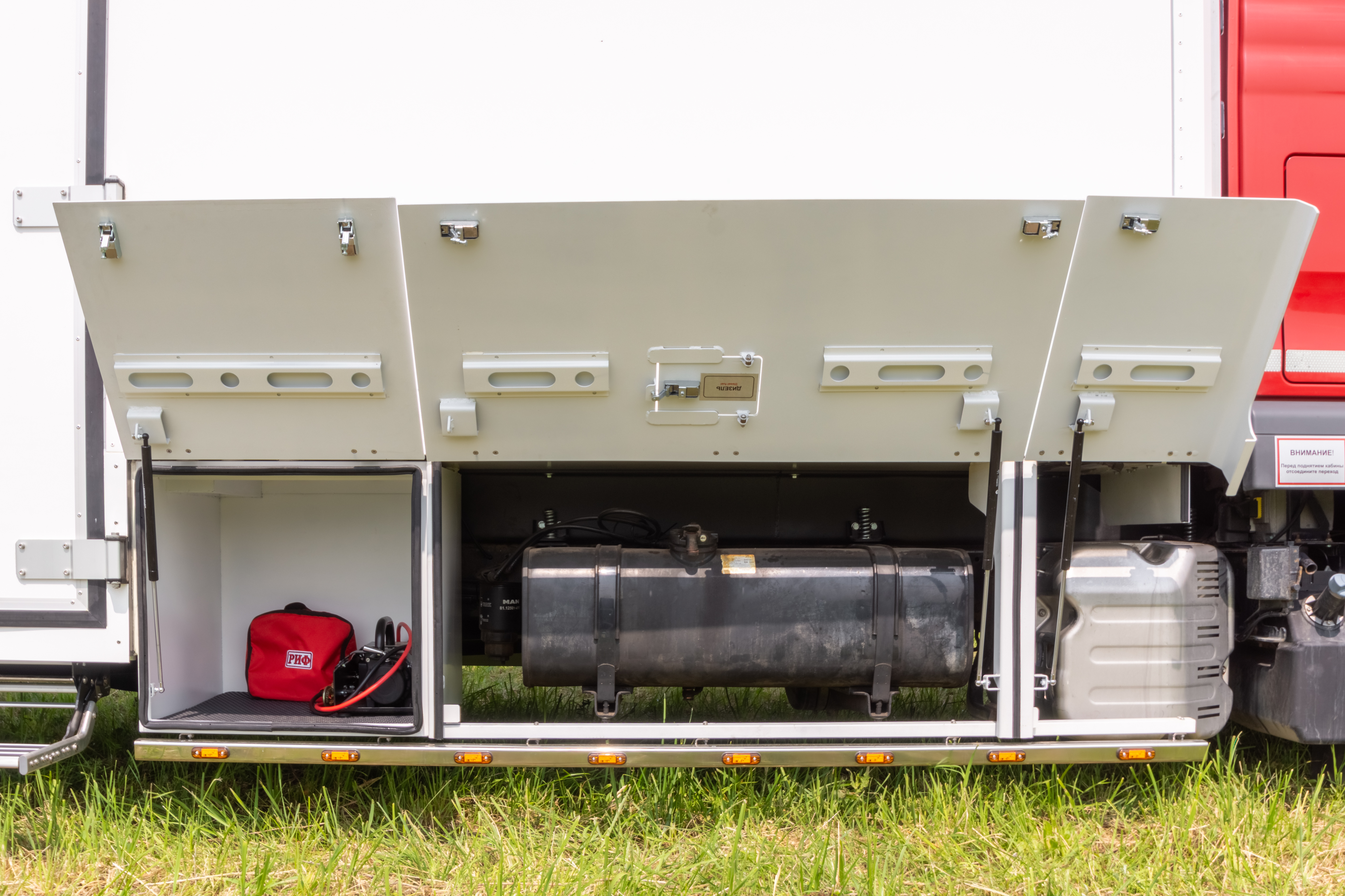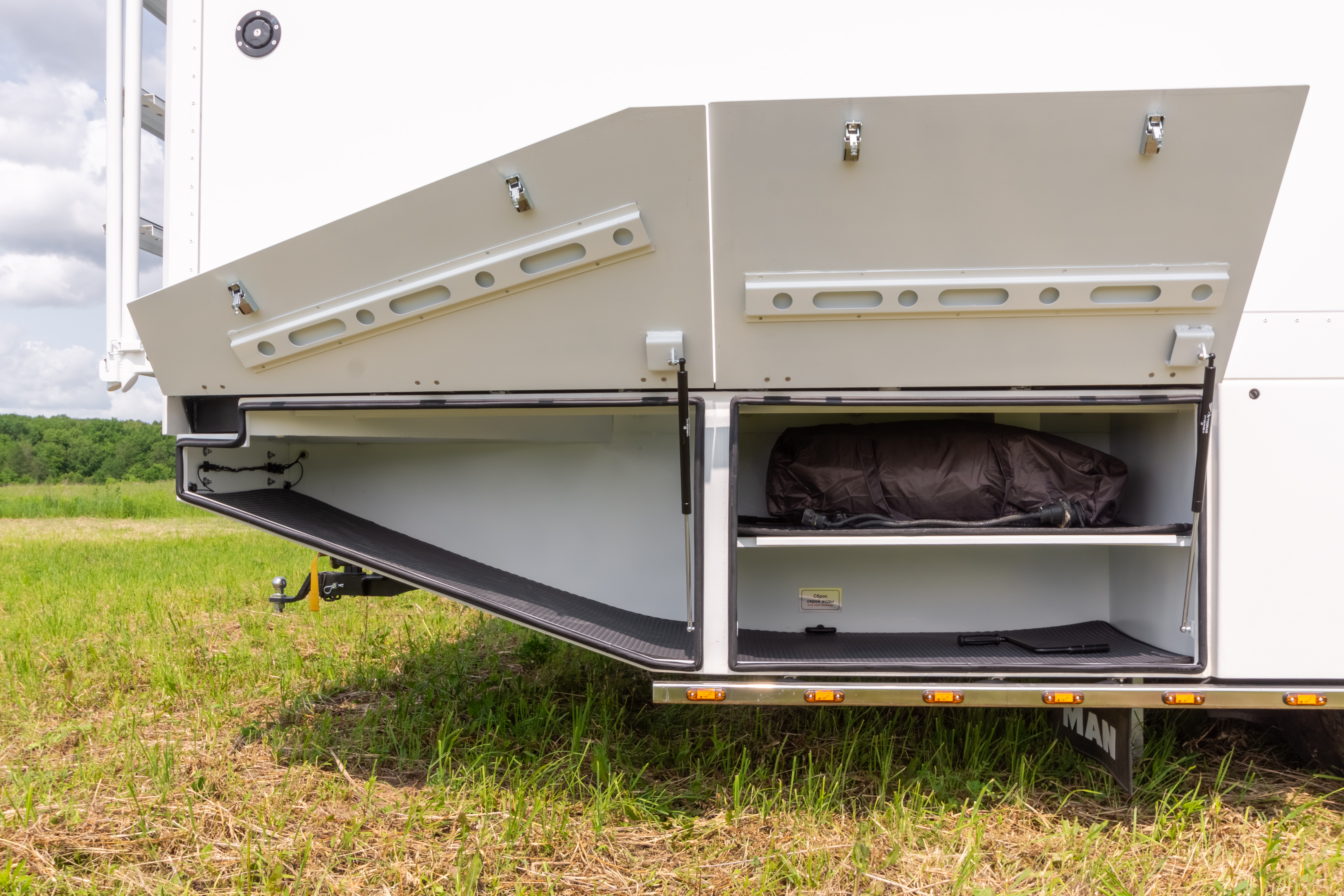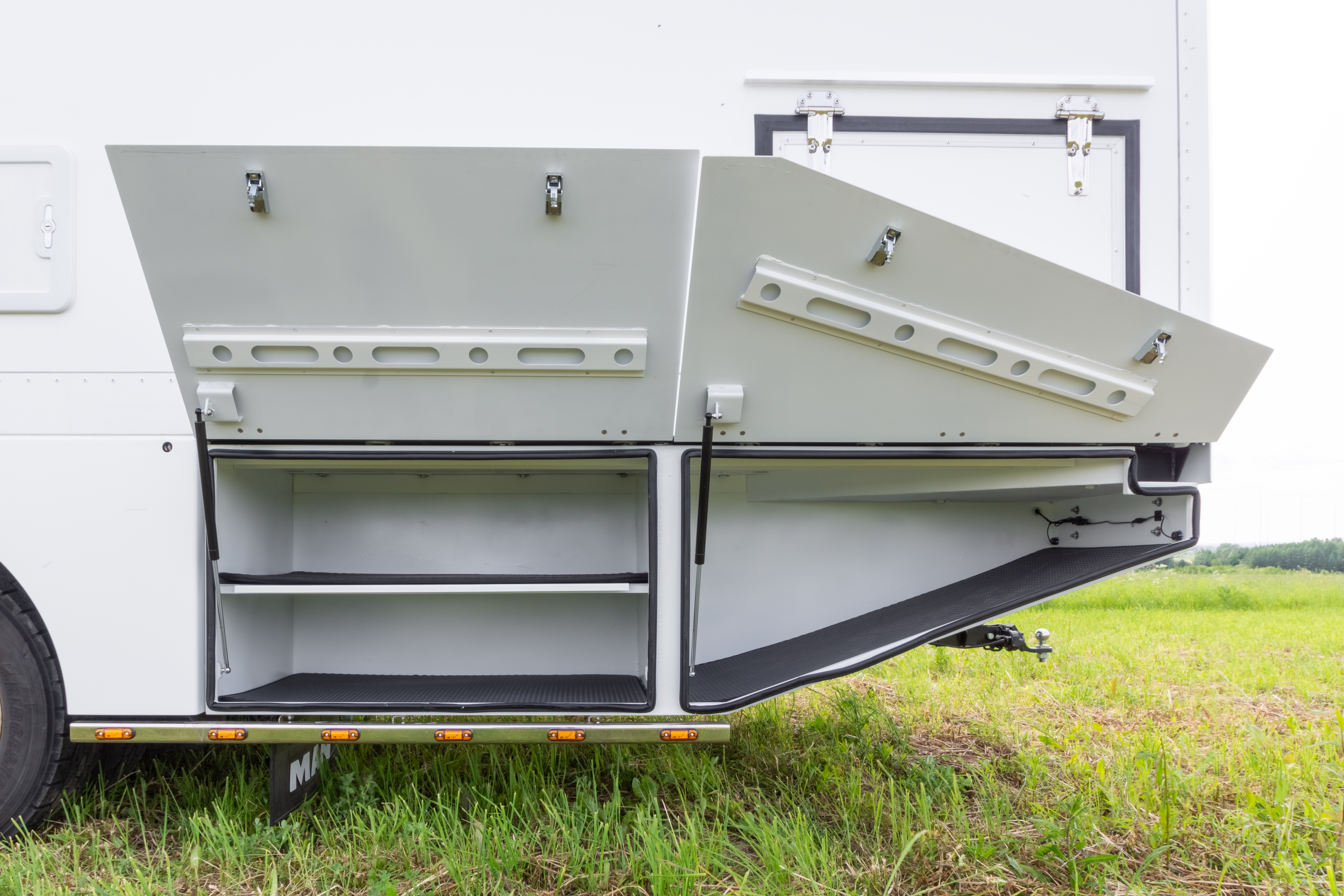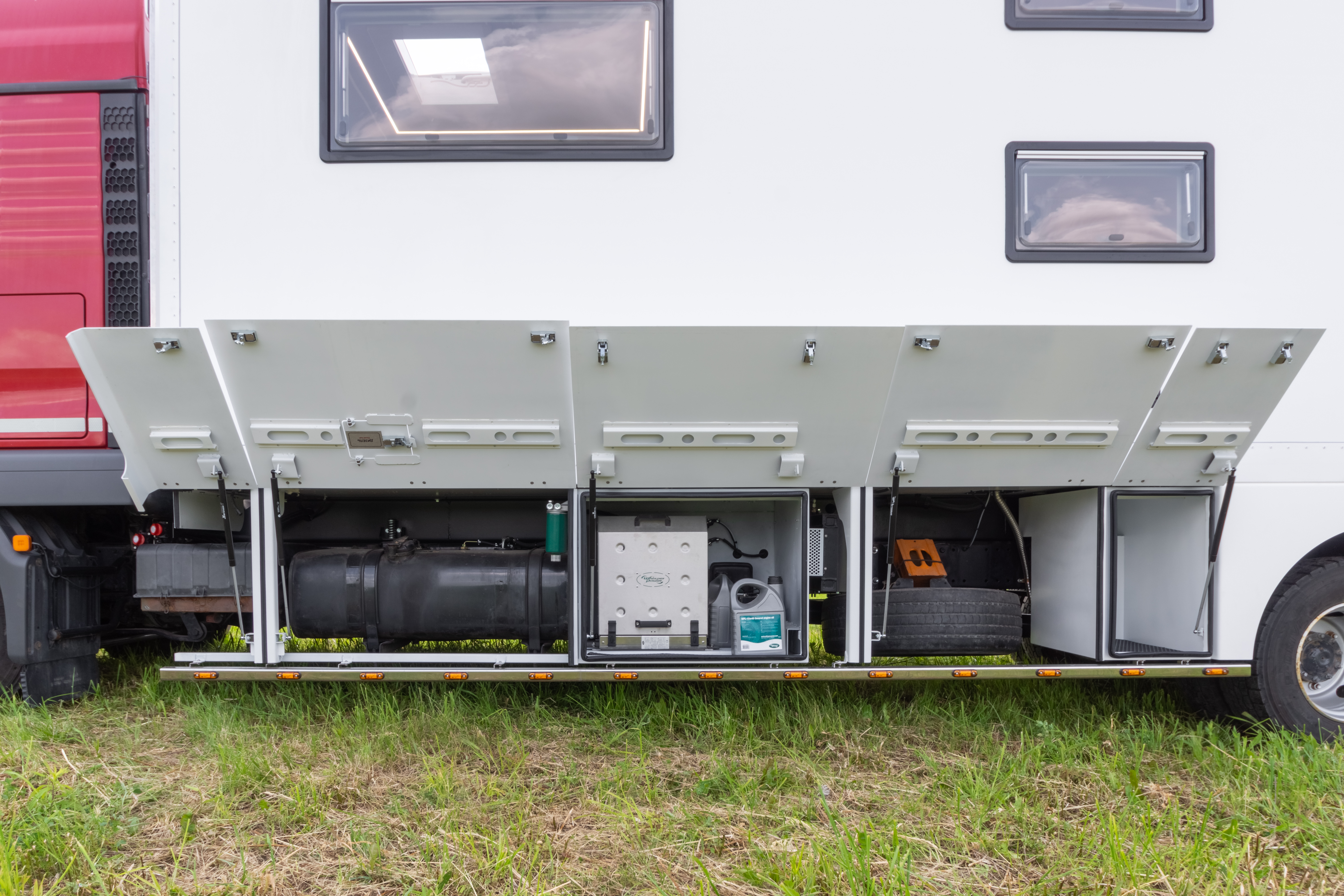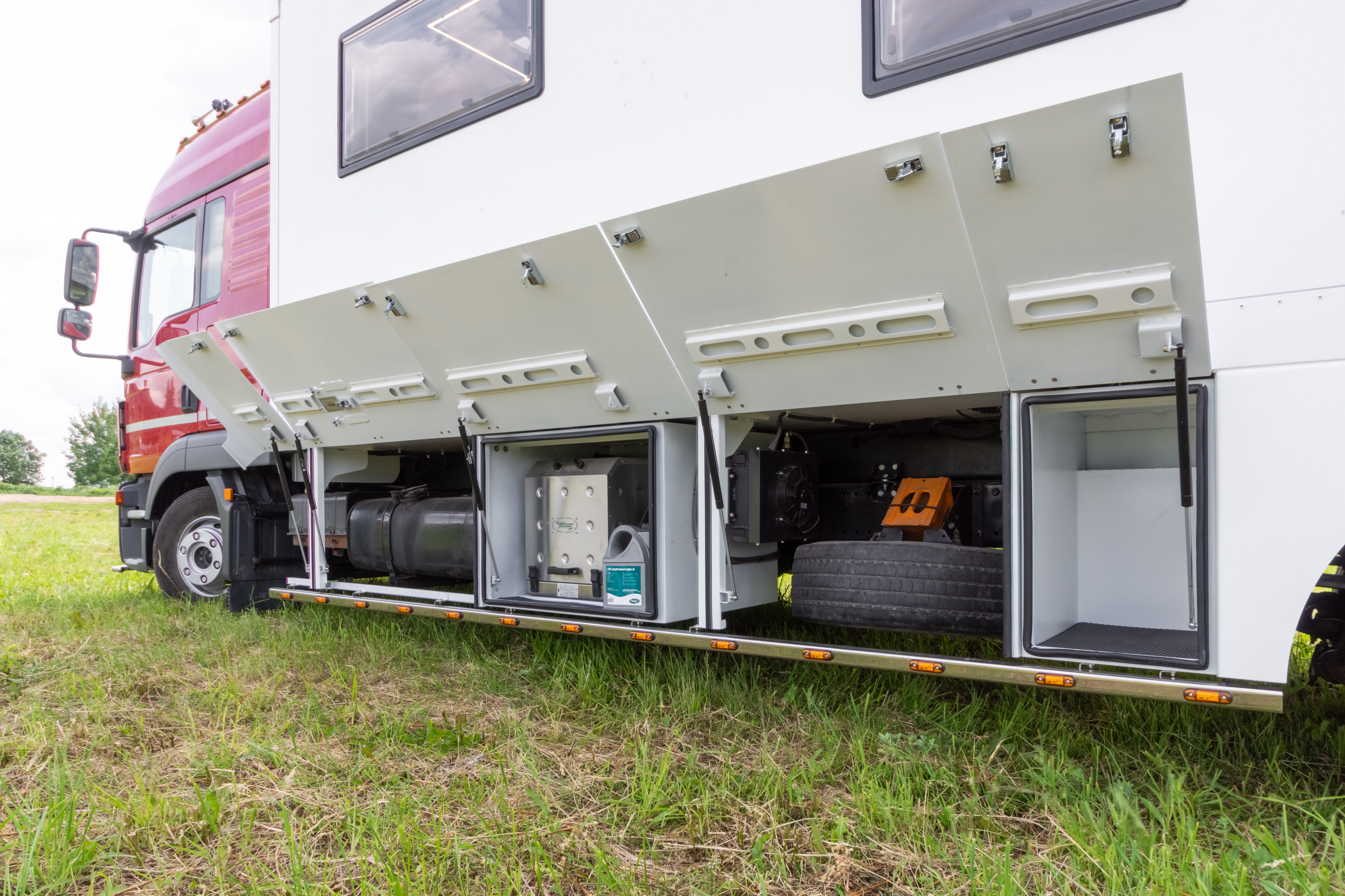 • Фальш-панели из алюминия на каркасе из нержавеющей стали по периметру автодома с местами установки габаритных огней + подъемные секции, закрывающие топливные баки, бак AdBlue, аккумуляторы и ресиверы.