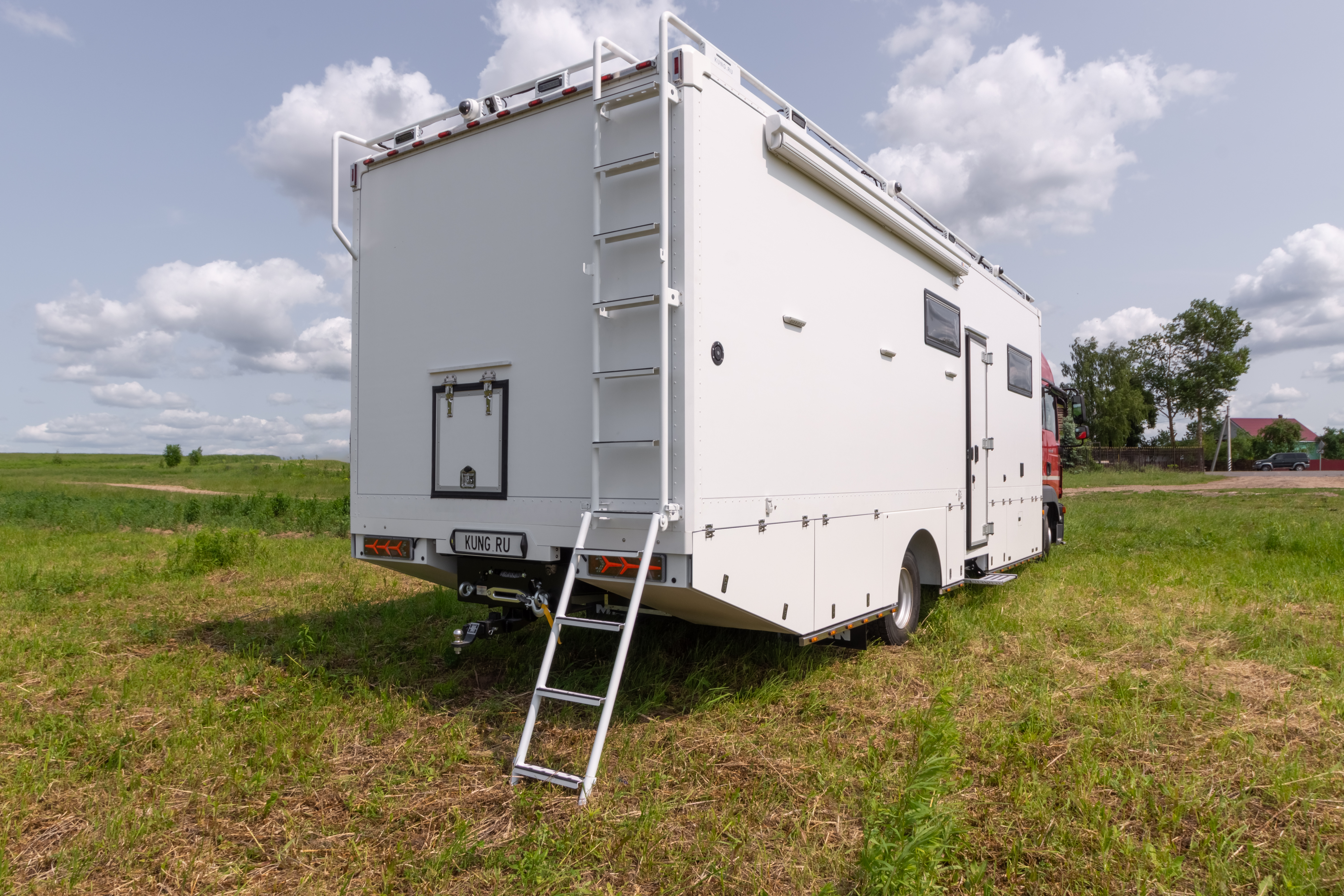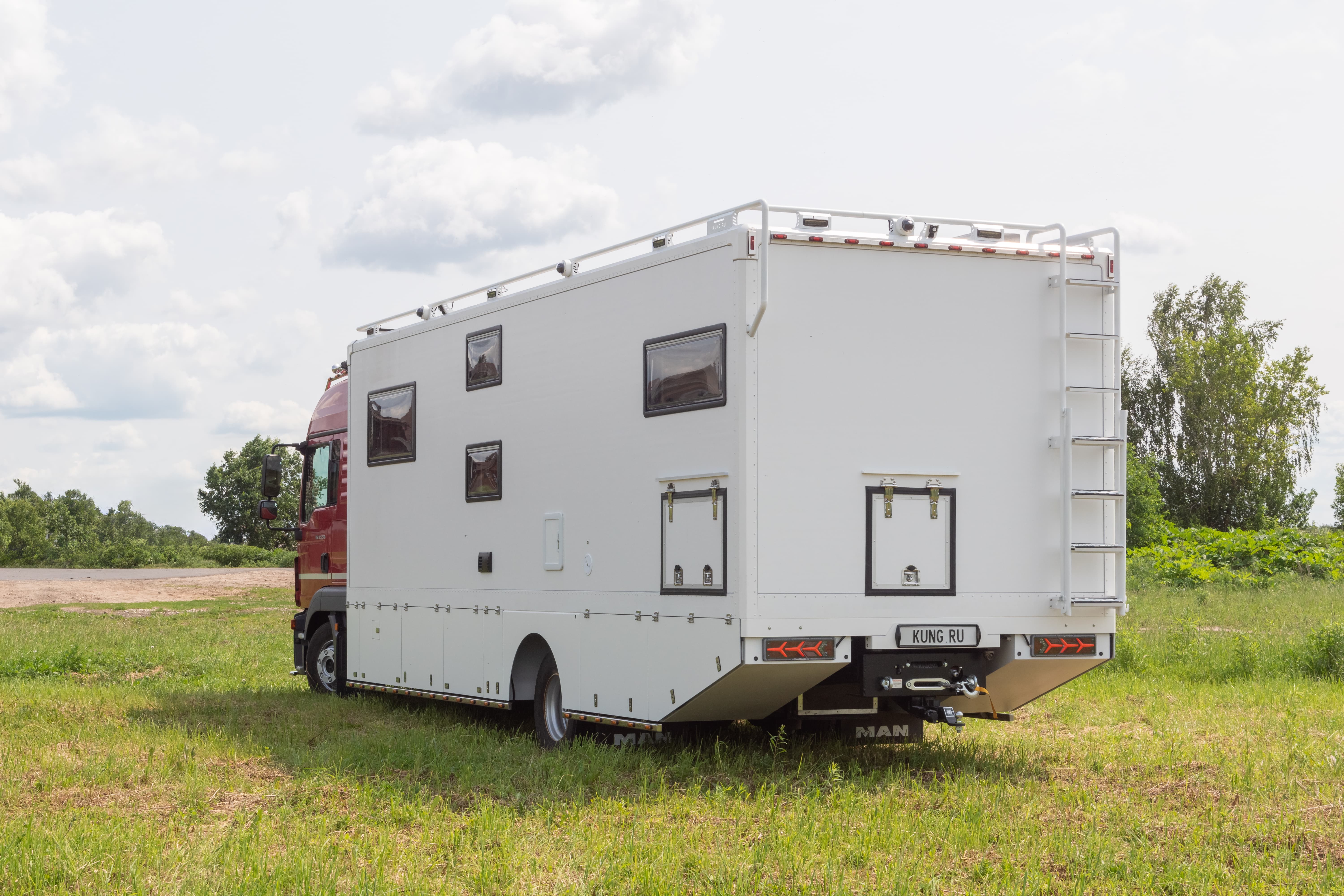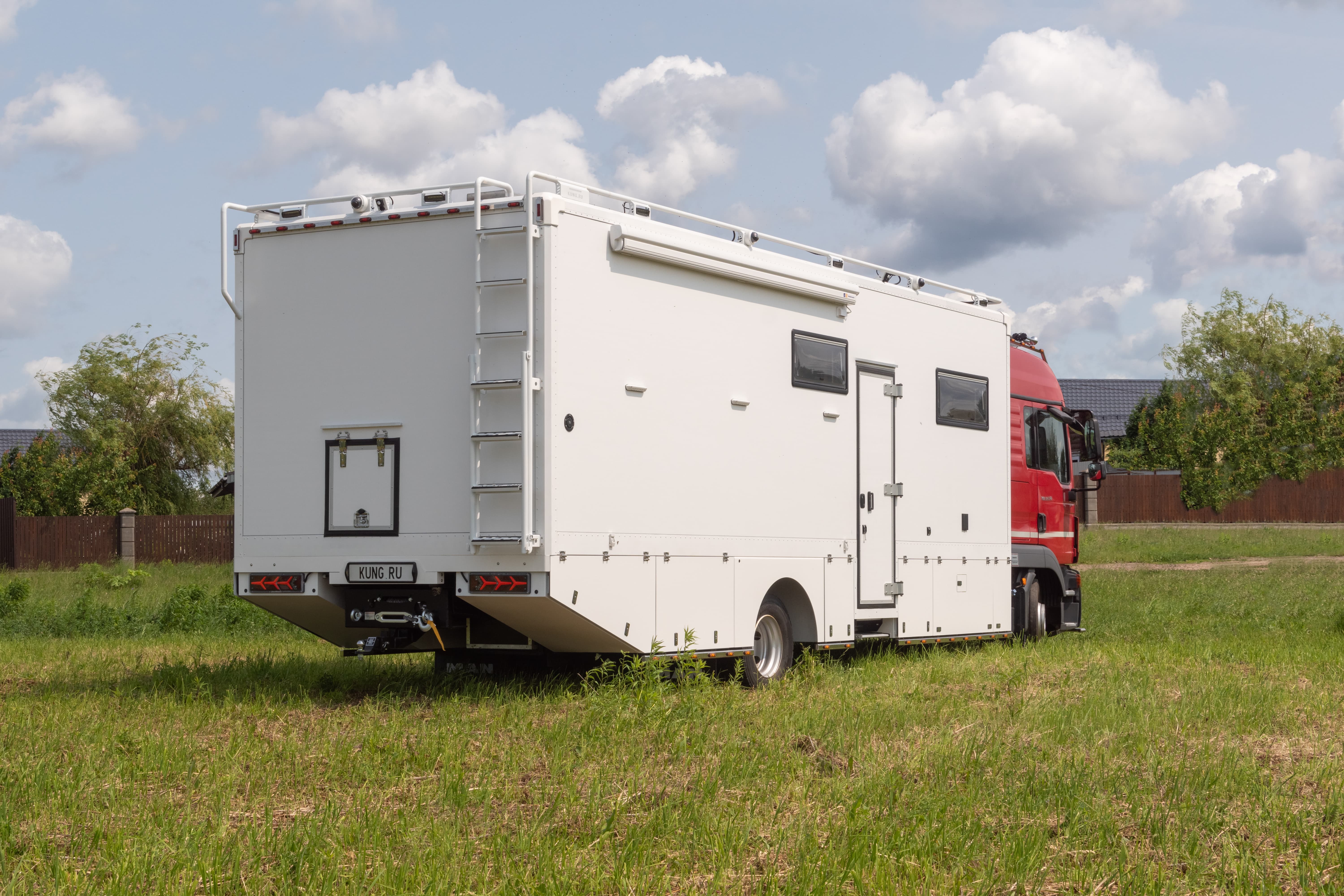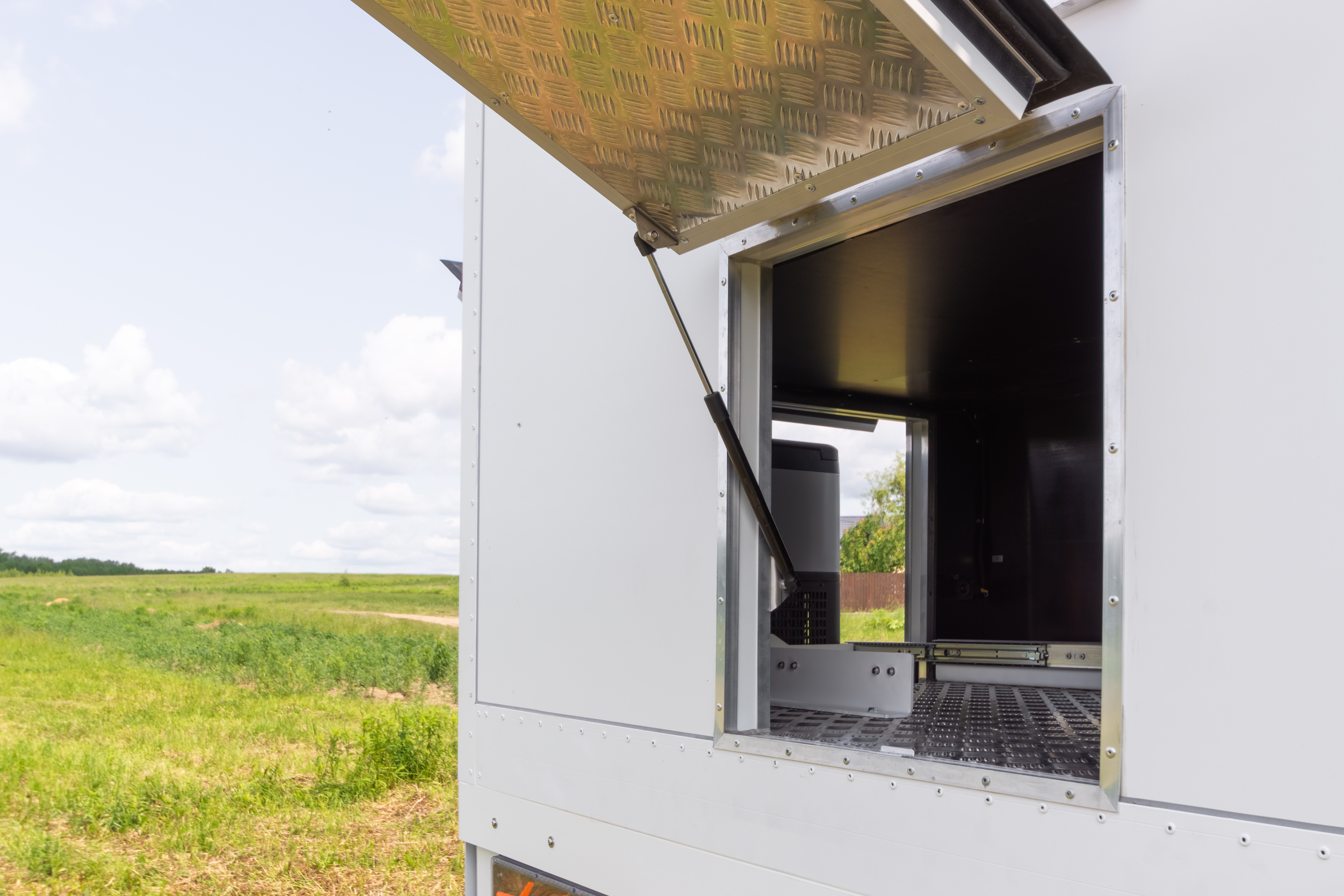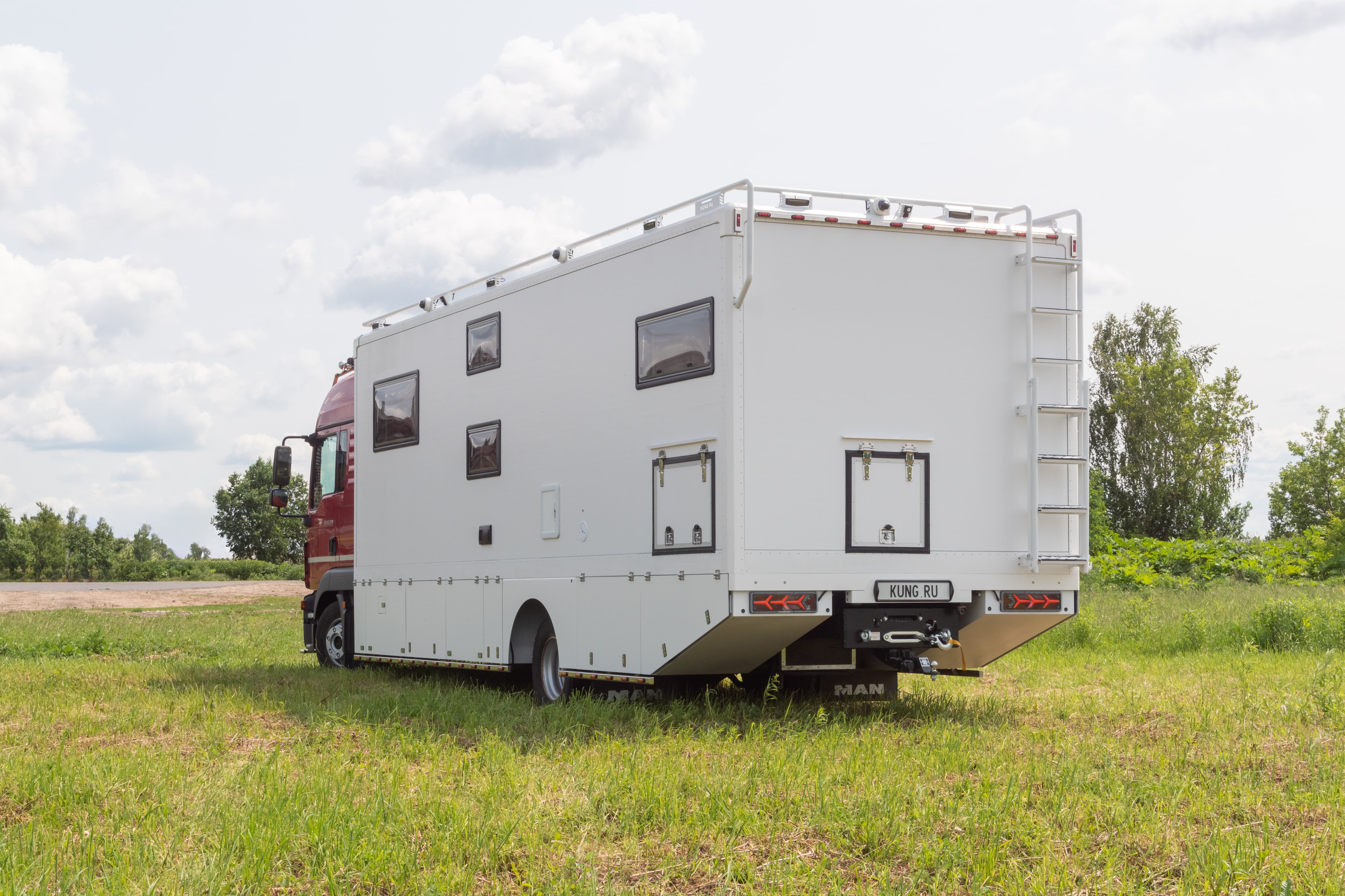 • Фальш-панели из алюминия на каркасе из нержавеющей стали по периметру автодома с местами установки габаритных огней + подъемные секции, закрывающие топливные баки, бак AdBlue, аккумуляторы и ресиверы.