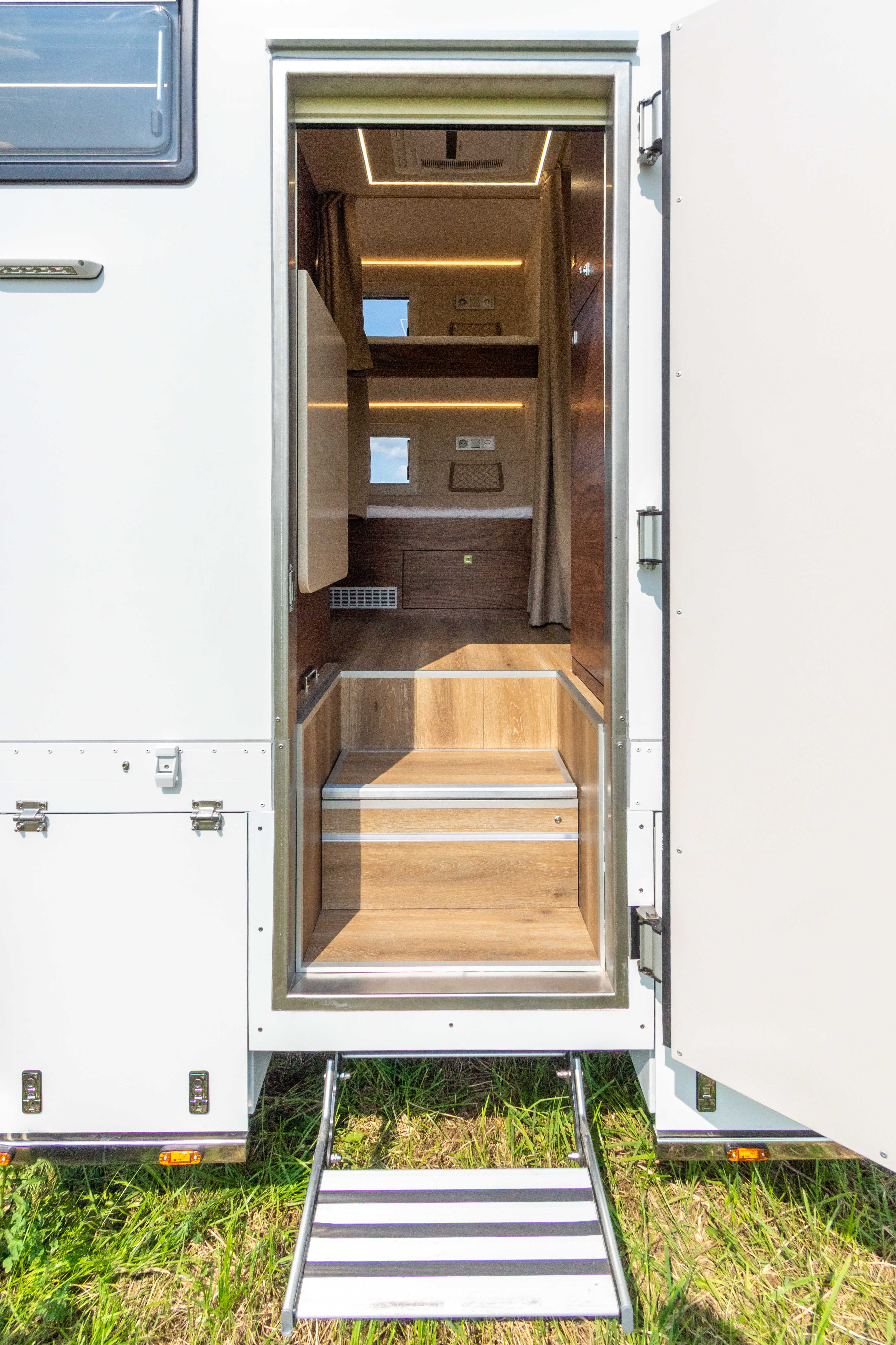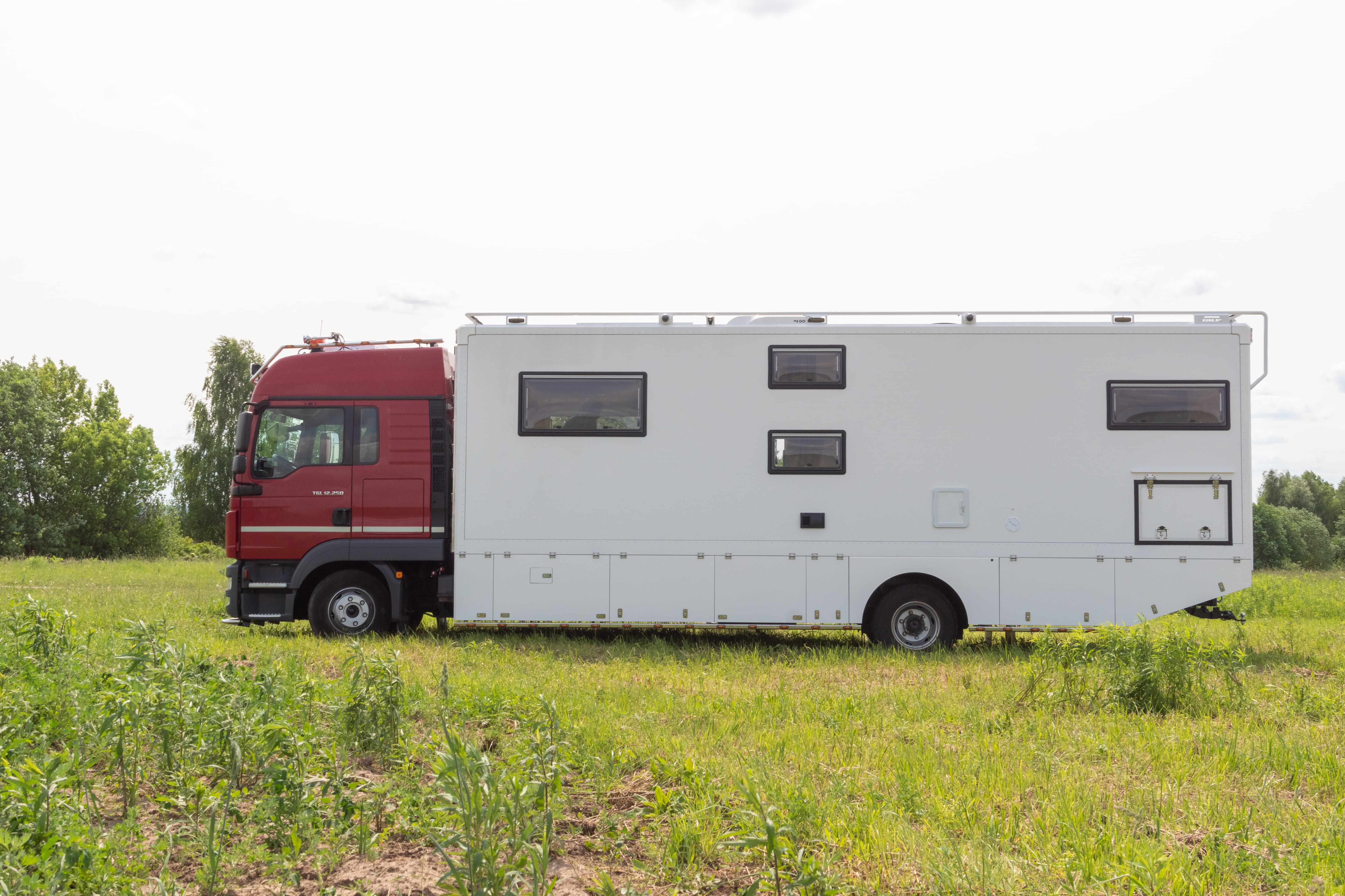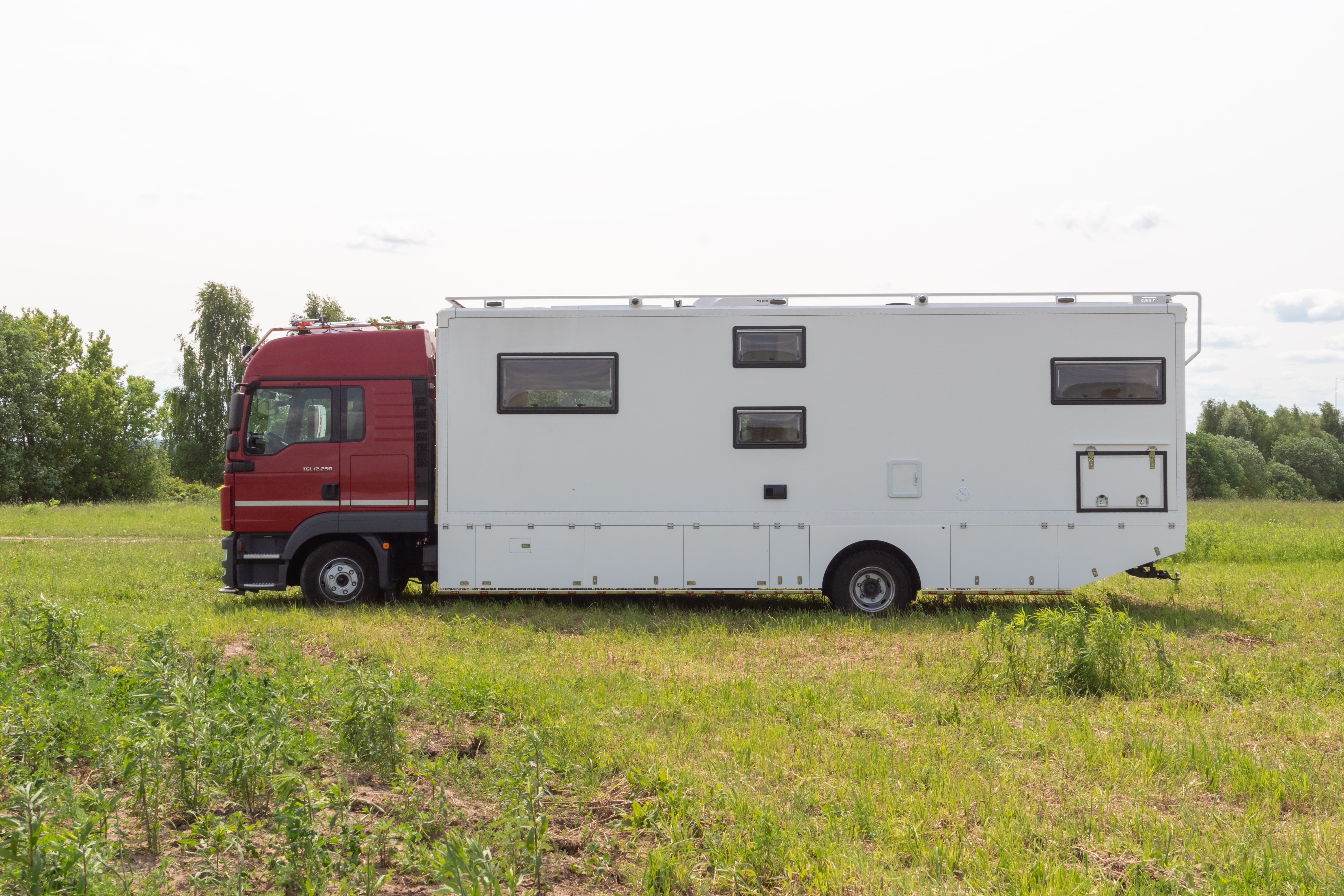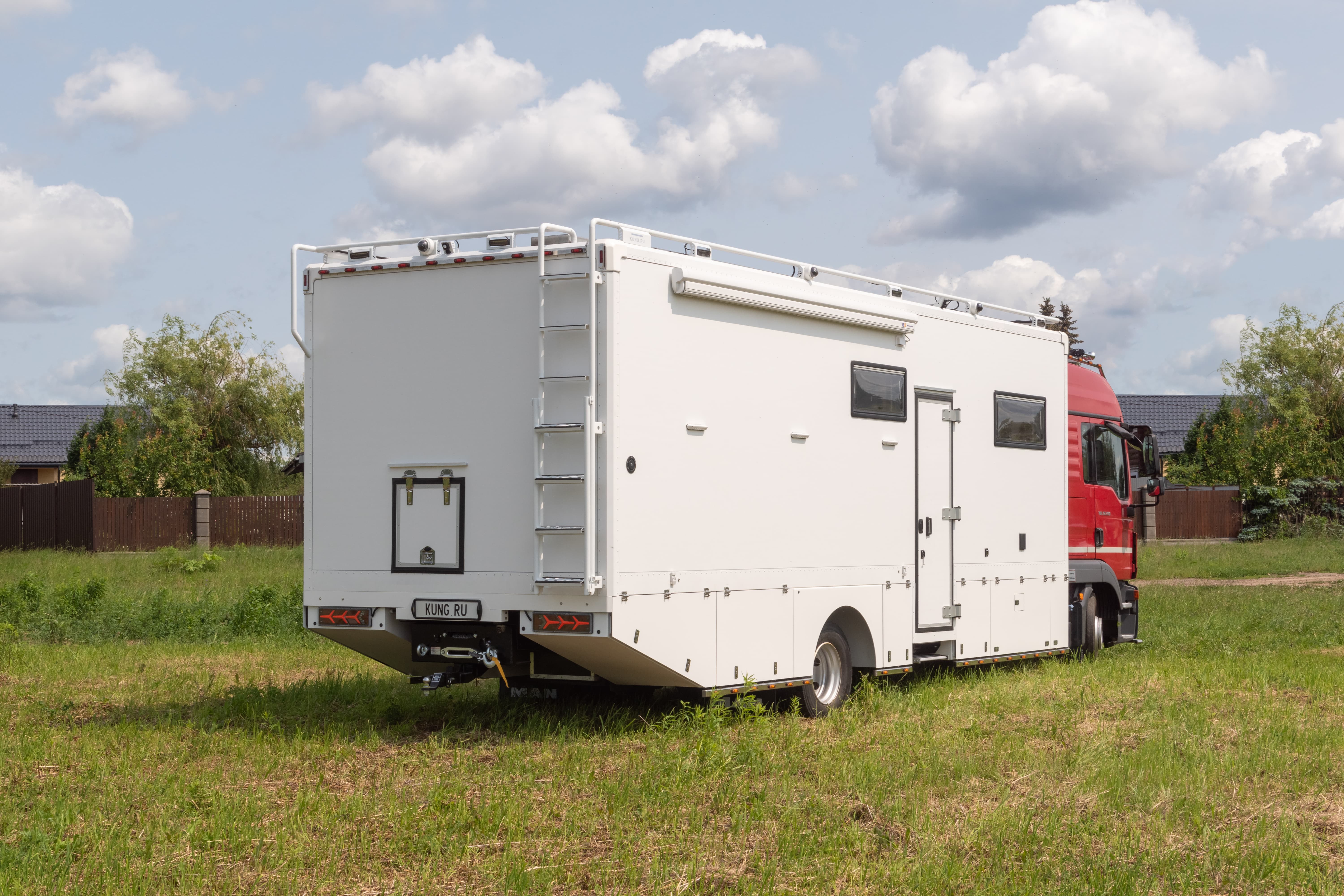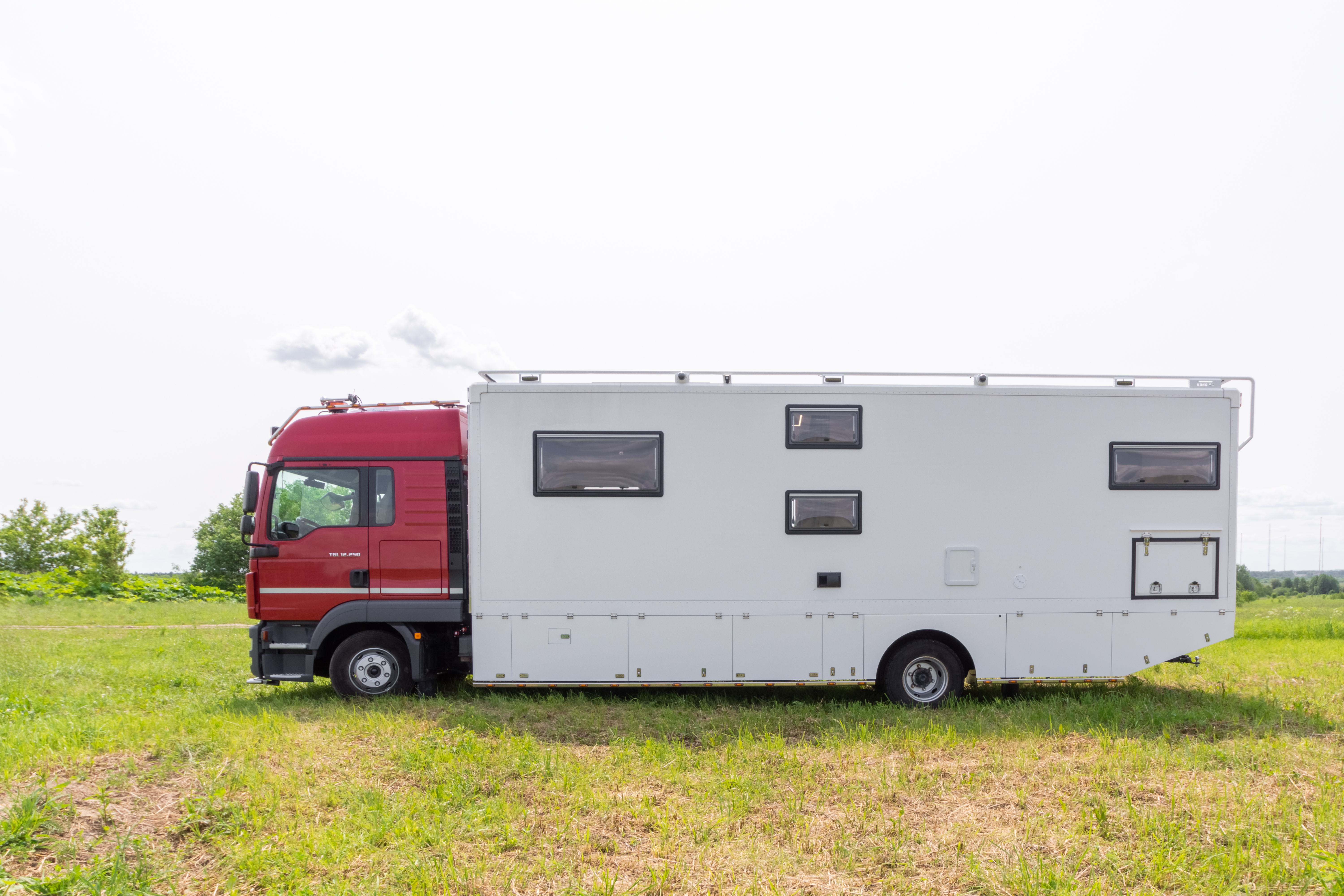 • Фальш-панели из алюминия на каркасе из нержавеющей стали по периметру автодома с местами установки габаритных огней + подъемные секции, закрывающие топливные баки, бак AdBlue, аккумуляторы и ресиверы.