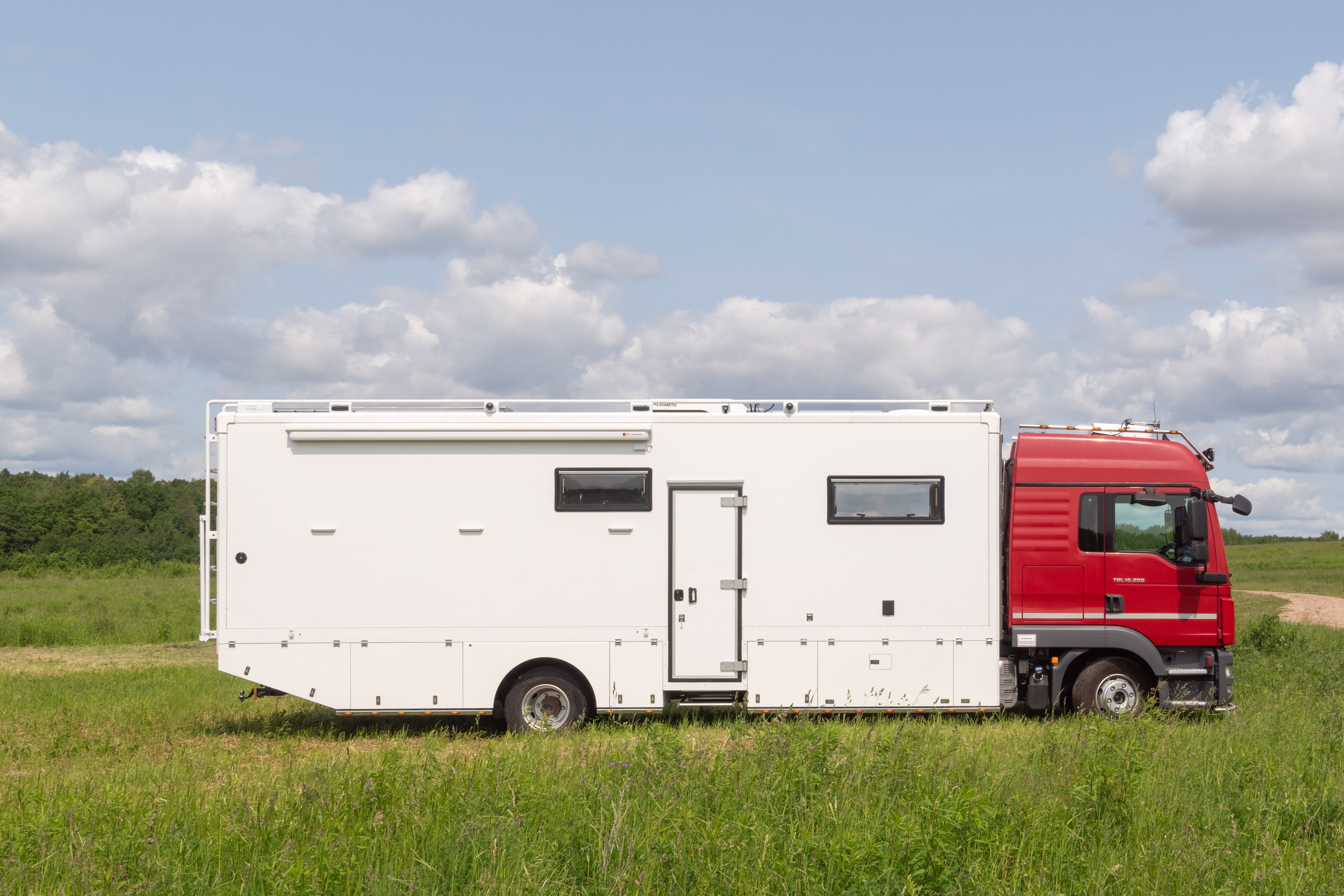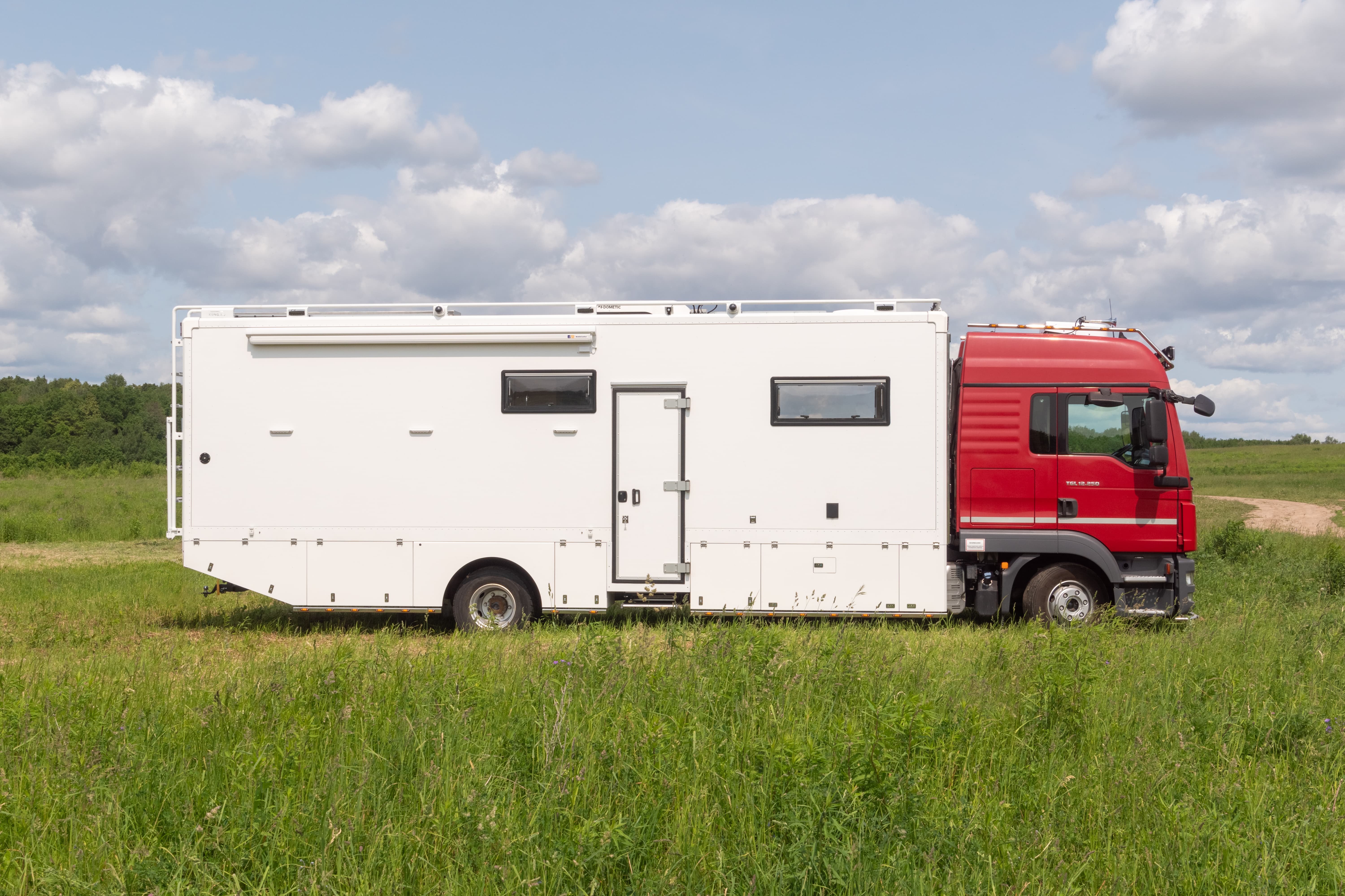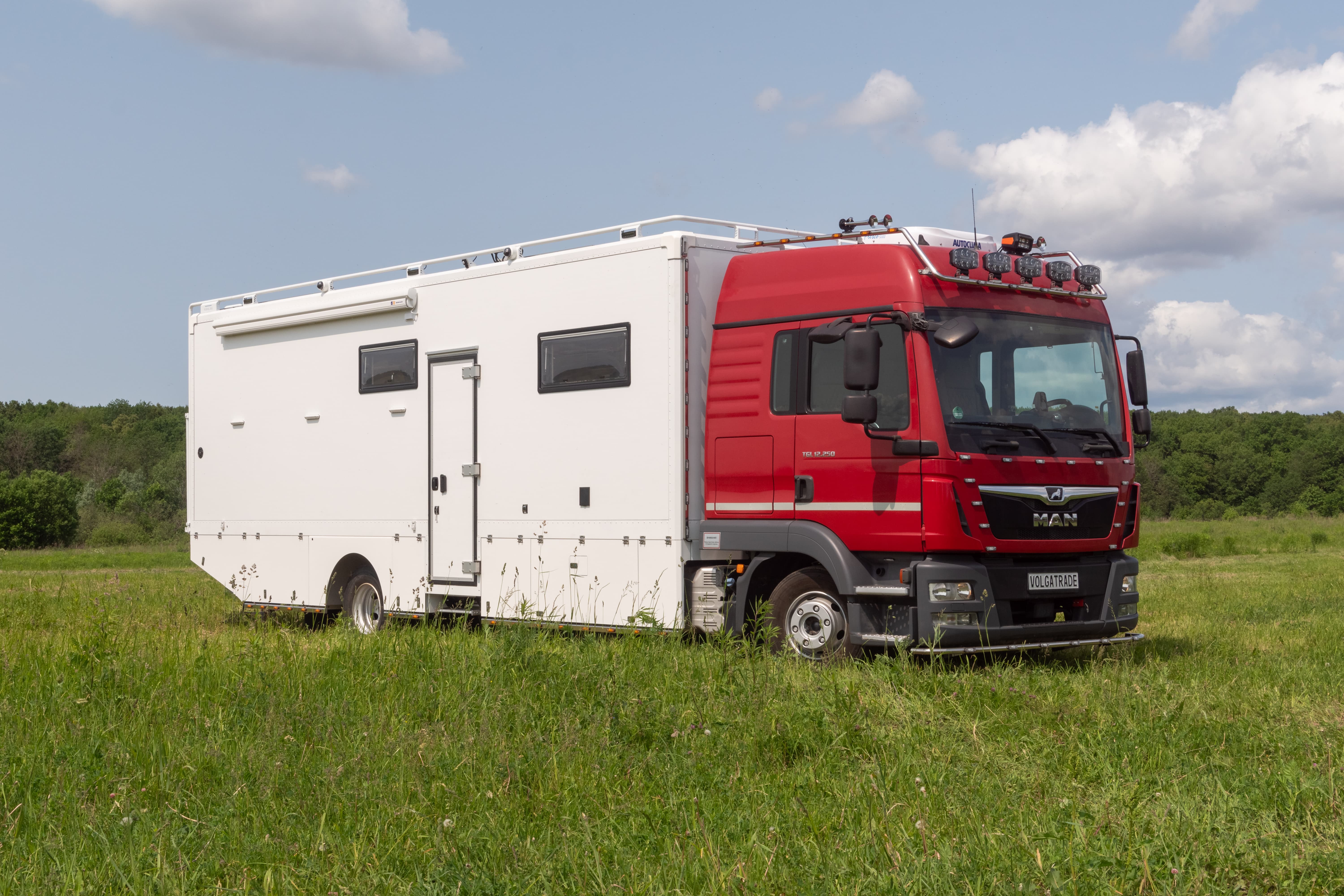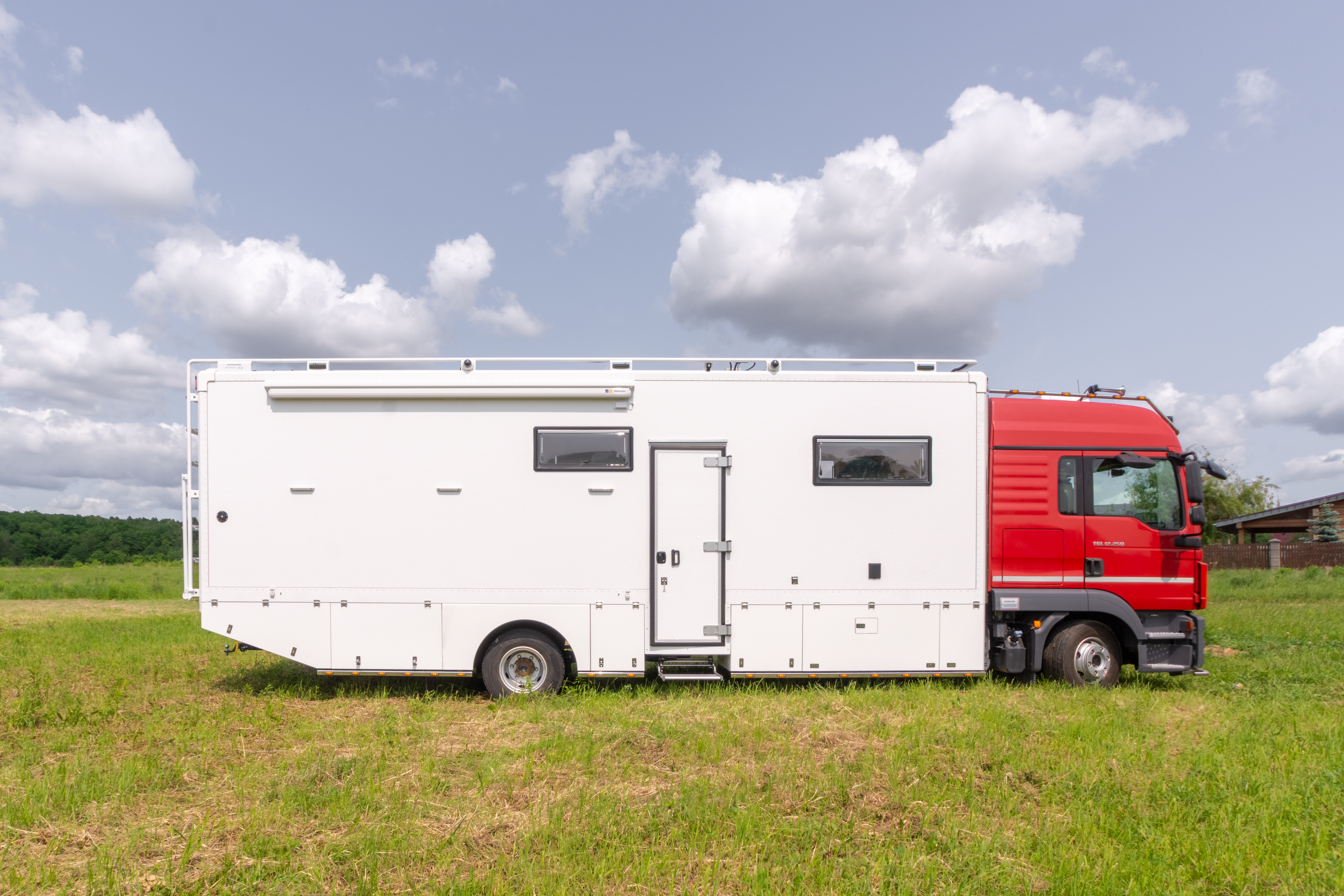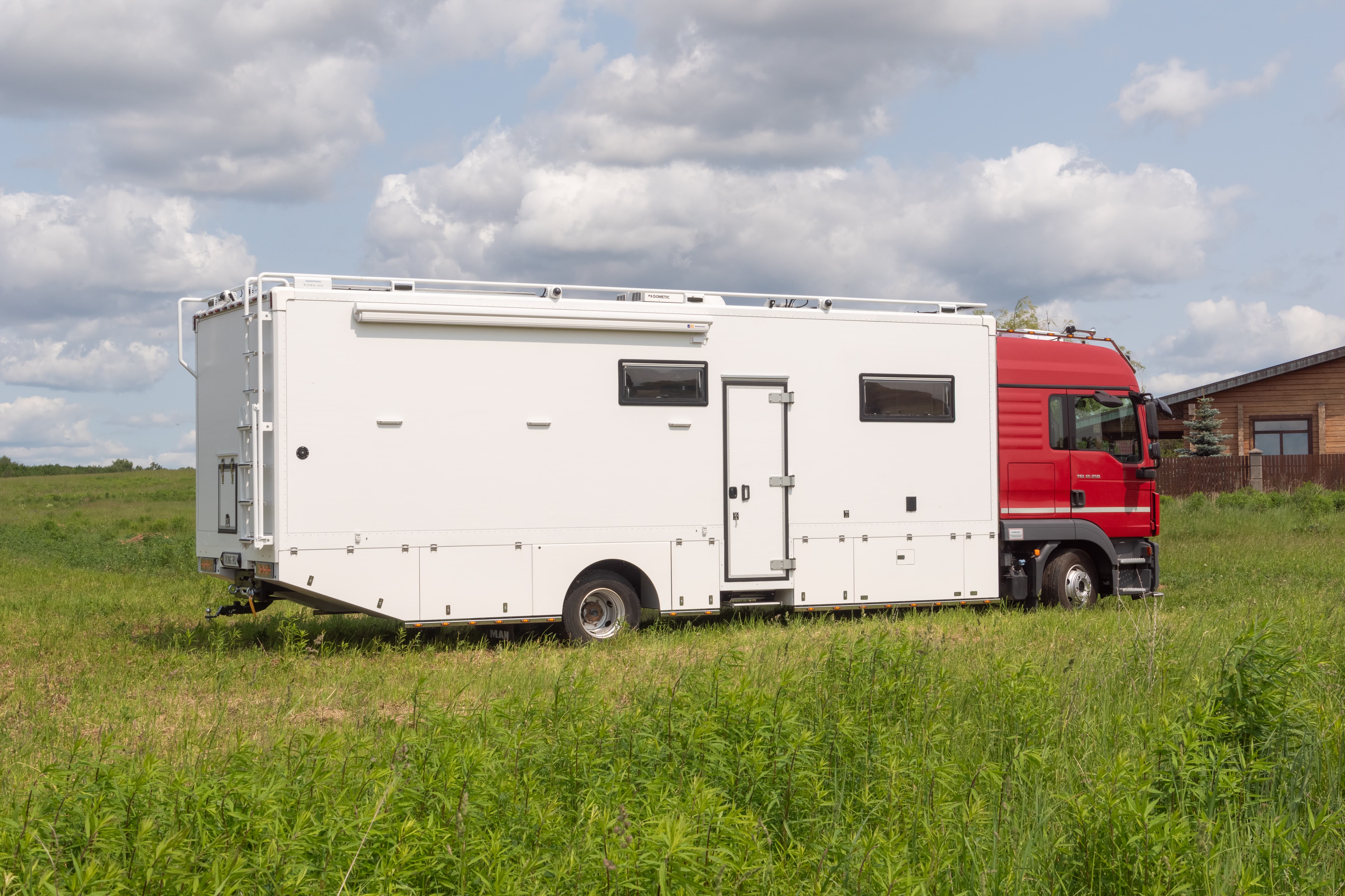 • Фальш-панели из алюминия на каркасе из нержавеющей стали по периметру автодома с местами установки габаритных огней + подъемные секции, закрывающие топливные баки, бак AdBlue, аккумуляторы и ресиверы.