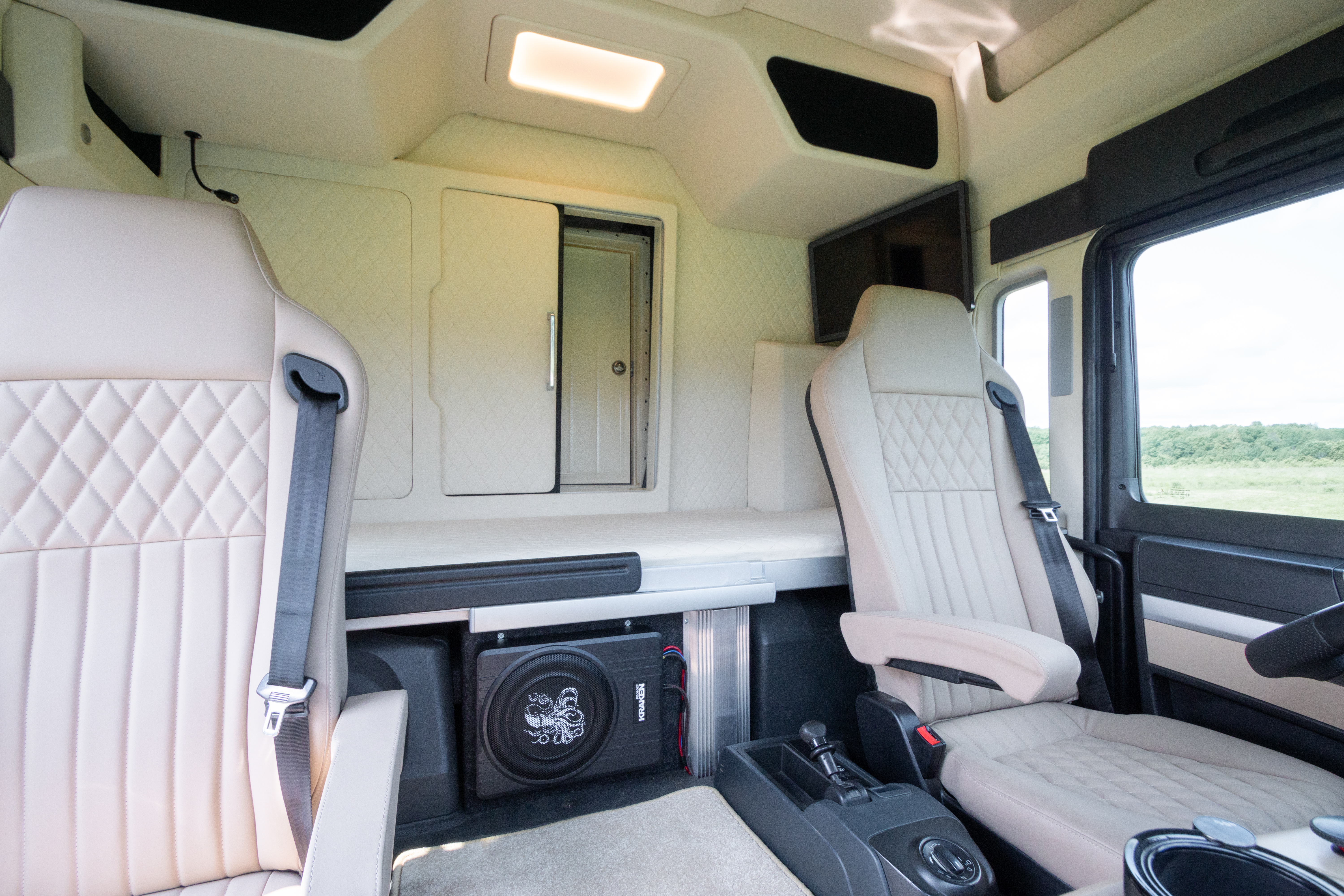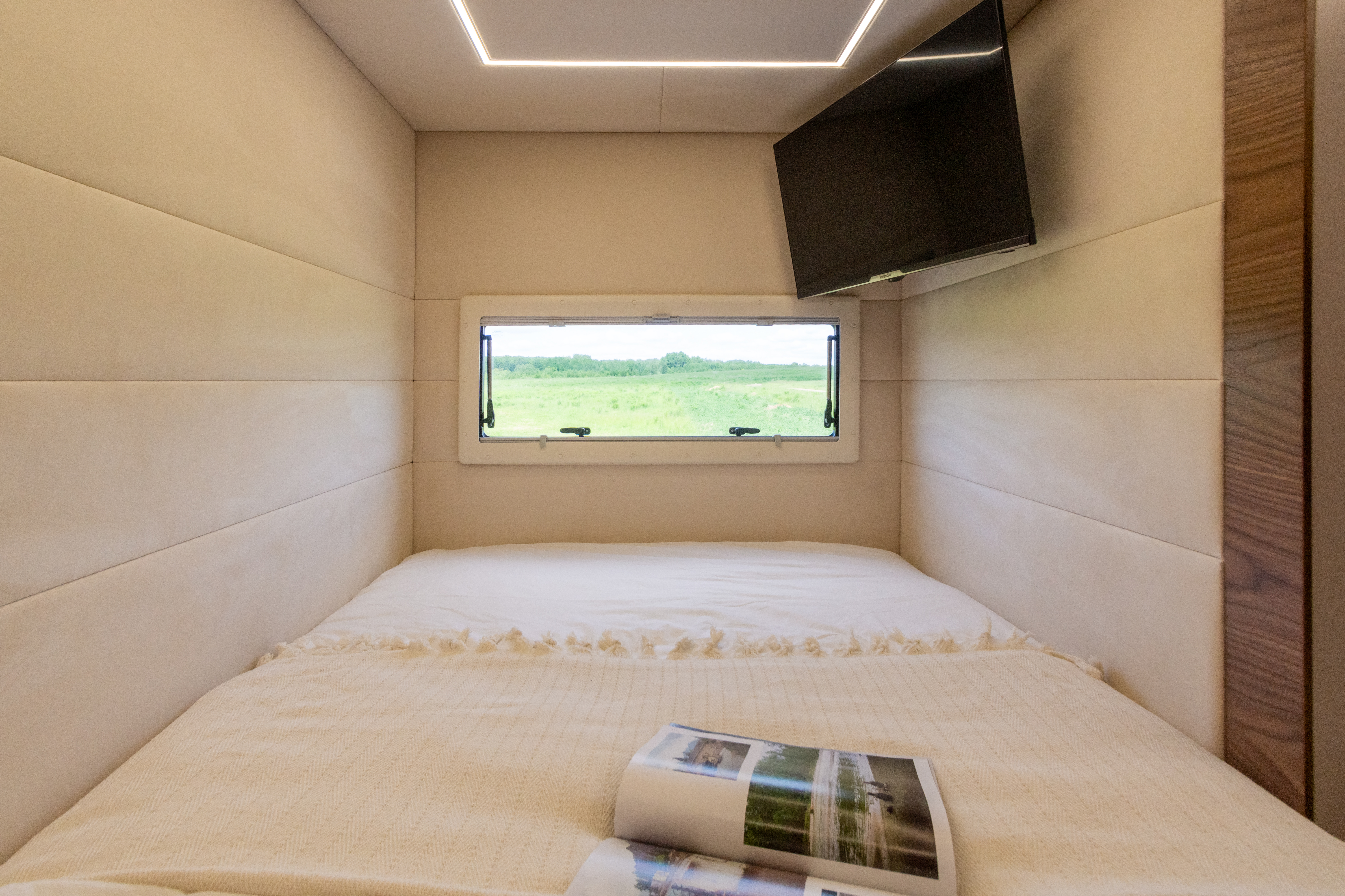 • Мягкая обивка стен и потолка внутри спального отсека: оклейка поролоном 5мм и перетяжка высококачественной искусственной замшей