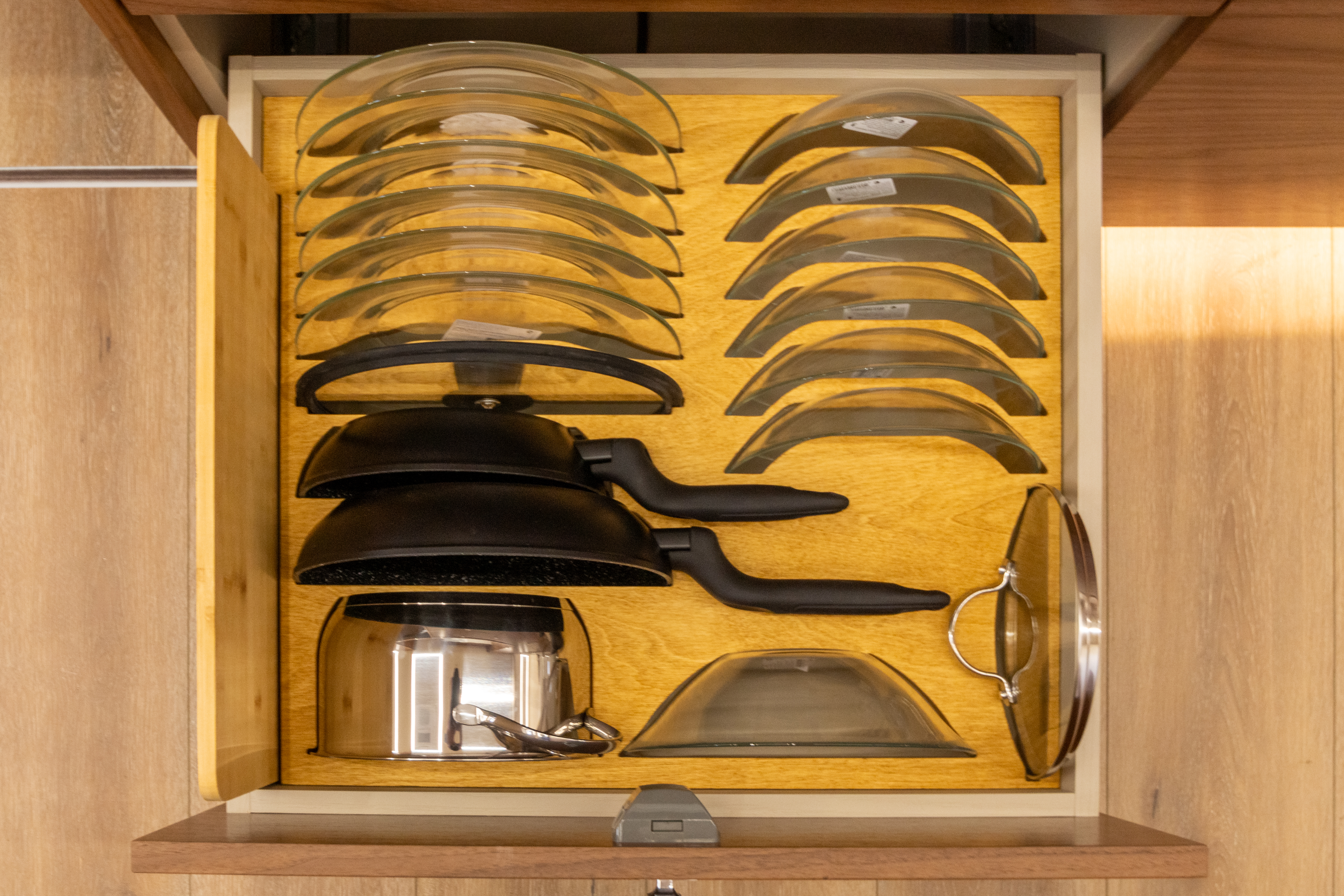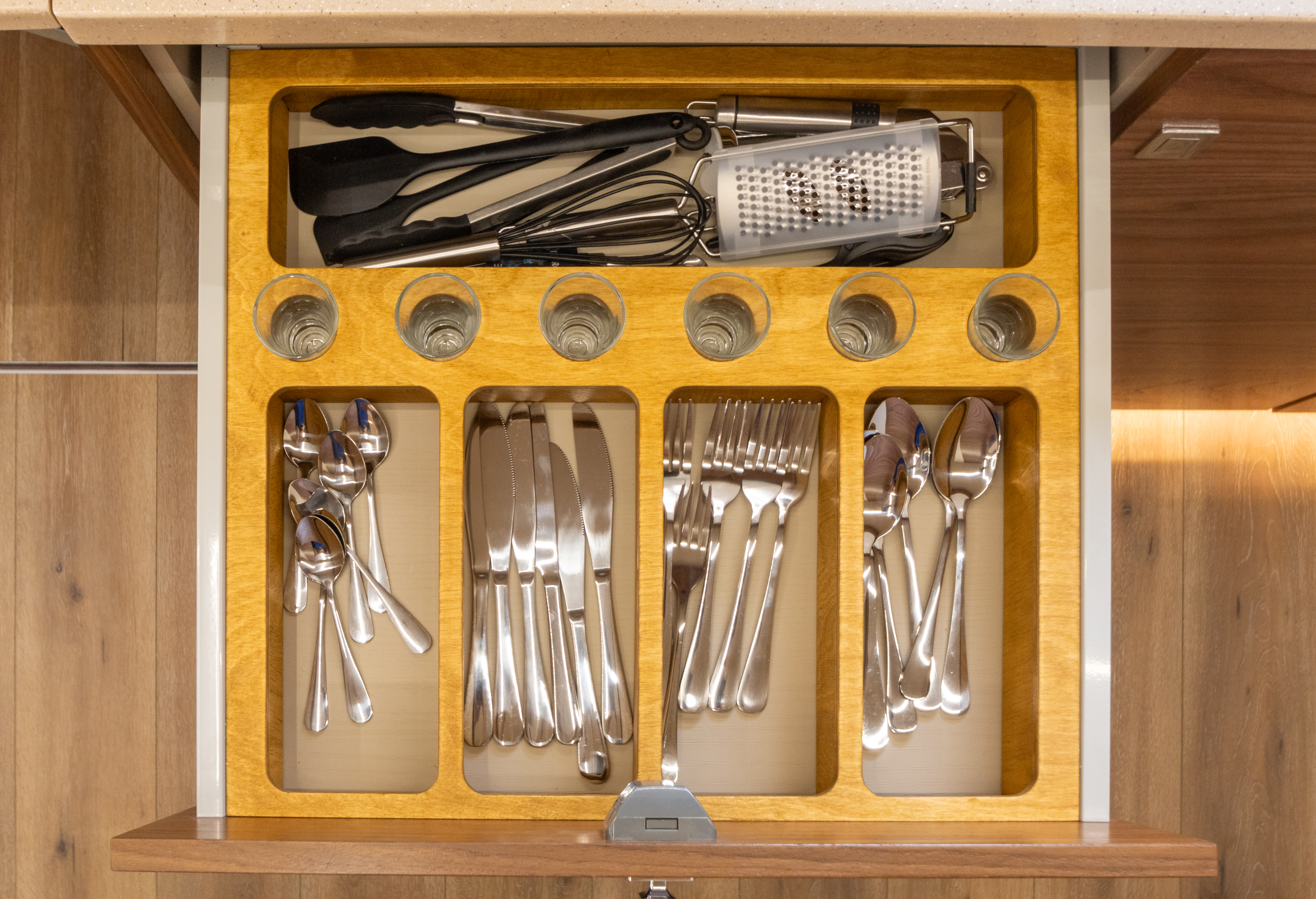 • Набор кухонной утвари с креплением в транспортном положении (кастрюля, 2 сковородки со съёмными ручками, разделочная доска, кухонные принадлежности, в том числе железные половник и шумовка)