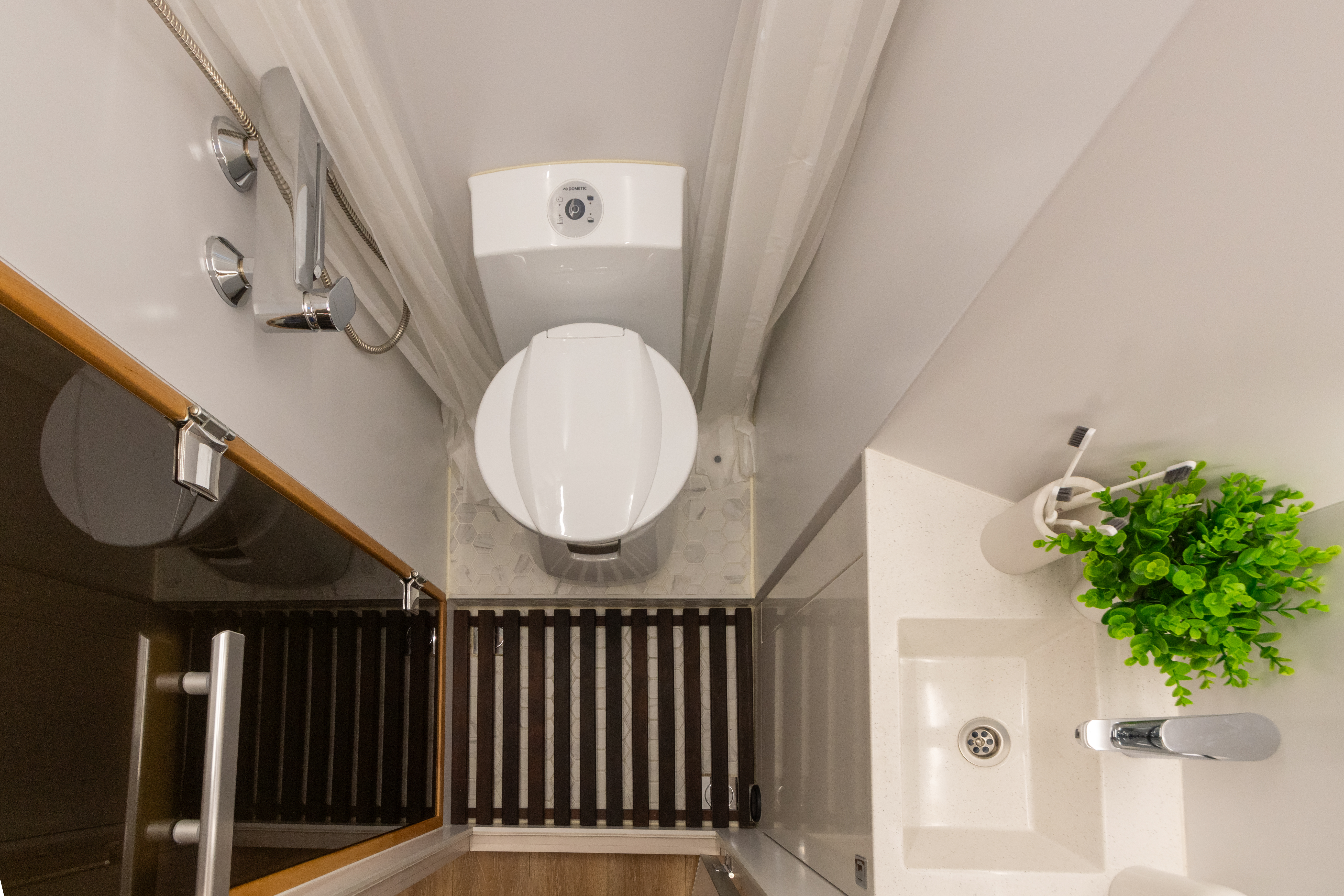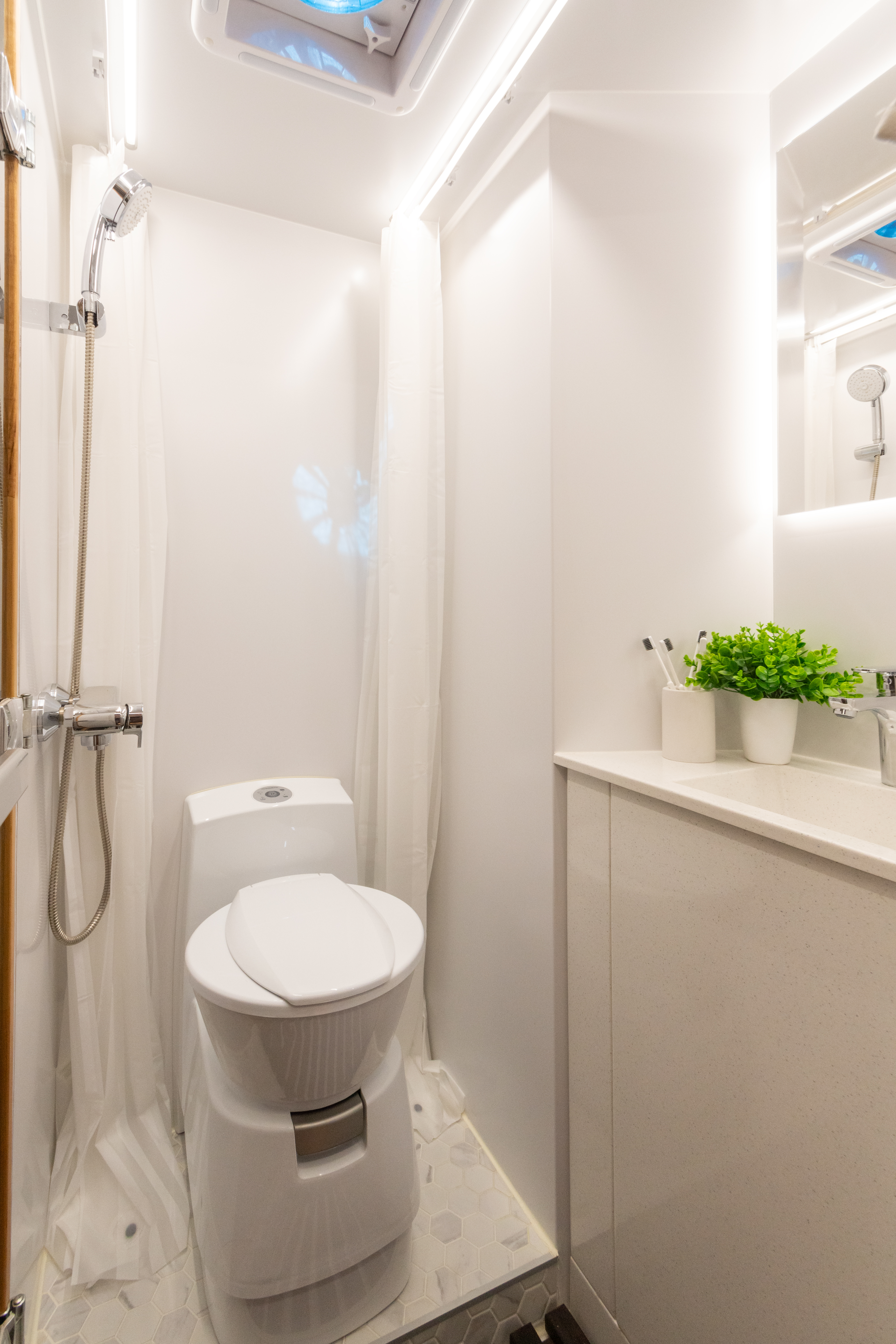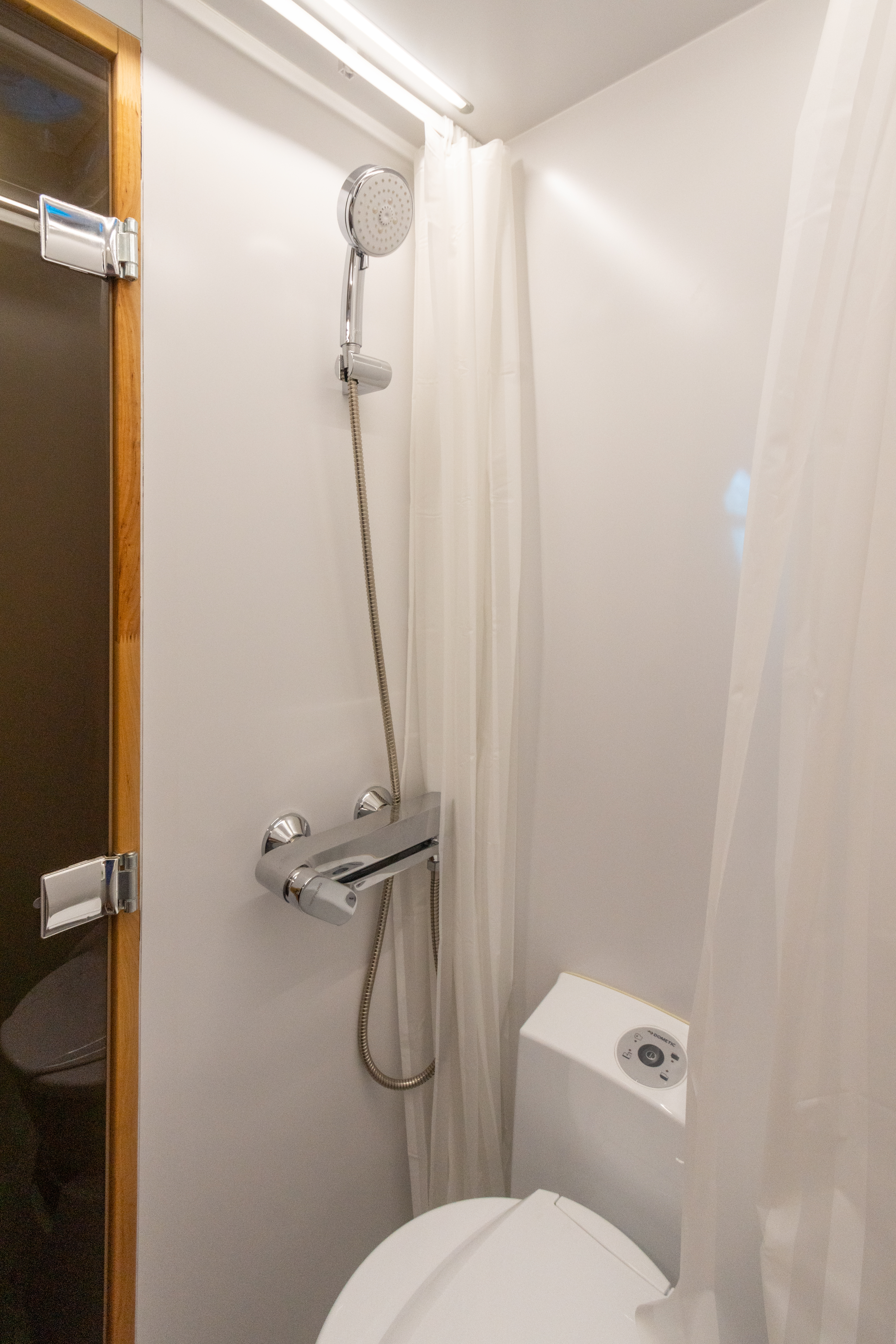 • Клапан вентиляции (приток и вытяжка воздуха) внизу под полком с электровентилятором, регулировка скорости – управление с кнопки, расположенной на входе в санузел (закрывается при движении)