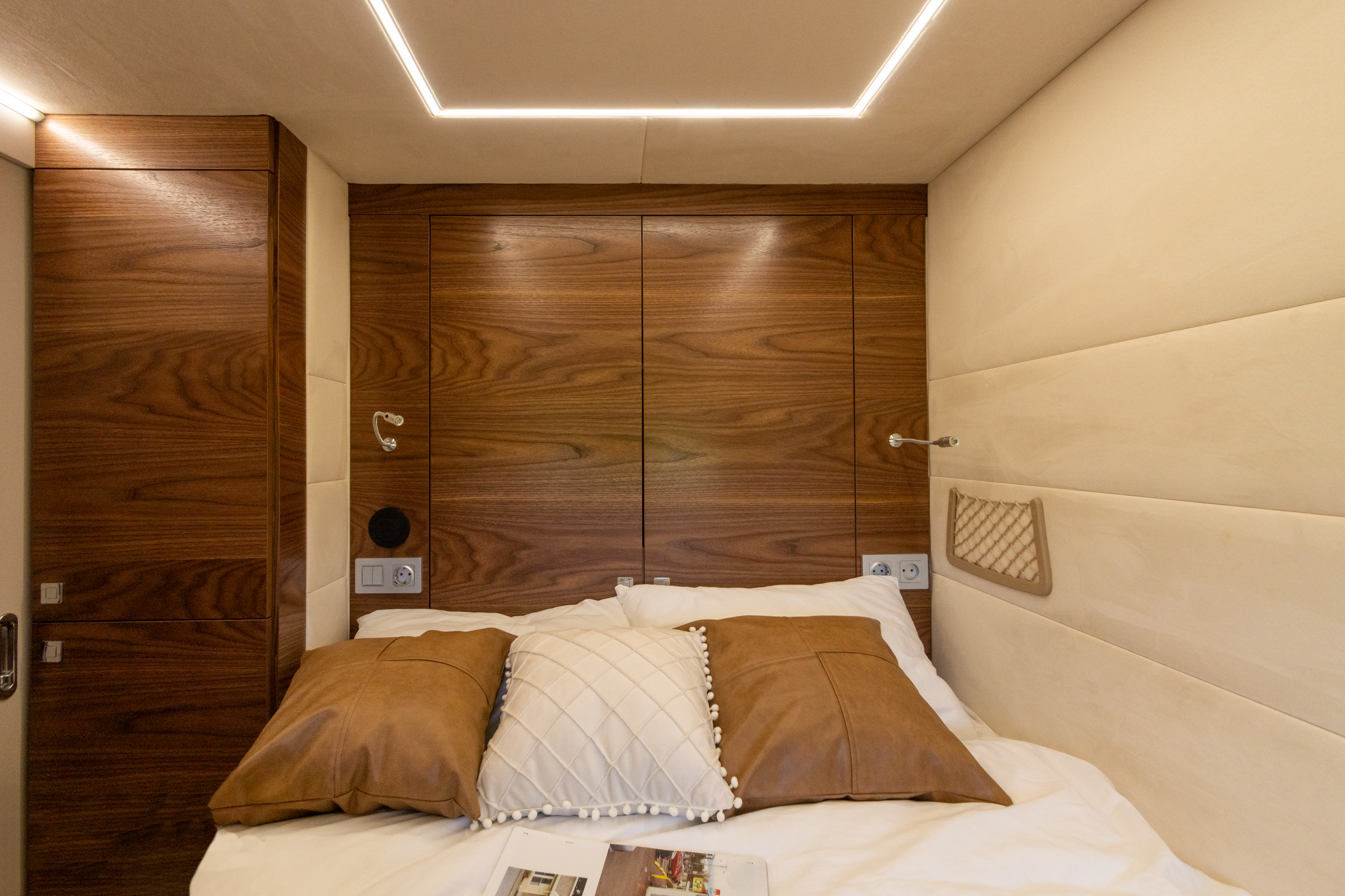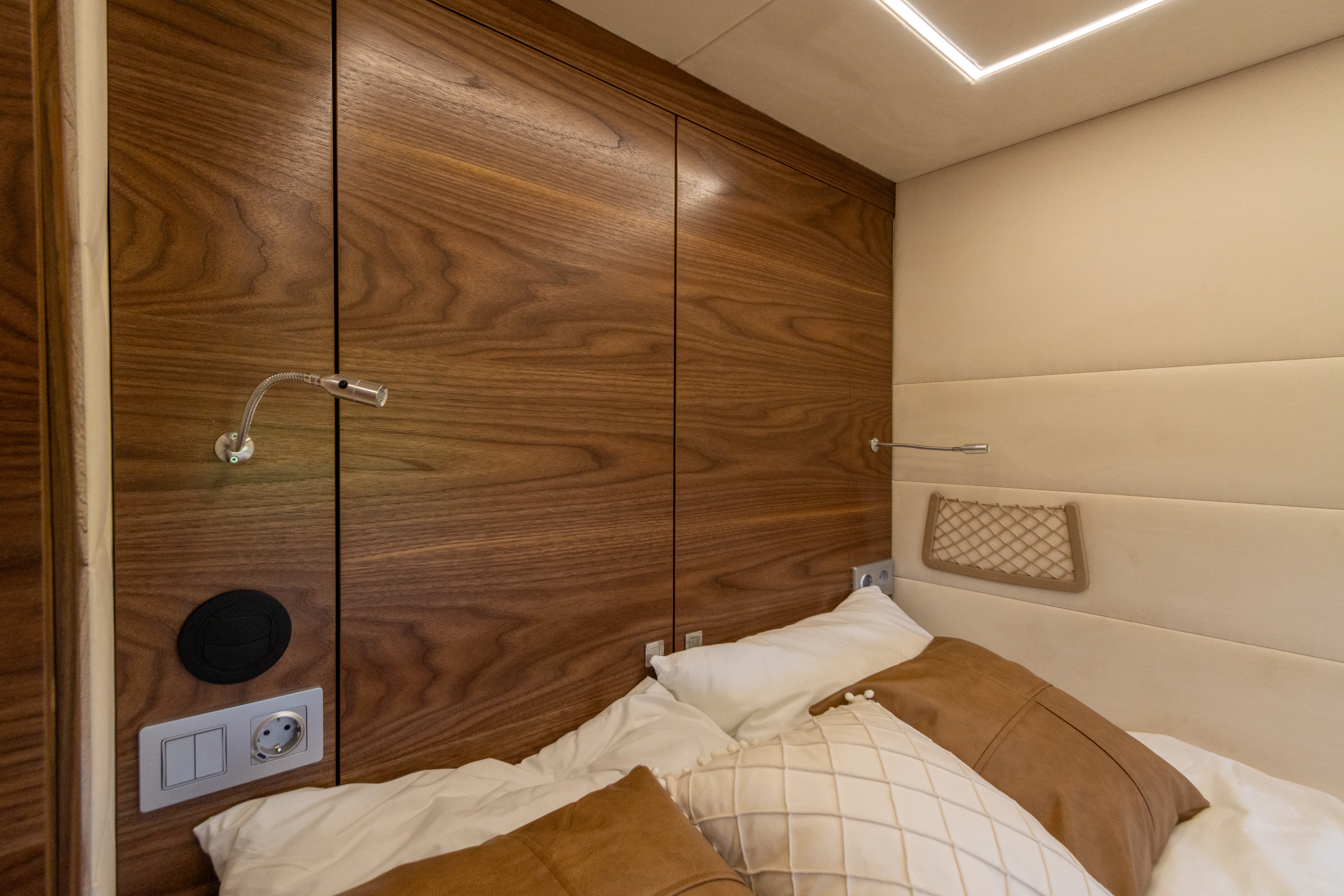 • Проектирование и изготовление задней консоли фигурной формы над спальным местом из фанеры со встроенными плафонами освещения, нишами для хранения и местами для установки динамиков.