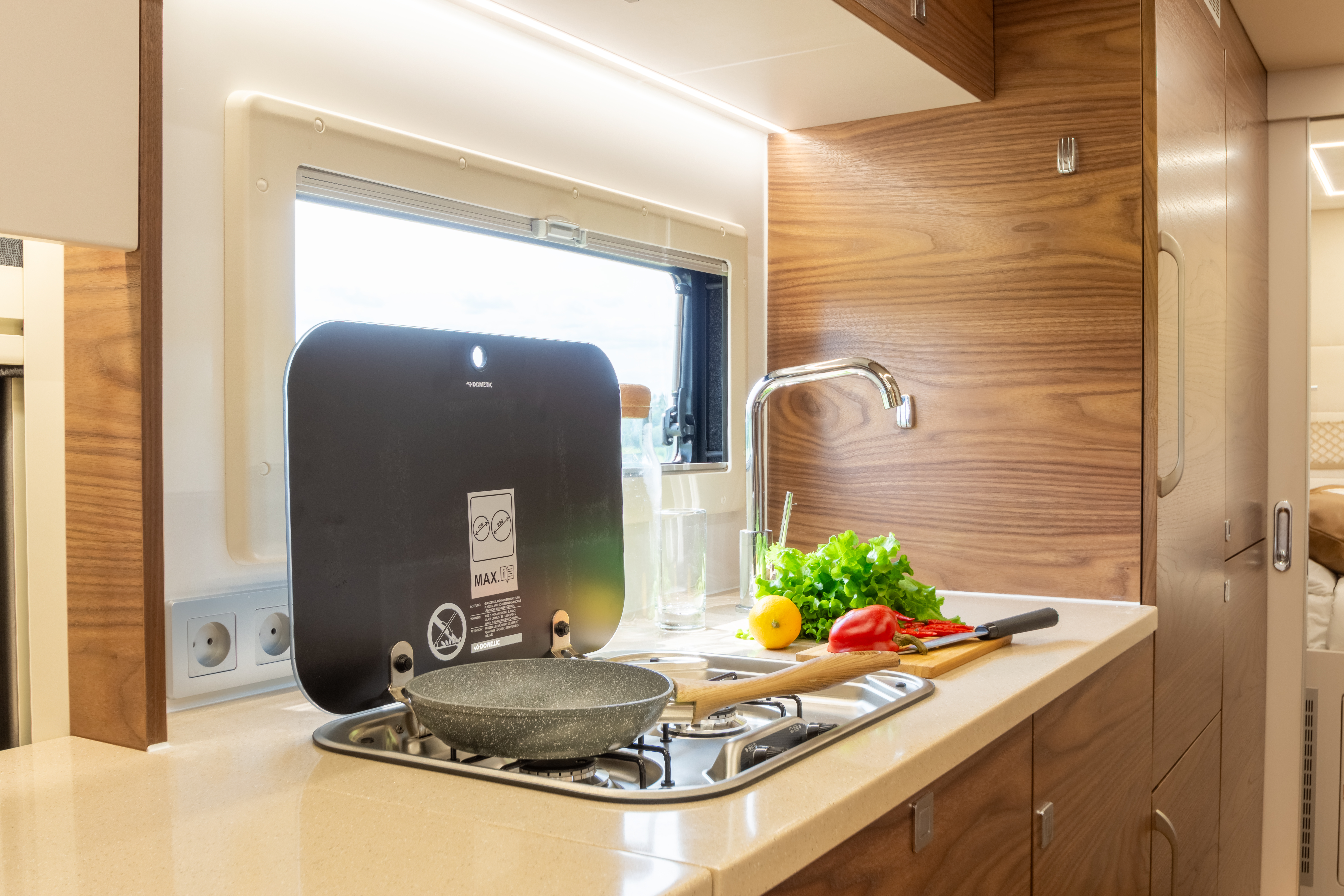 • Окно открывающееся откидное Dometic S4 со встроенной шторкой и москитной сеткой 900x400мм (в районе кухонного отсека)