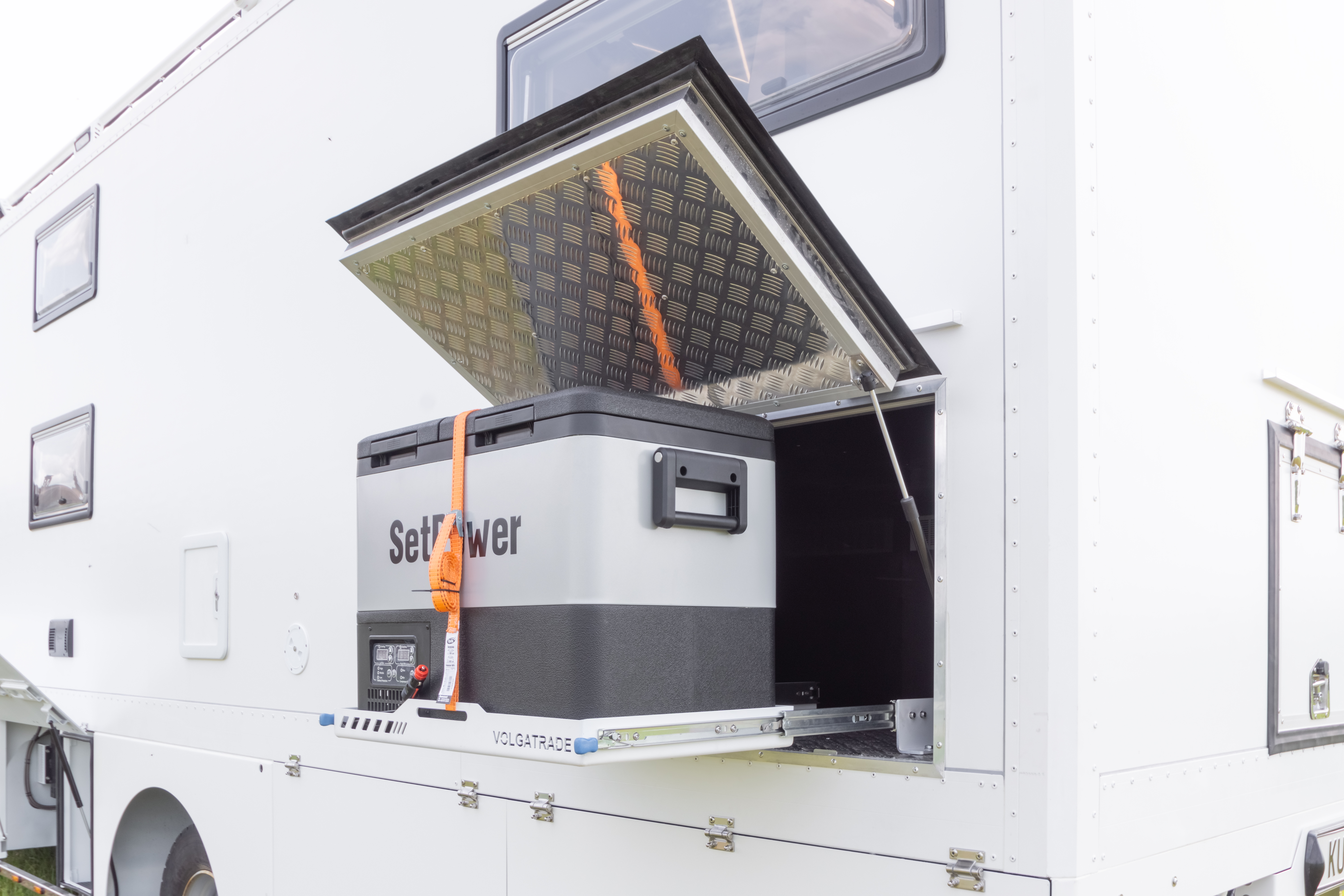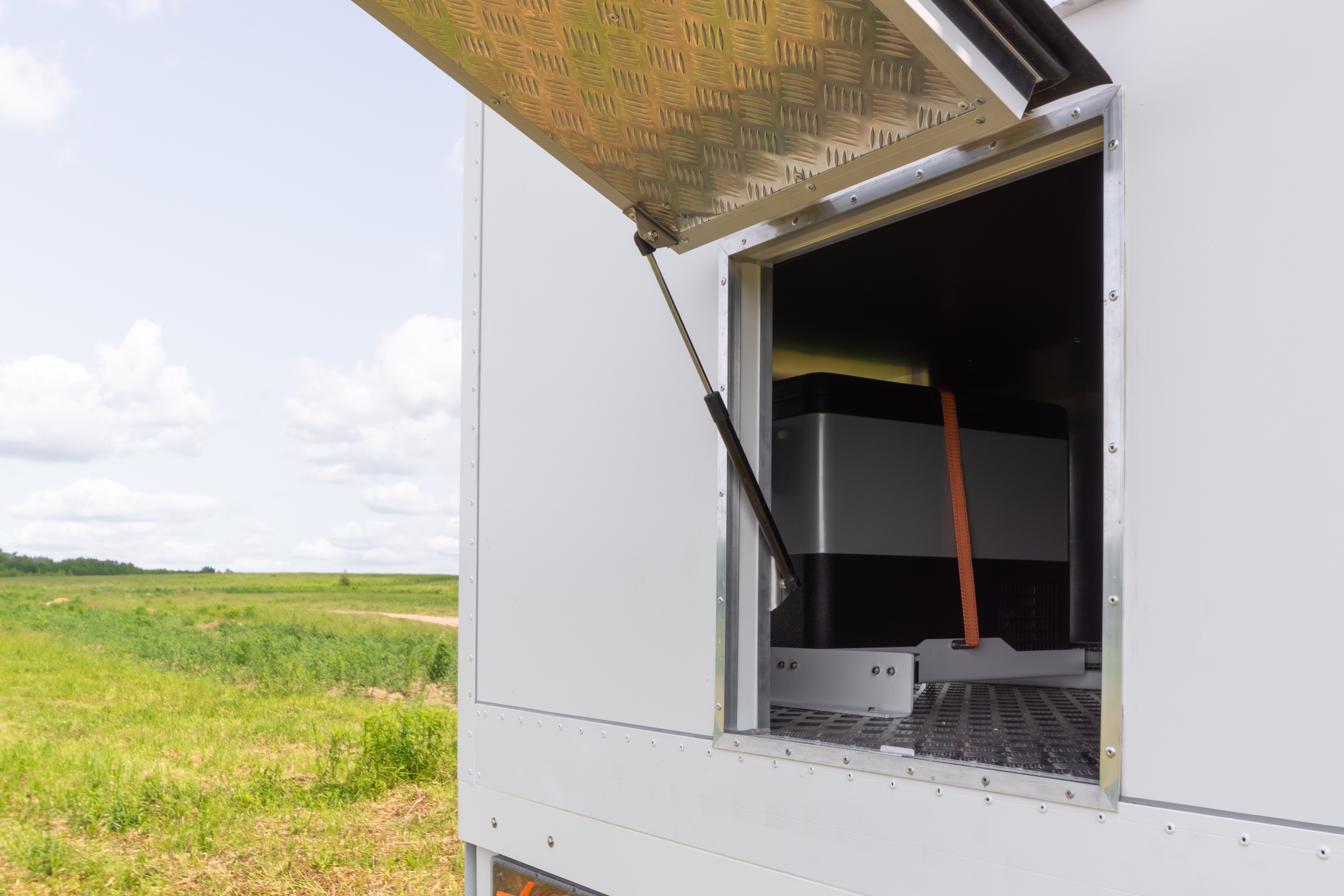 • Выдвижная платформа на силовых телескопических направляющих для транспортировки и эксплуатации переносной морозильной камеры. Установлена в заднем багажном ящике с водительской стороны