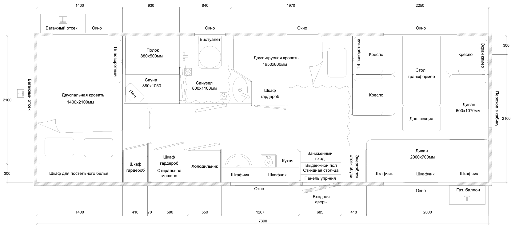 • Отсек под кроватью с доступом из салона