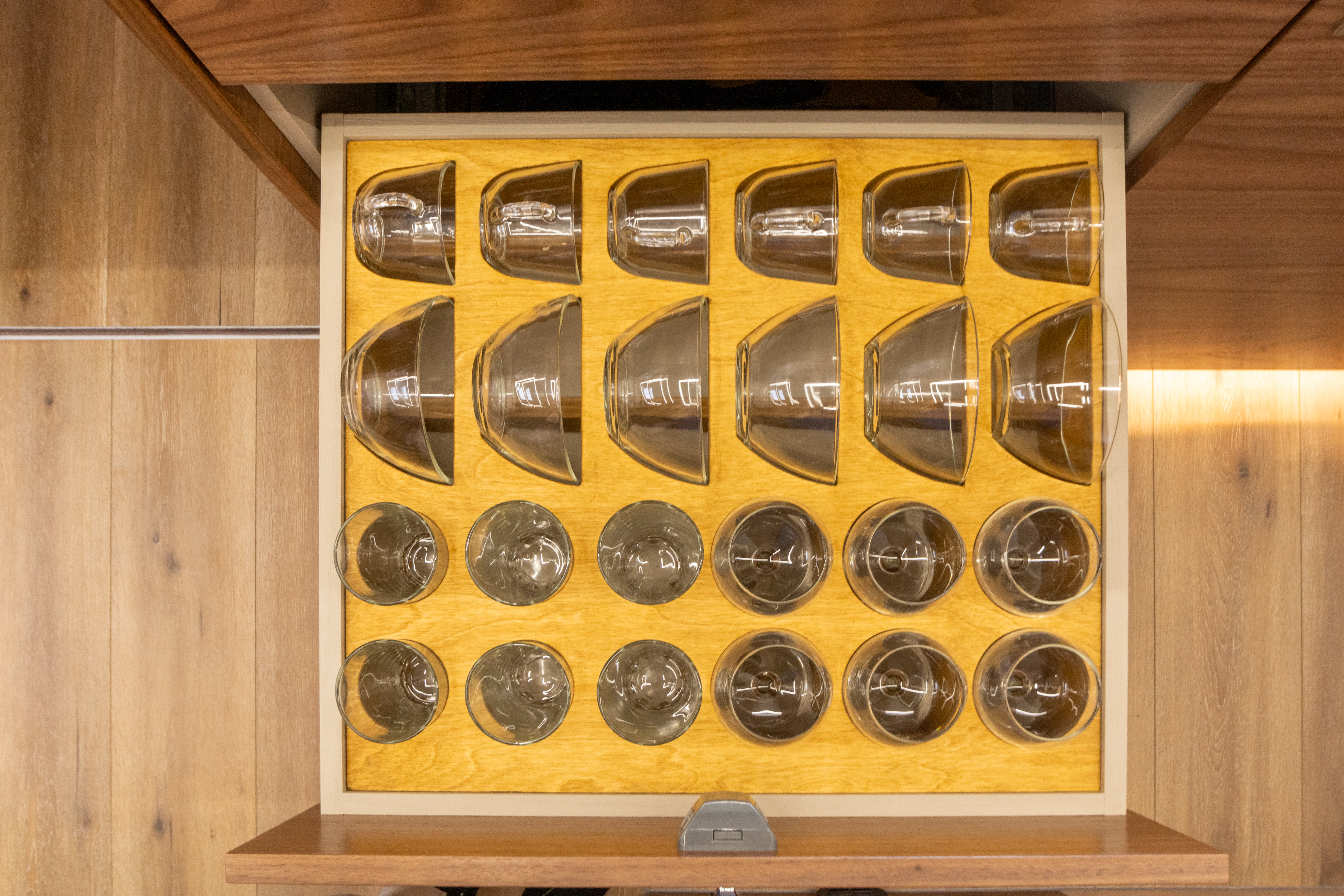 • Набор посуды на 6 человек с креплением в транспортном положении (салатница, тарелки суповые, тарелки столовые, пиалы, кружки чайные, фужеры, стаканы, стопки, столовые приборы)