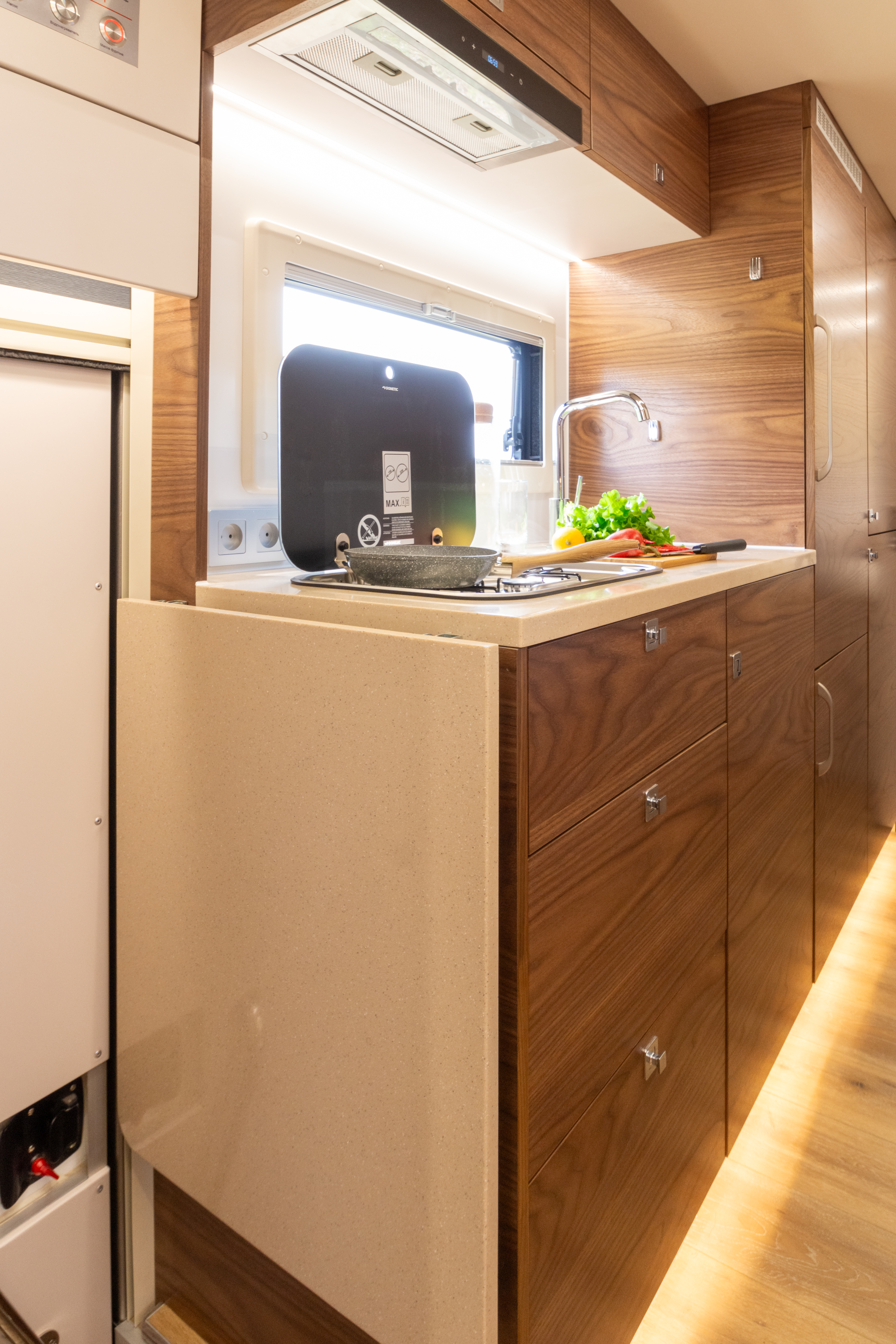 • Дополнительная откидная секция столешницы из иск. камня в проход с фиксацией в транспортном и рабочем положениях