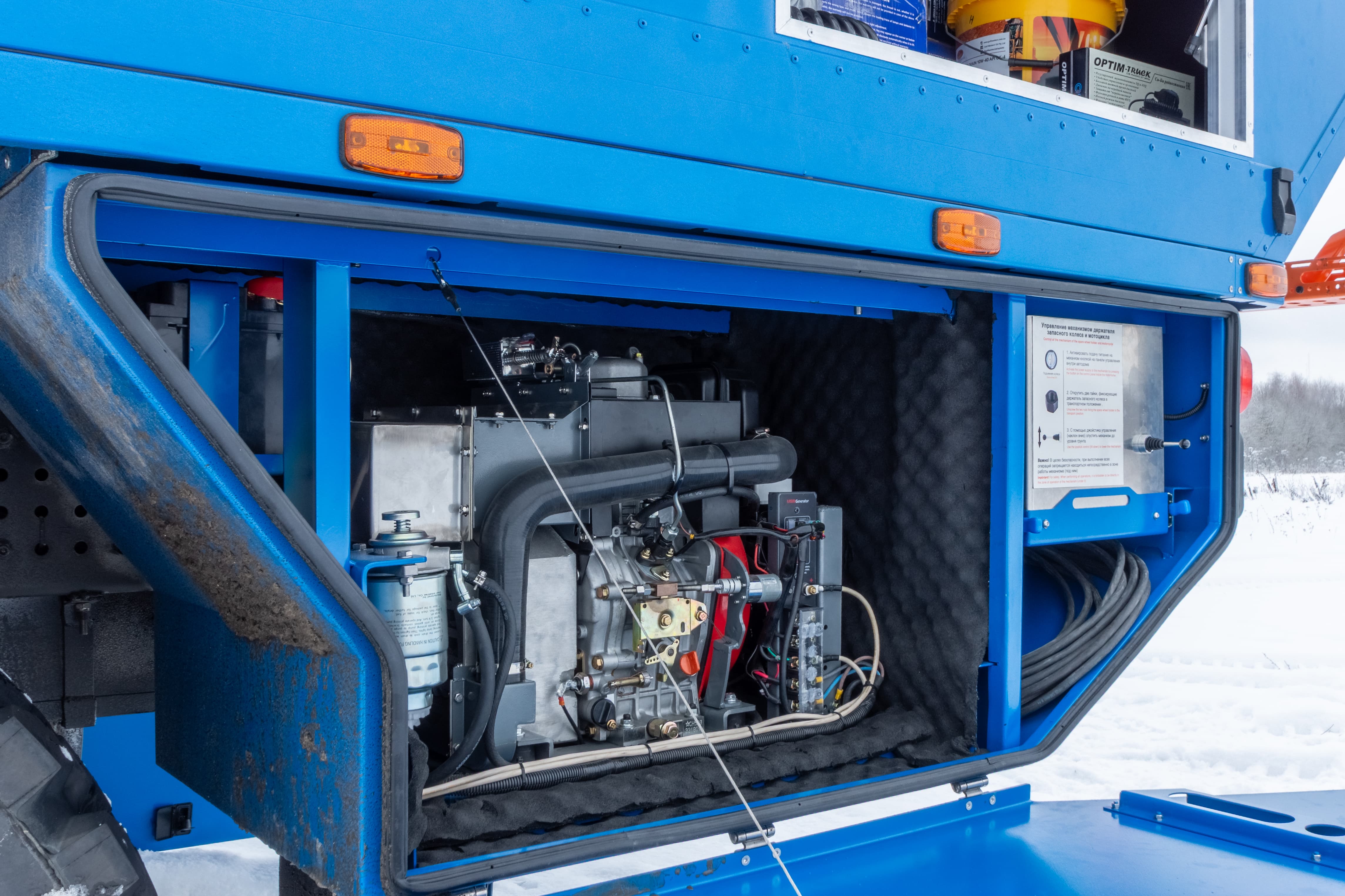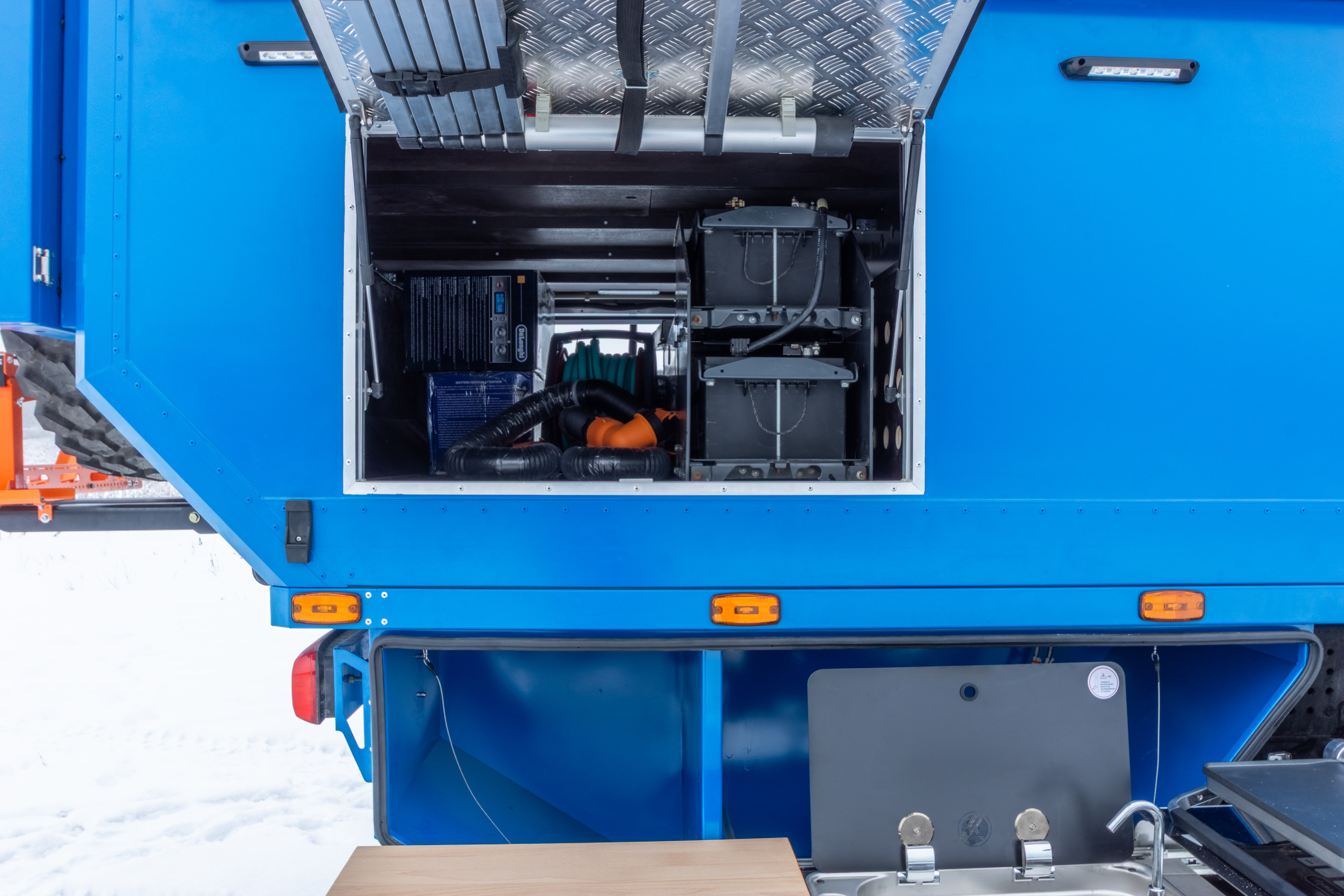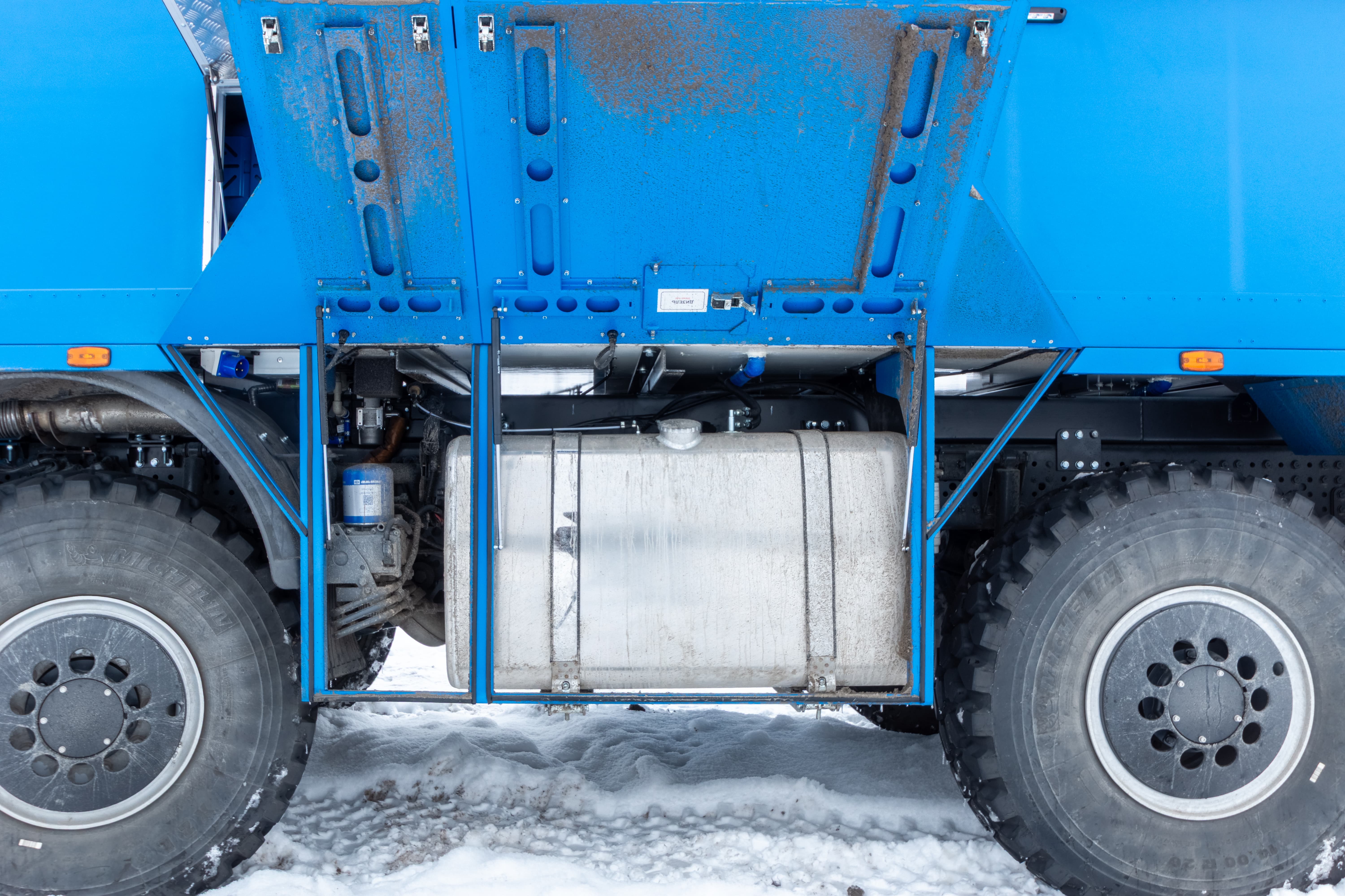 • Дополнительный бак для чистой воды размещен между кабиной и кунгом объемом 500 л.
