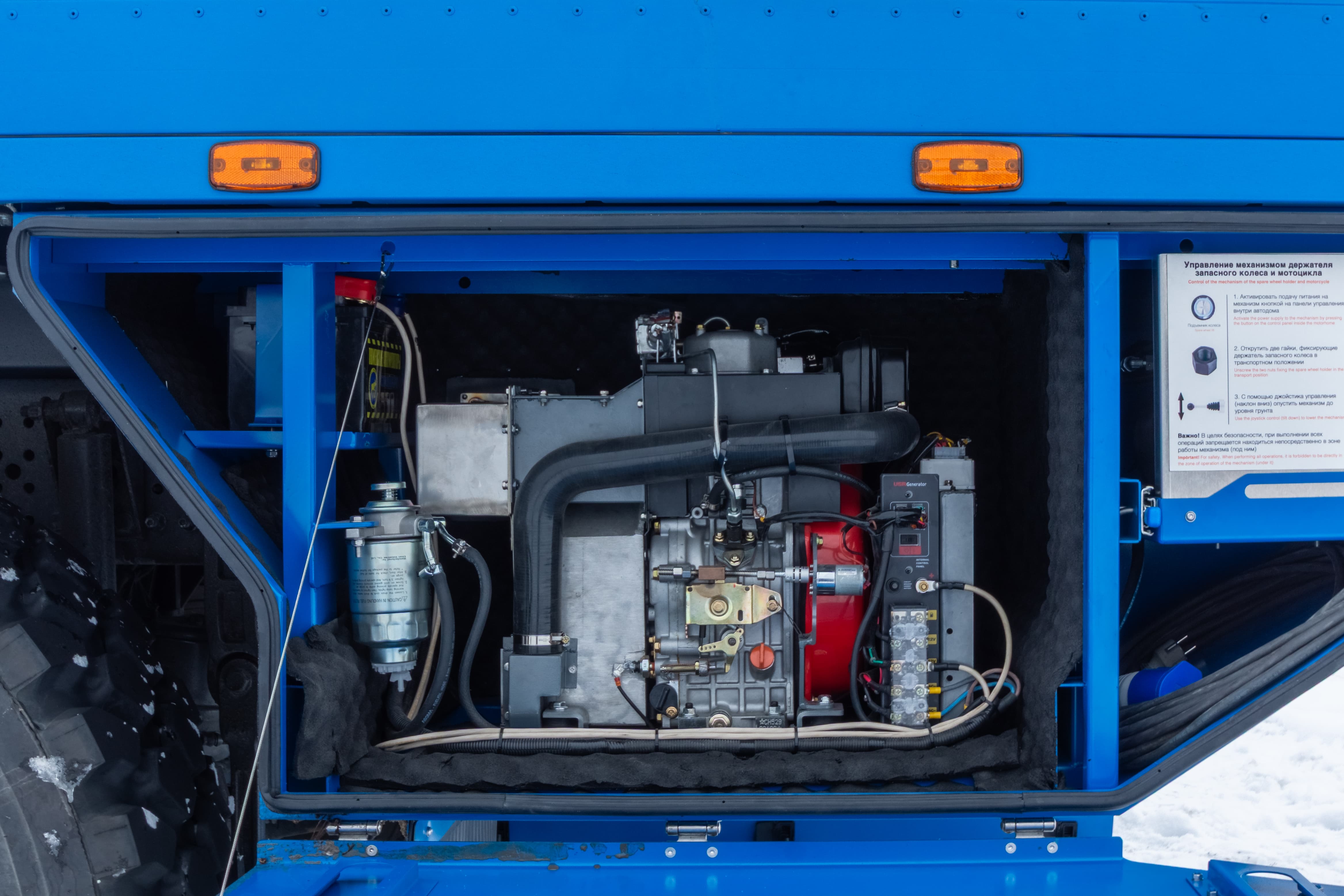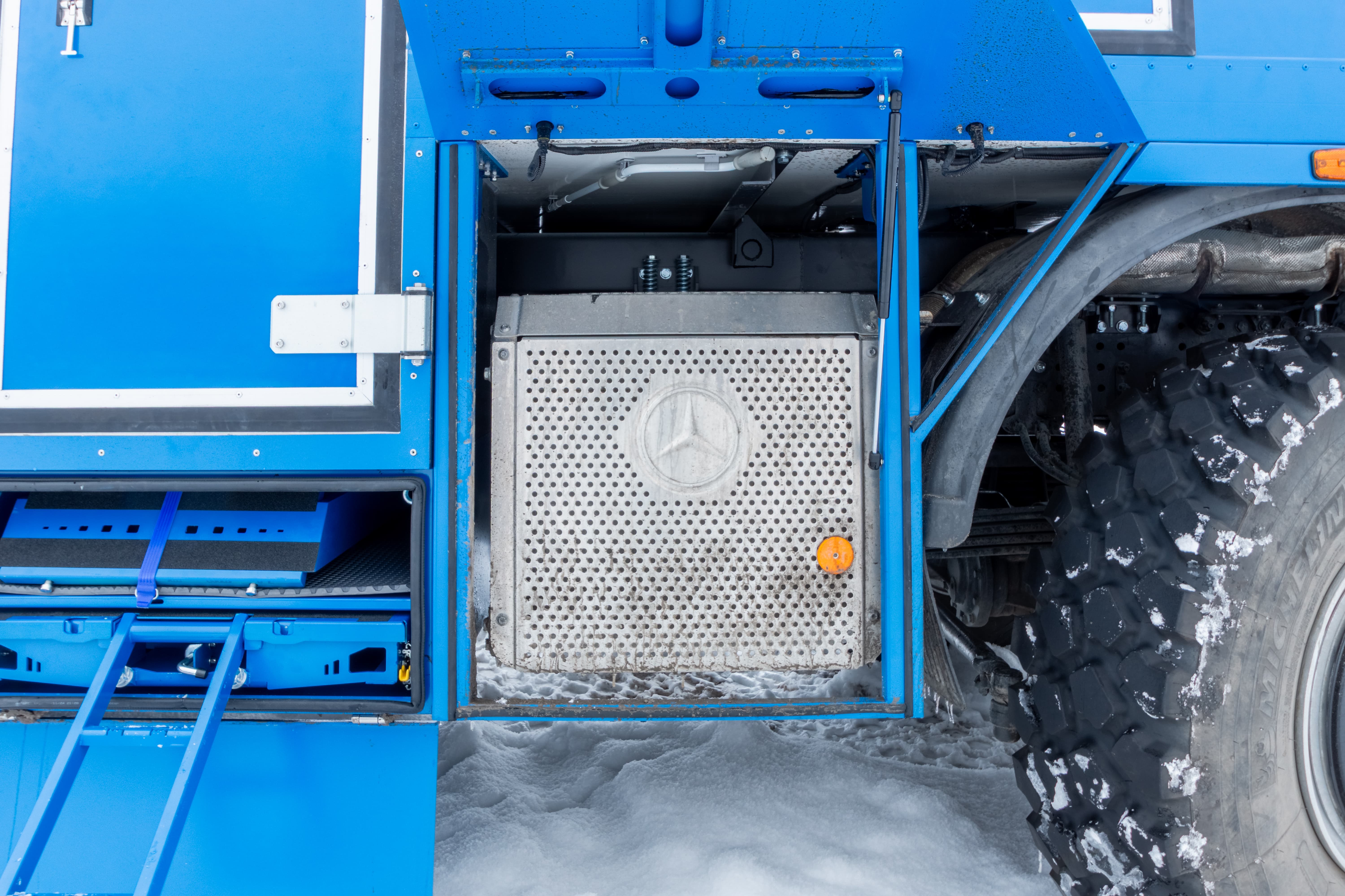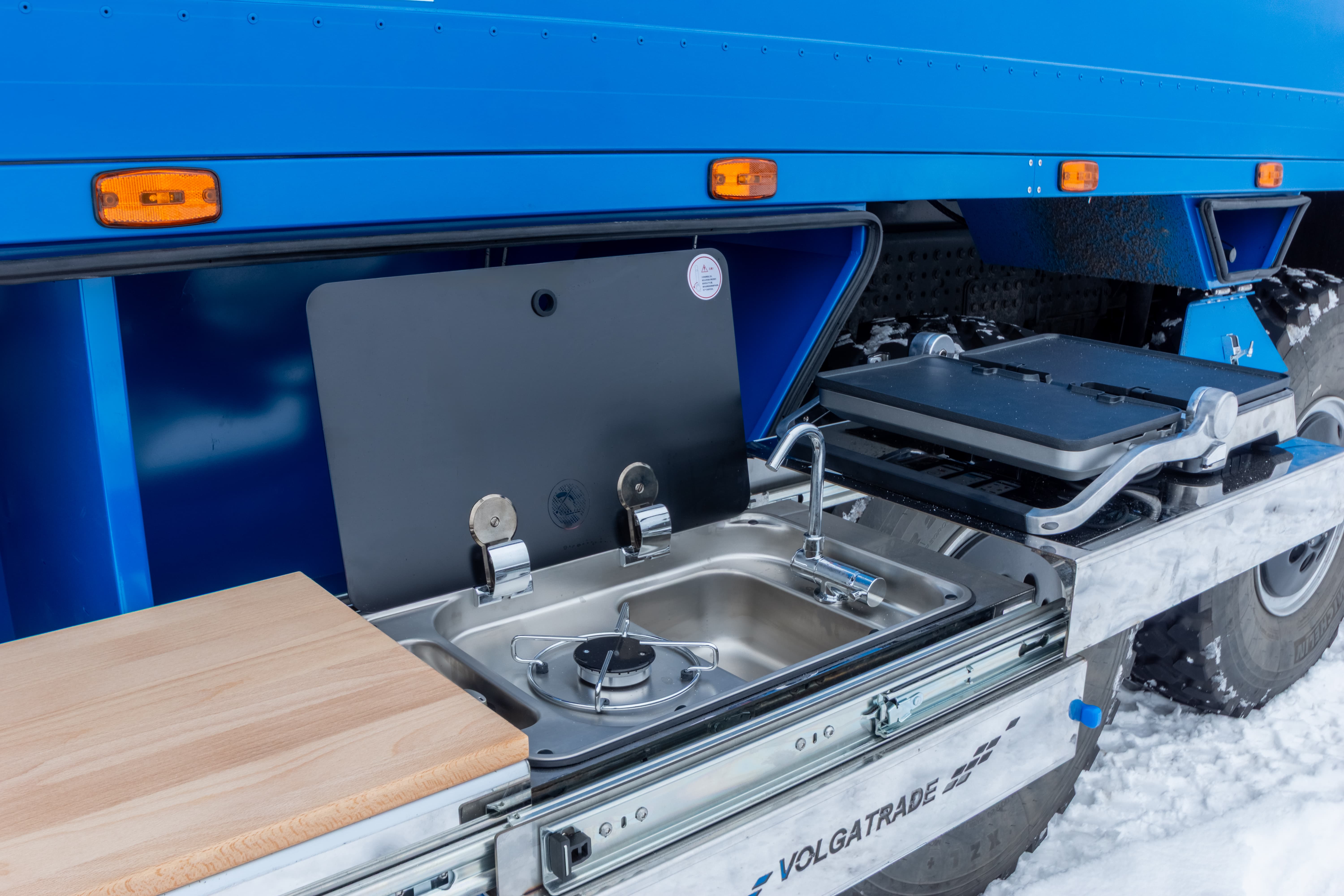 • Дополнительный бак для чистой воды размещен между кабиной и кунгом объемом 500 л.