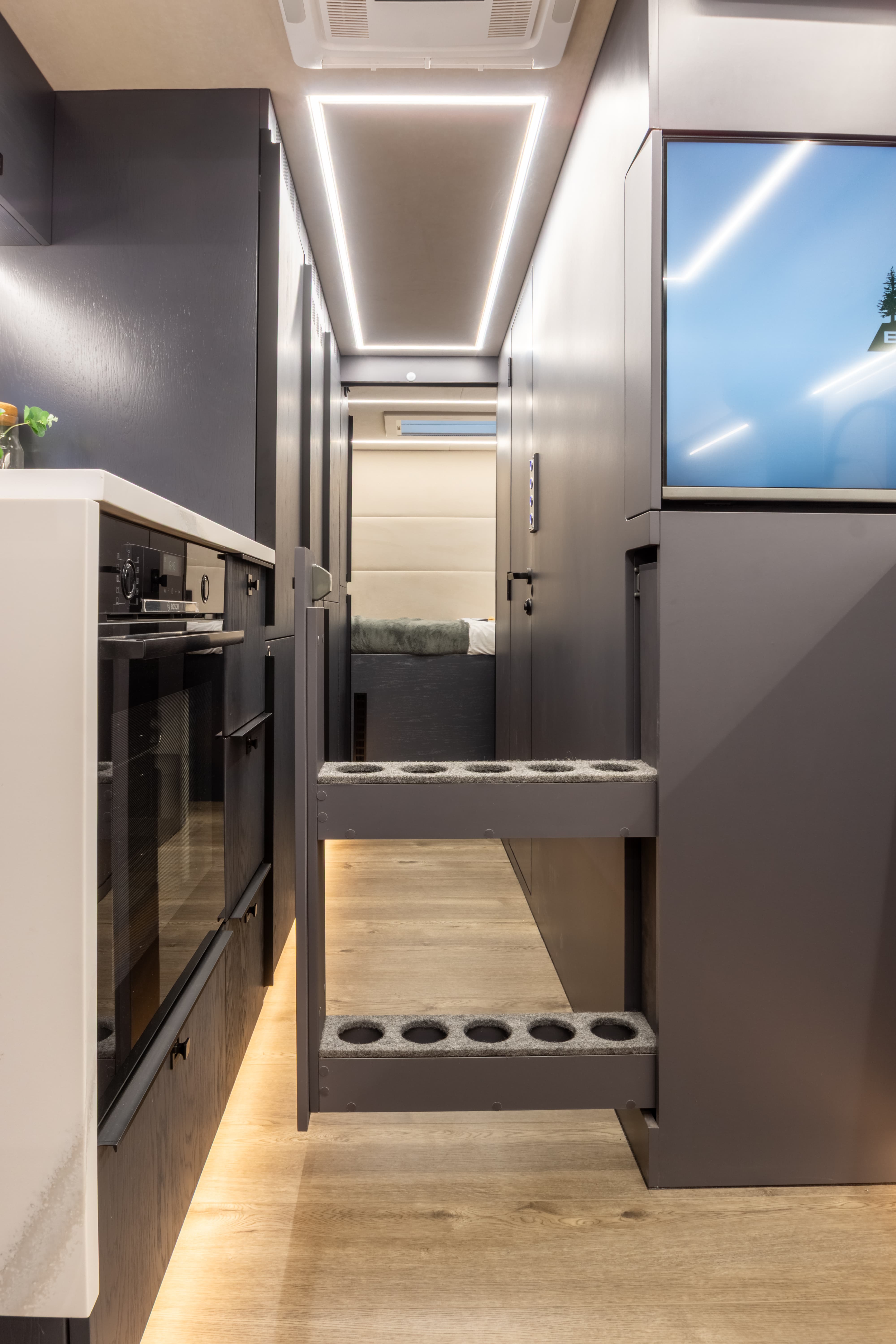 • Выдвижная платформа для хранения под выдвижным телевизором с фиксацией бутылок в траспортном положении
