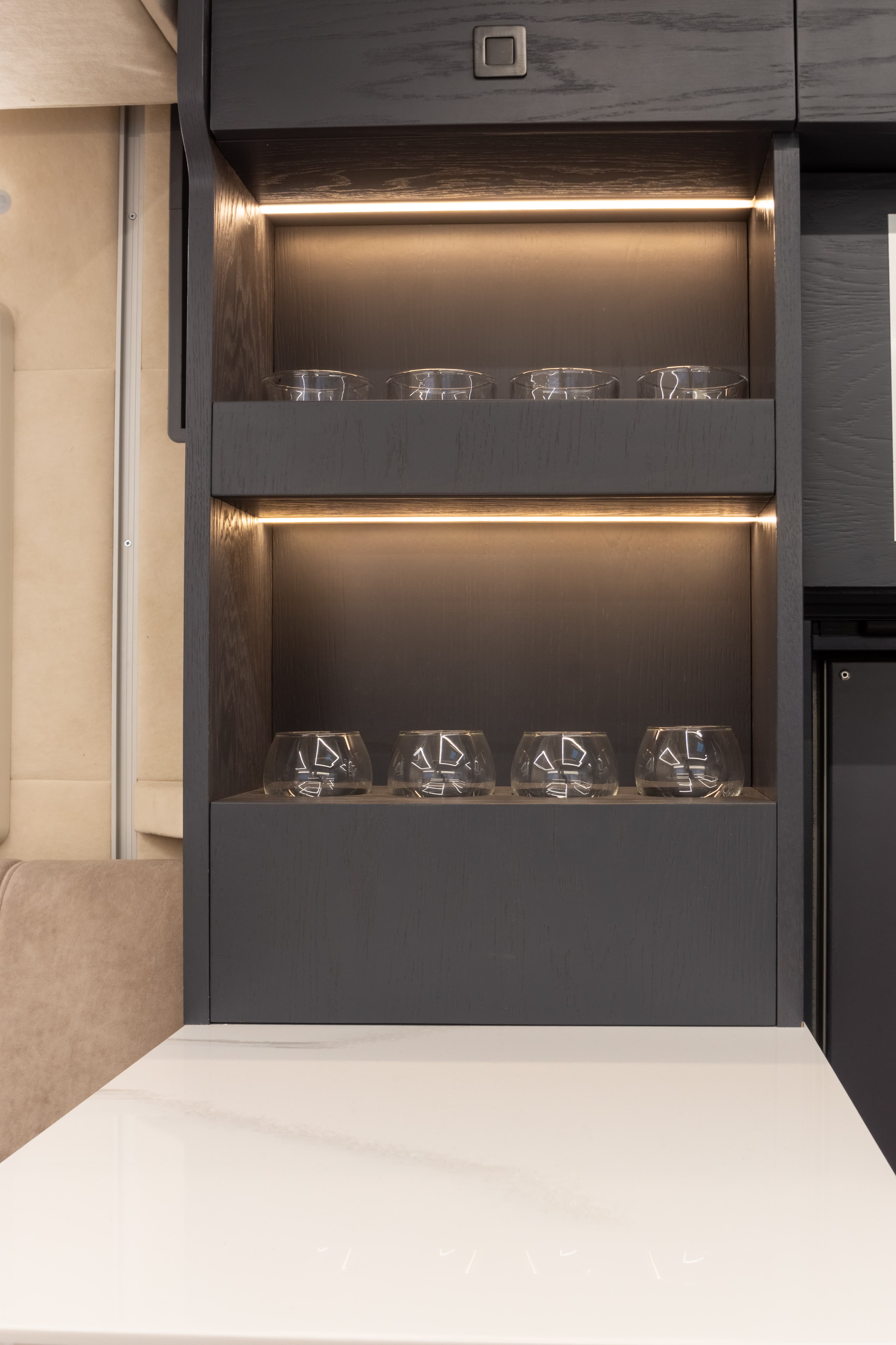 • Открытые полки с фиксацией бокалов в транспортном положении