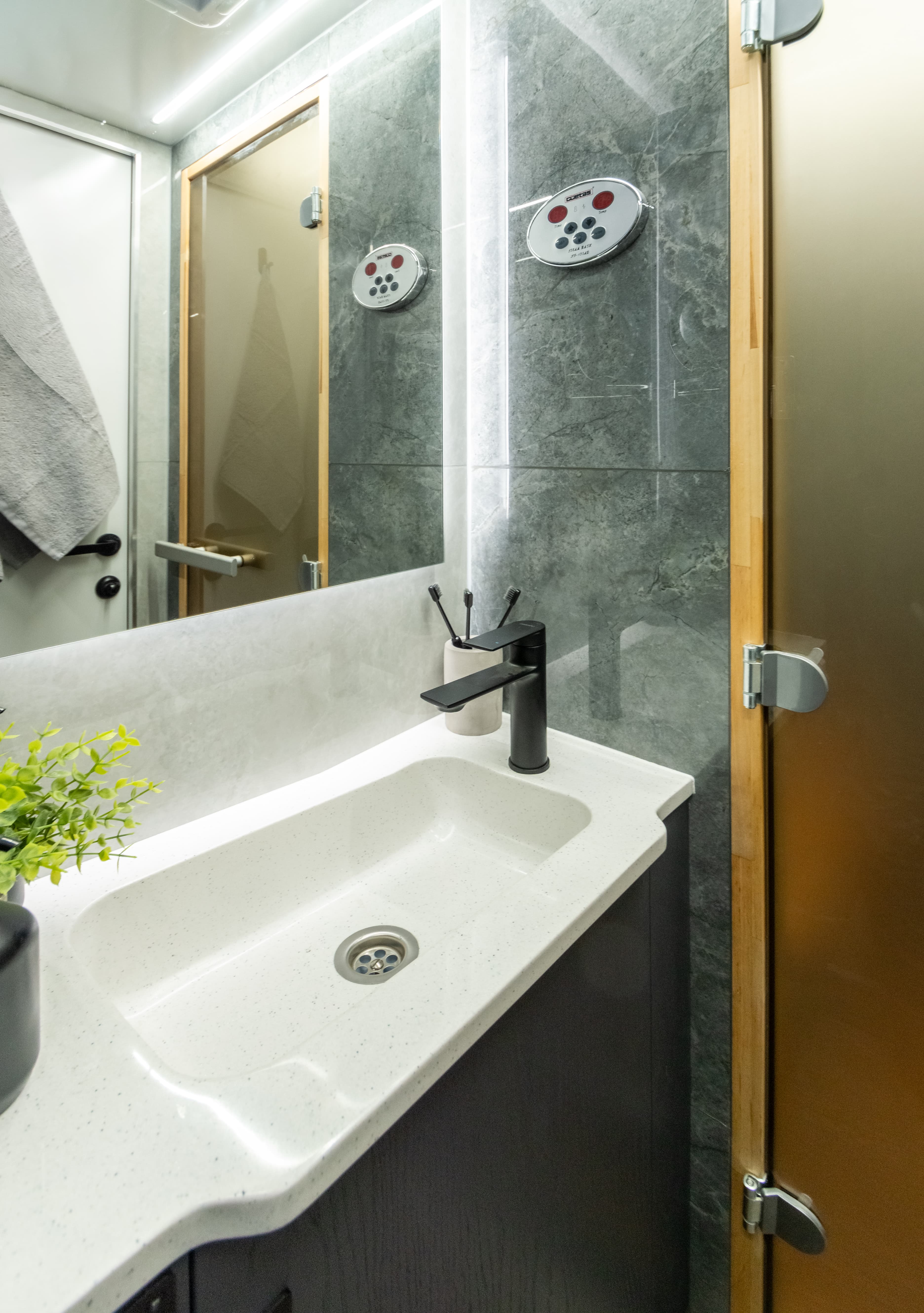 • Летний душ снаружи фургона. Лючок с кранами и душевой лейкой